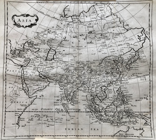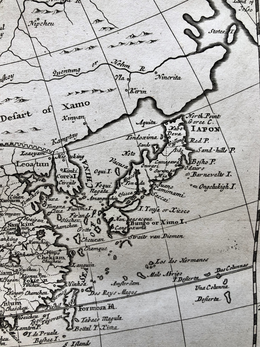 本図は、基本的な書誌情報が何一つ記載されていないため、地図作成者や年代についての正確な情報を得ることが困難なアジア図です。収録されていた文献については、ヘイリン(Peter Heylyn, 1600 - 1662)による『コスモグラフィー(Cosmography in four books...1703)』第7版ではないかと思われます。ヘイリンの『コスモグラフィー』にはヨーロッパ、アフリカ、アジア、アメリカを描いた4枚の地図が収録されており、そのうちの1枚であるアジア図が本図と推察されます。しかし、『コスモグラフィー』は17世紀中からヘイリン死後も繰り返し改訂版が出されており、収録されている地図にも版による相違が確認できます。本図と同じ形態を持つアジア図が登場するのは、1703年に刊行された第7版であることから、本図はこの書物から抜き出されたものと思われます。 ヘイリン死後の1703年に刊行された第7版で初めて登場する地図ですので、その製作者はヘイリンであることはあり得ません。しかし、上述のように作成についての情報が一切記されていないため、正確な作成者を特定することは困難なようです。同時代の出版人、特に地図を収録した出版物で著名なモーデン(Robert Morden, ? - 1703)とも言われていますが、むしろモル(Herman Moll, 1681 - 1732)によるものではないかとも思われます。いずれにせよ、モーデンとモルによる日本図はどちらもいわゆるマルティーニ・モレイラ型と呼ばれる形状の日本図を描いており、本図でも確かにマルティーニ・モレイラ型の系統に属する日本の輪郭を見ることができます。 しかし、本図において特徴的なのは、現在の北海道にあたる地域の描き方で、これはモーデン、モルによる日本図とは全く異なるものです。北海道にあたる地域にはユーラシア大陸がせり出してきており、その北東に「オランダ東インド会社の島(States I.)が配置され、そのさらに北東、アラスカに近い地域に「蝦夷島(Island of Jeso)」が描かれています。この地域はその正確な地理情報の獲得が世界中でも最も遅れていた地域の一つですので、18世紀初頭にヨーロッパで作成された地図には様々な混乱を含んだ描き方が見られますが、本図のような描かれ方については、少なくとも店主は他に類例を見たことがありません。また、アジア図中の一部に日本が描かれている地図にしては、各都市についての情報が非常に豊富な点も特筆すべき点といえます。琵琶湖と淀川が直結して細長い湾のように描かれるなど、当時の典型的な誤りが見られるものの、京都(都、Meaco)、大坂(Osacca)、堺(Saccai)といった各都市の相対的な位置関係は比較的正確に描かれています。また平戸島(Firando I.)や五島(Gotto)、長崎(Nangasacque)といったイエズス会士によって早くから知られていた九州各地の情報もかなり正確なものと思われます。 本図は、独立した日本図でないこと、またアジア図としてさえも、その希少性からかこれまであまり顧みられることがなかったものと思われますが、その特徴的な日本や北方海域の描き方については、ヨーロッパにおける日本図の系譜においてもユニークな地位を占める重要なものではないかと推察されます。