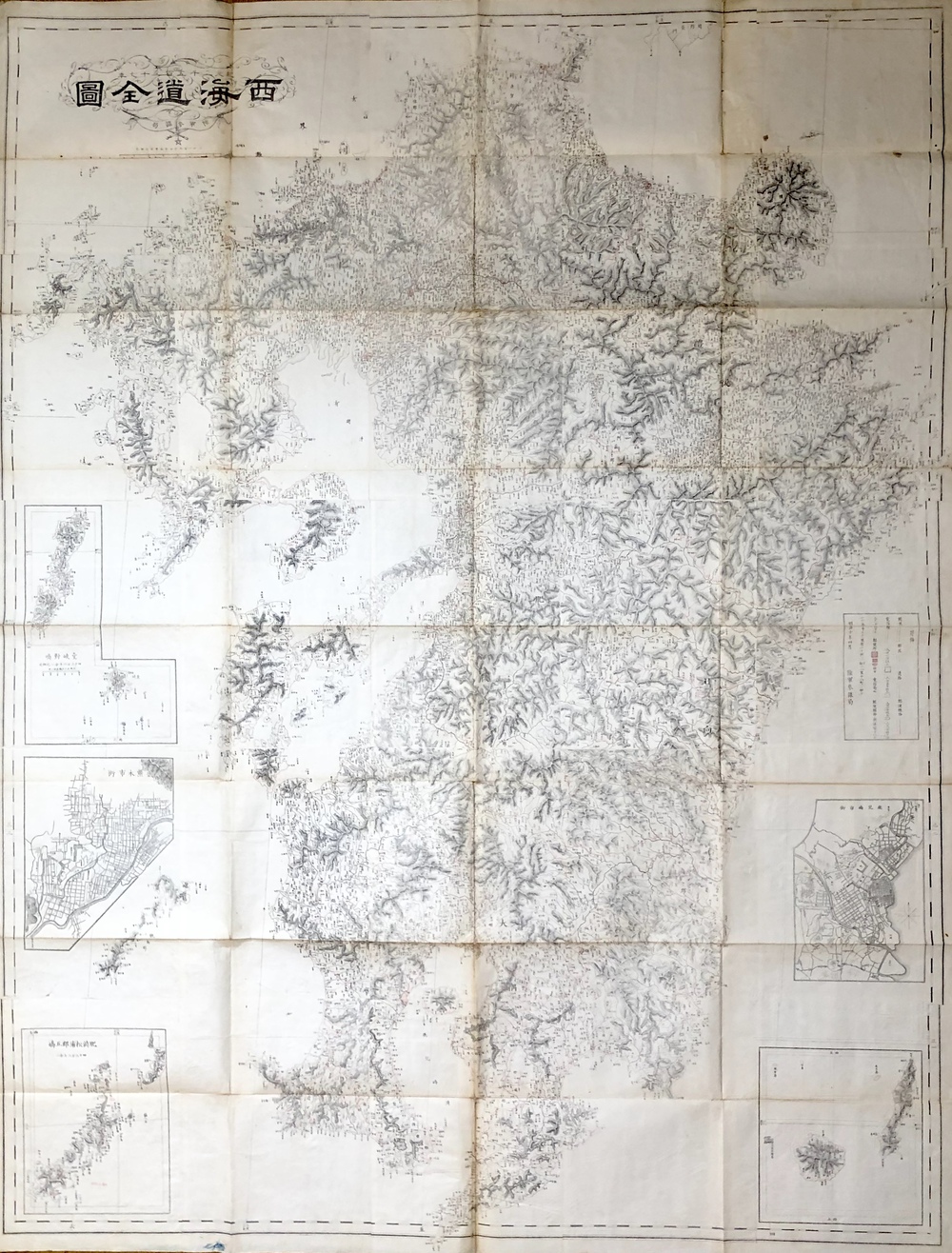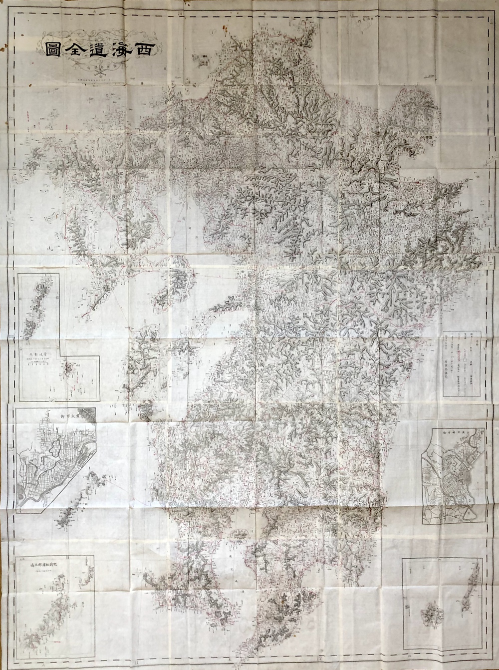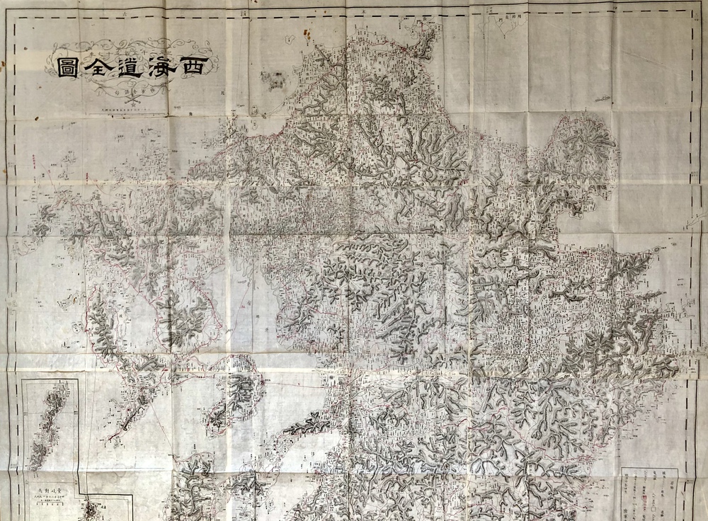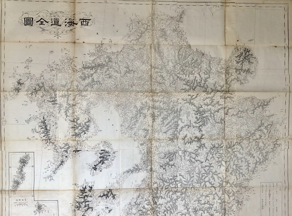 本図はその名が示す通り「西海道」すなわち、九州を描いた大型の地図で、伊能中図を元に国絵図で地名を補う形で作成された、1/216,000縮尺の地図です。1877年の西南戦争勃発を受けて、陸軍省参謀局において急遽作成されたという非常に興味深い政治的背景を有する地図で、同じように見える地図が2枚あるのは、石版刷と銅板刷という異なる印刷技法を用いて2種類が作成されていたことによります。石版刷と銅板刷の2種類の地図が存在するということは、軍用地図、海図、紙幣印刷といった明治初期の日本社会の多方面において極めて重要な役割を果たした印刷技術の発展史の足跡を物語っており、明治初期の官製印刷史の観点からも大変興味深いものです。