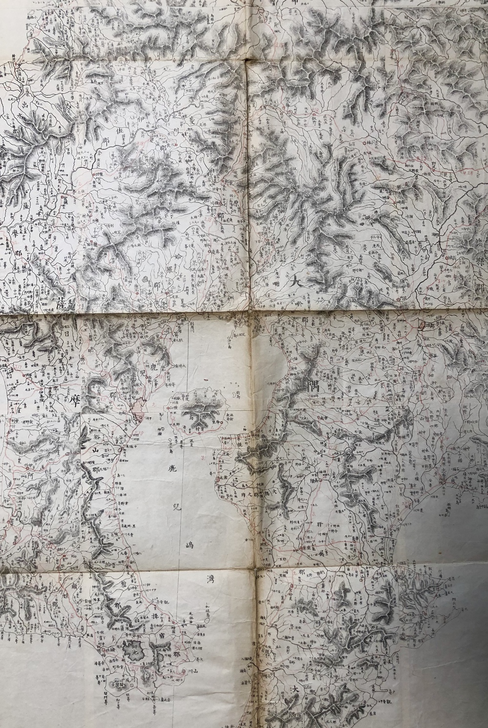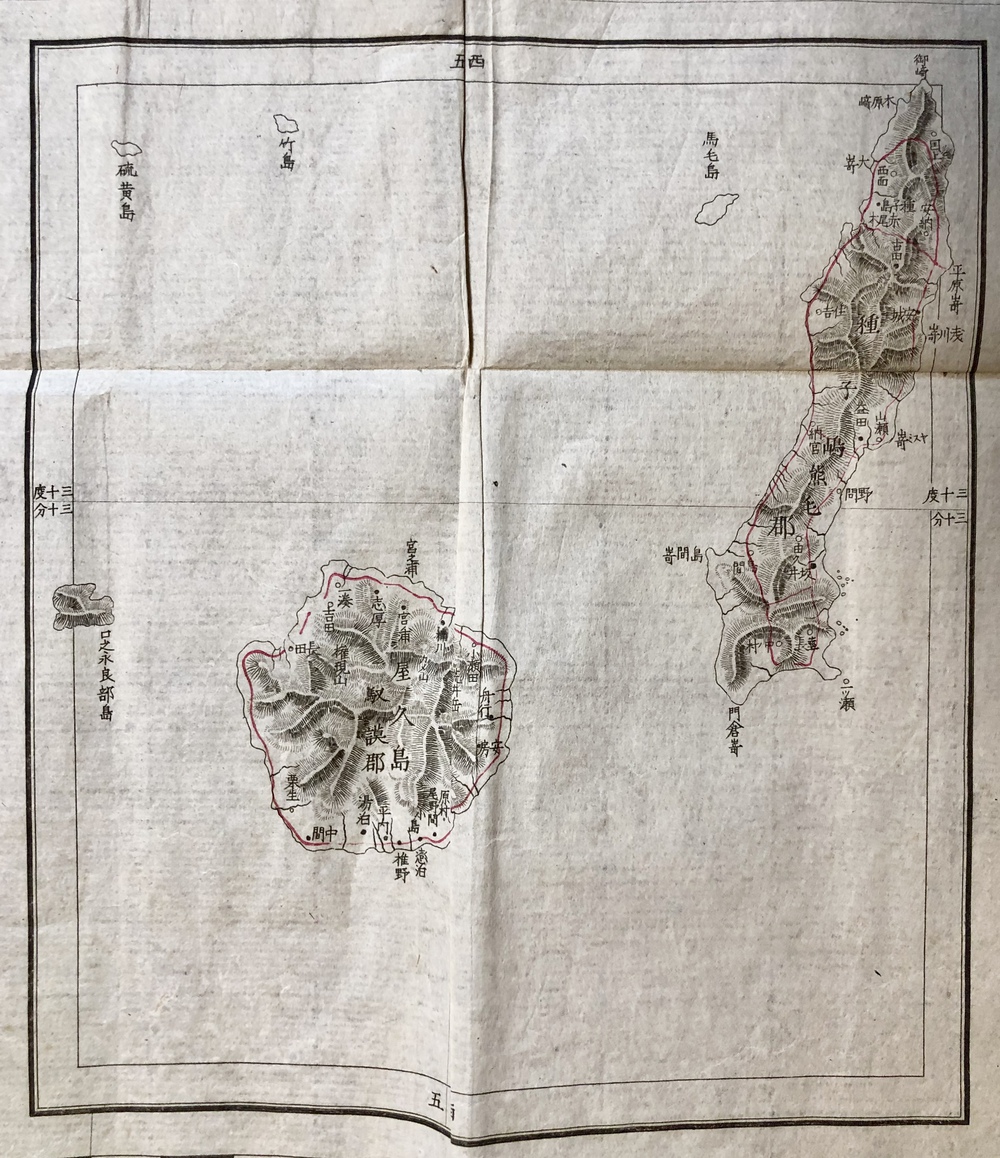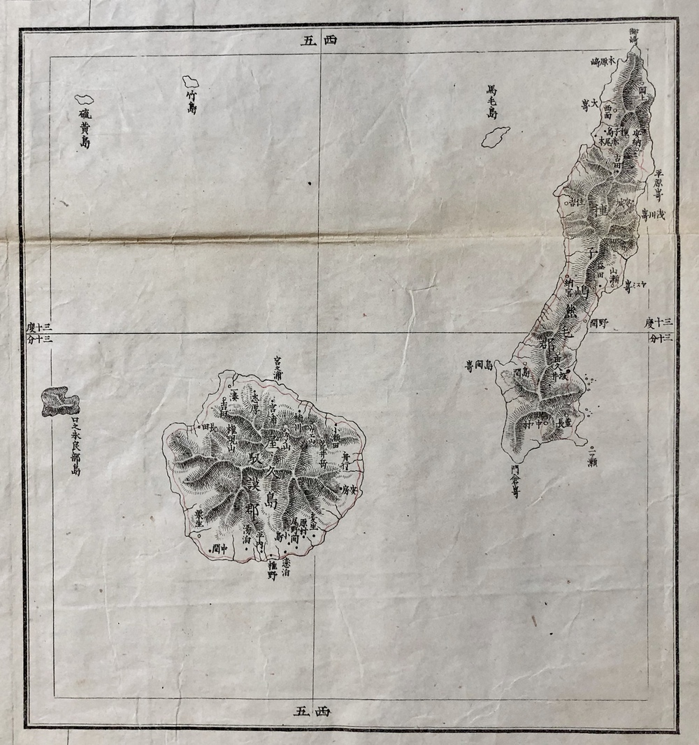 経度は京都零度を用い、九州図であっても中央部の子午線は右上より左下にむかって若干傾いておりこれも伊能の中図の特徴があらわれている」(同論文88頁)とされています。既存の地図資料を最大限に生かして火急の要請に応えようと苦心して作成された地図であることが伺え、同時期には「薩摩大隅日向三国図」や「鹿児島実測図」なども作成されています。