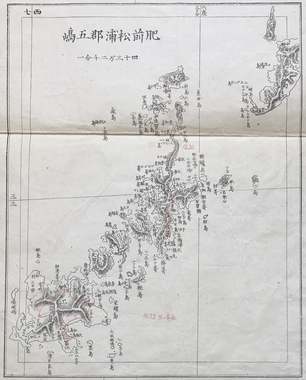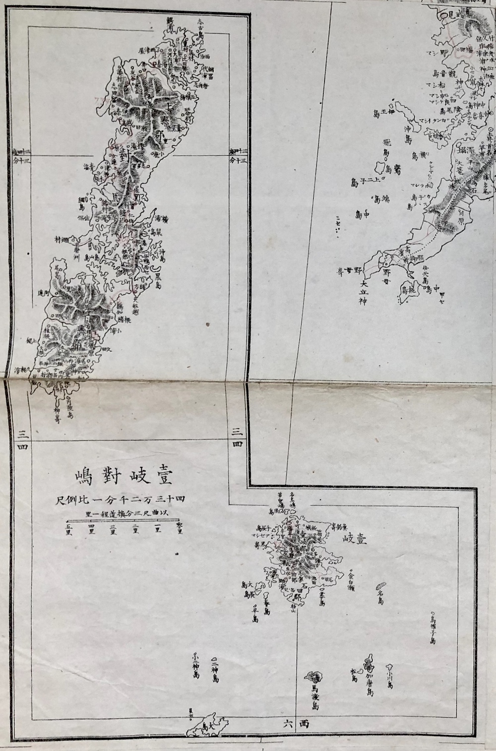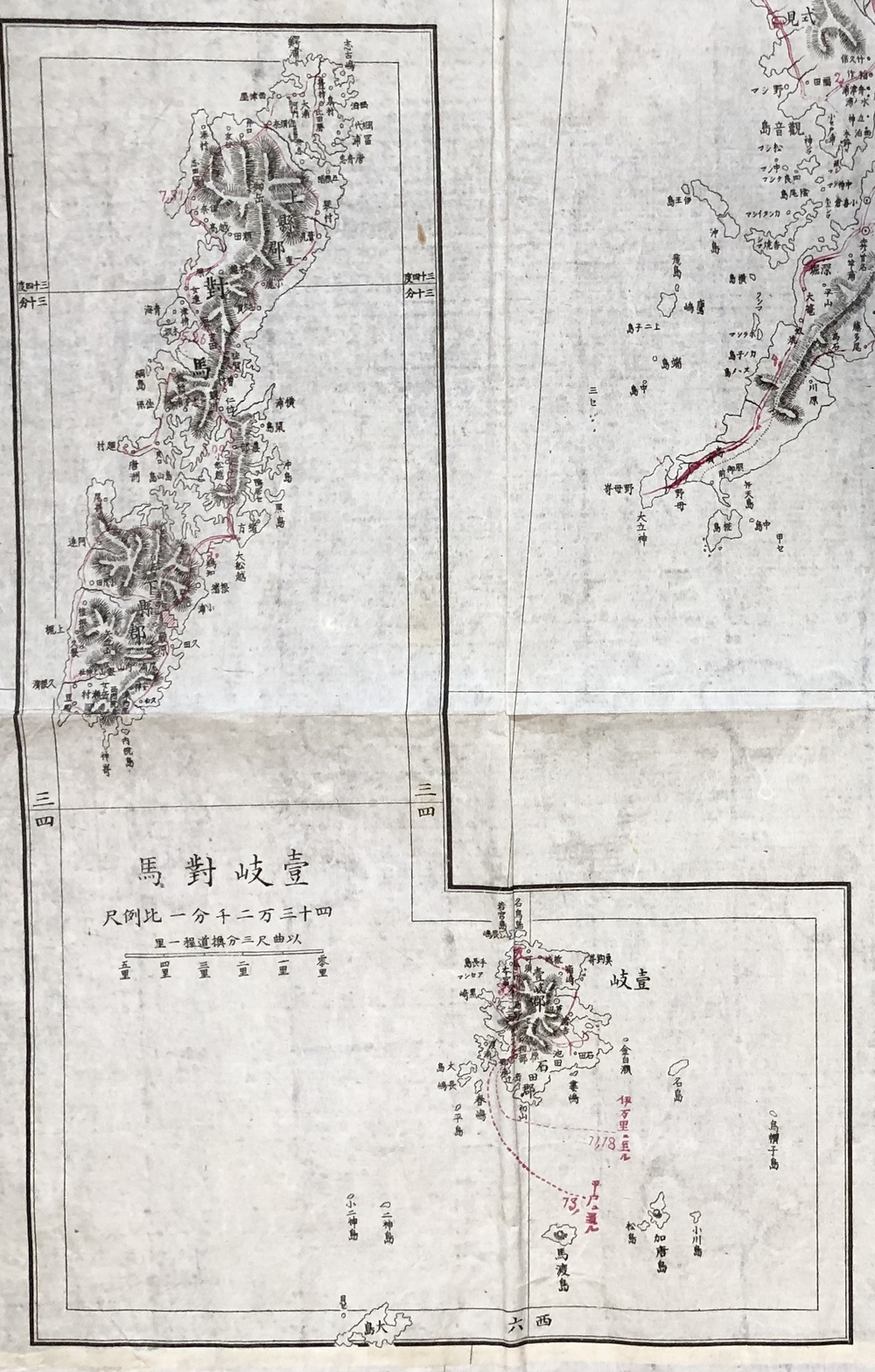 経度は京都零度を用い、九州図であっても中央部の子午線は右上より左下にむかって若干傾いておりこれも伊能の中図の特徴があらわれている」(同論文88頁)とされています。既存の地図資料を最大限に生かして火急の要請に応えようと苦心して作成された地図であることが伺え、同時期には「薩摩大隅日向三国図」や「鹿児島実測図」なども作成されています。