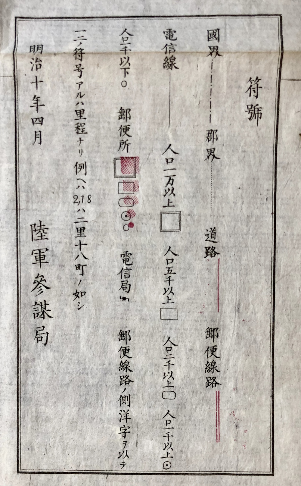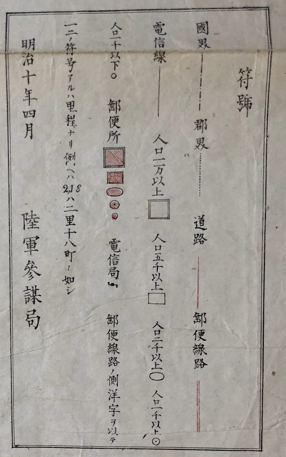 西南戦争の勃発に際して、何よりもその必要性が痛感されたのは、戦地となった九州の正確な地図でしたが、近代的な測量方法でもって作成された地図は当時まだ存在しておらず、急場を凌ぐために伊能中図を元に本図が作成されました。本図の特徴について調べた小論である清水靖夫氏の「明治十年西海道全図について」(日本地理学会『地図』第5号(2)、1967)によりますと、「(前略)骨子は伊能図から採り、道路・集落等は県あるいは幕府の国絵図などから採ったことが知れる。地形はケバで示されており、交通路は郵便(主要道路)と道路(普通道路)とに分け紅の2本あるいは1本の線で示し、これは凸版(木版)によって加刷され、道路に沿って紅文字で、里程が示され、収録は人口別にそれぞれ1000以下〜10000以上まで第2図(下掲写真参照)のように区分され、そのうち郵便所はその記号の中を紅の平行斜線を用いて区分している。他に電信局も示されている。