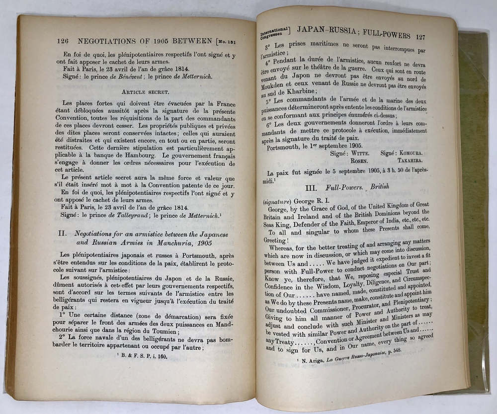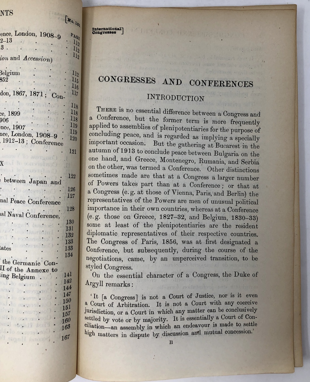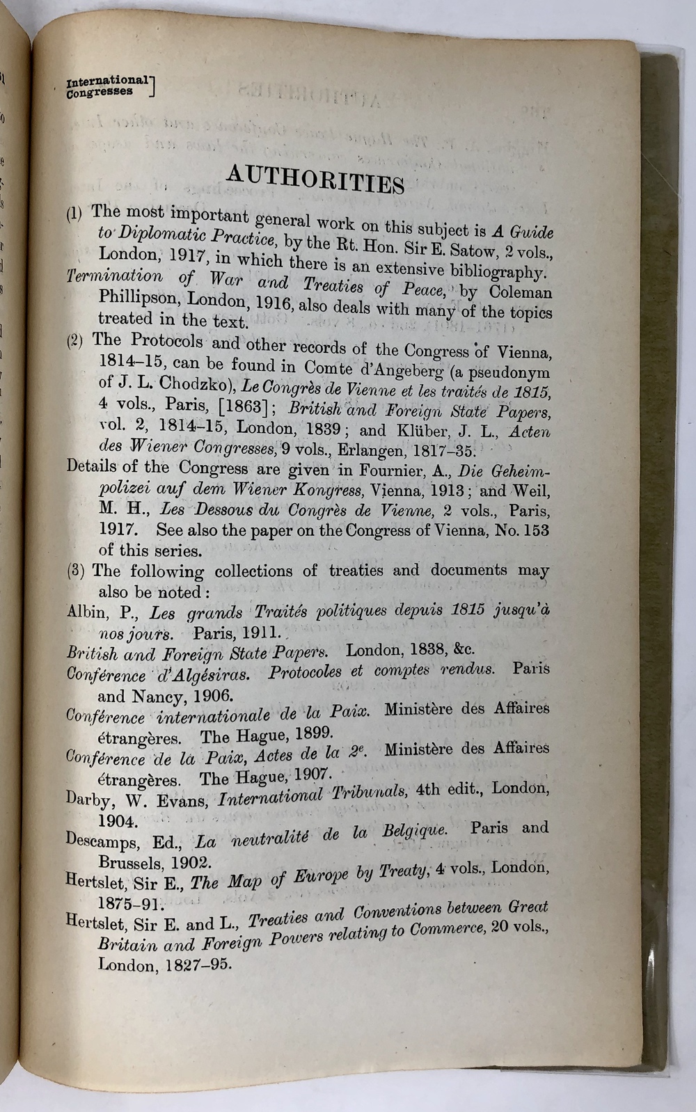 INTERNATIONAL CONGRESSES. (HANDBOOKS PREPARED UNDER THE DIRECTION OF THE HISTORICAL SECTION OF THE FOREIGN OFFICE. No.151) [together with] Autograph Letter to Wheeler Signed by Satow dated on January 8, 1908.