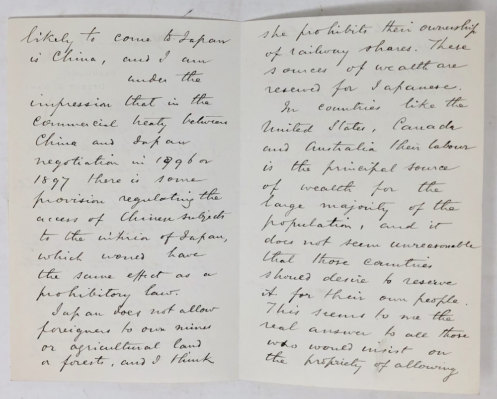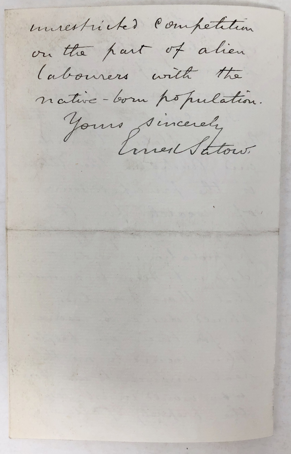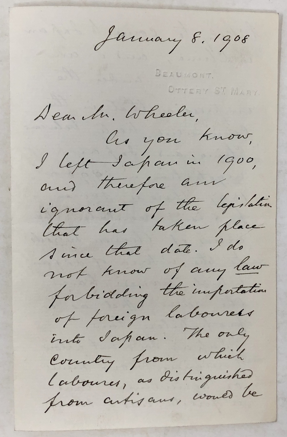 『国際会議集』(英国外務省歴史部門の企画によってパリ講和会議への英国派遣団のために準備されたハンドブックシリーズ第151巻)付属「1908年1月8日付 ホイラー宛 サトウ直筆書簡」