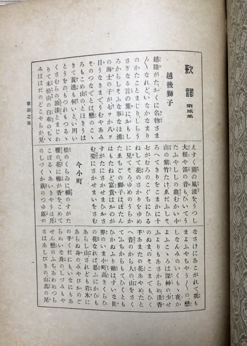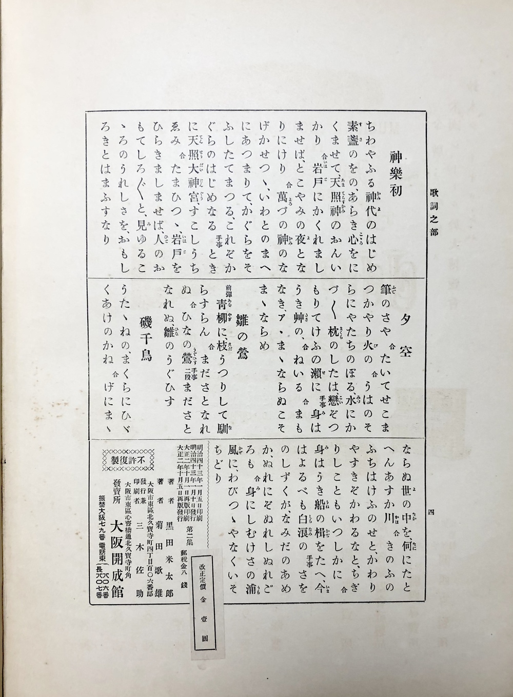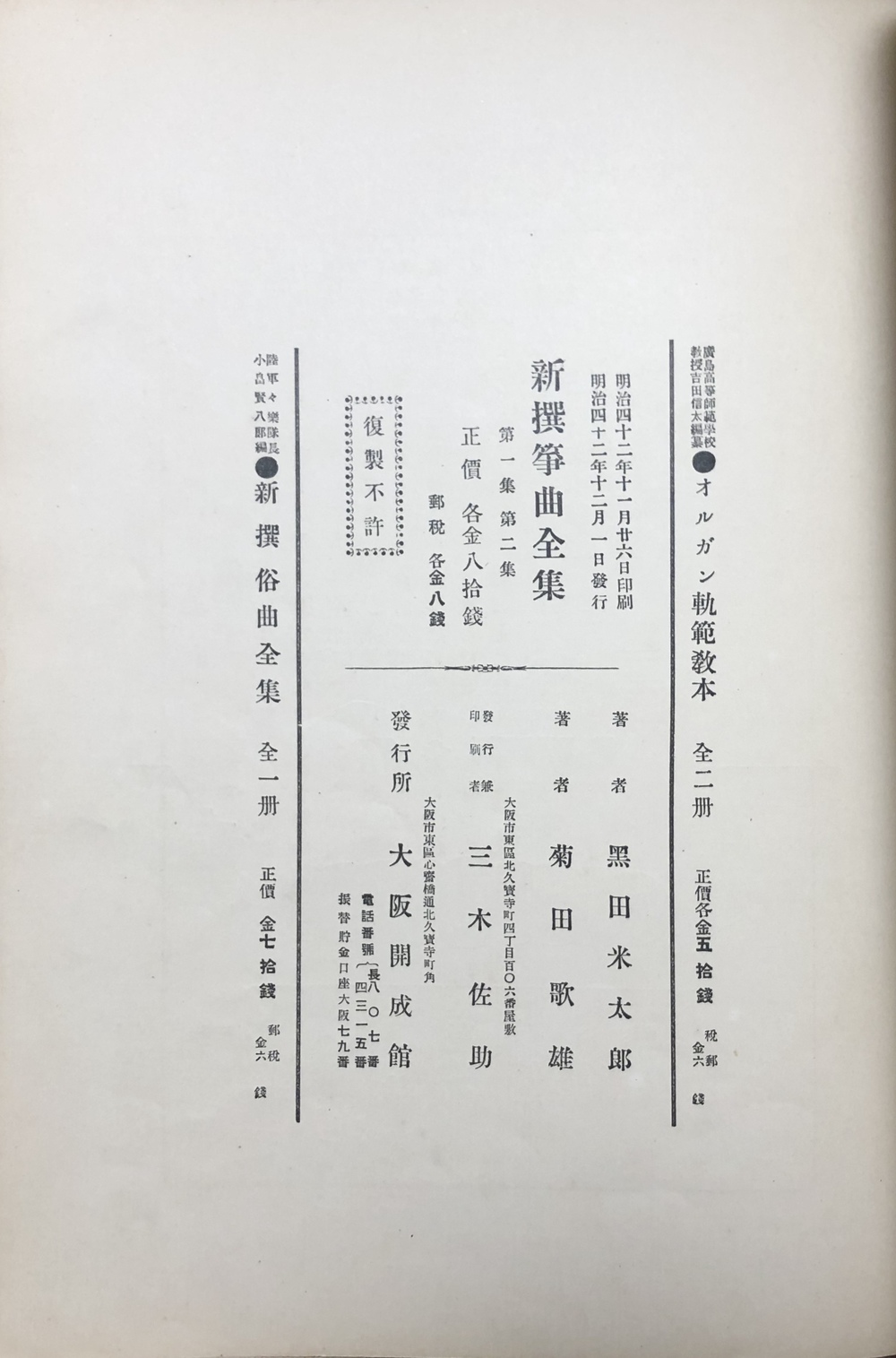 Vol.1: Title., pp.1-47, 1 leaf (advertisement / colophon), 3 leaves(lyrics), Vol.2: Title., pp.1-45(Verso: advertisement), 2 leaves(colophon / lyrics),