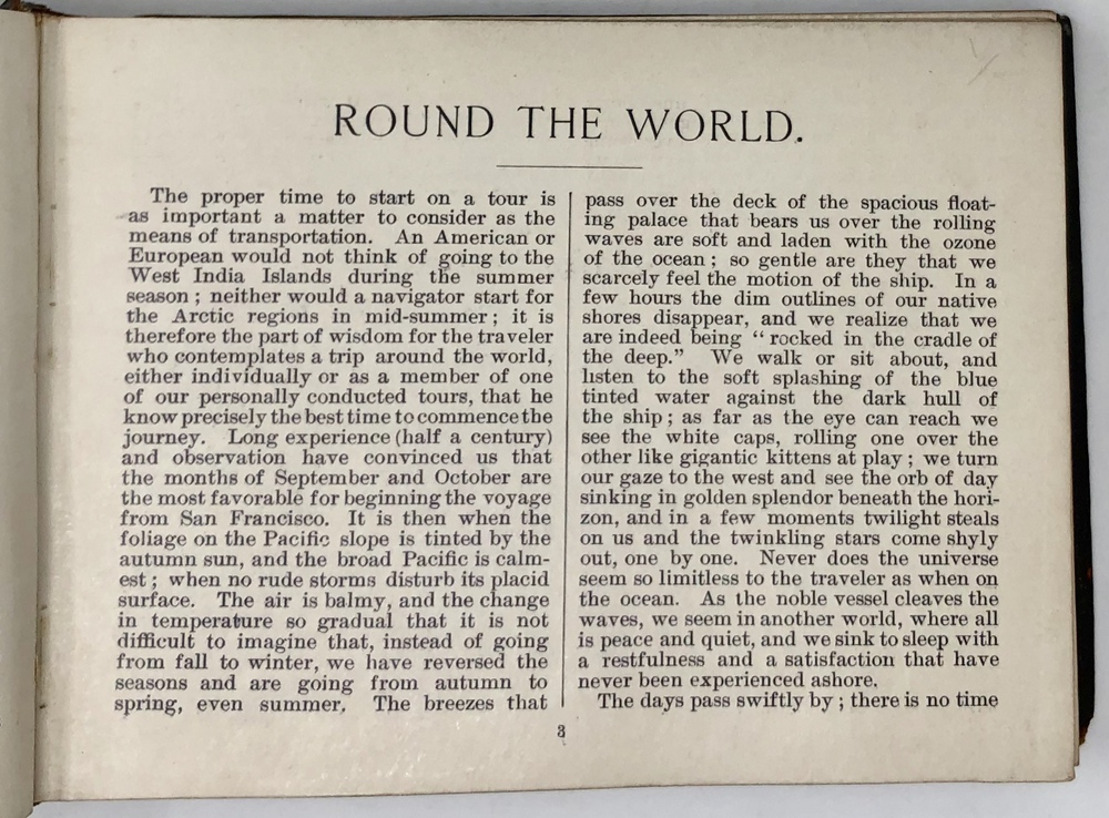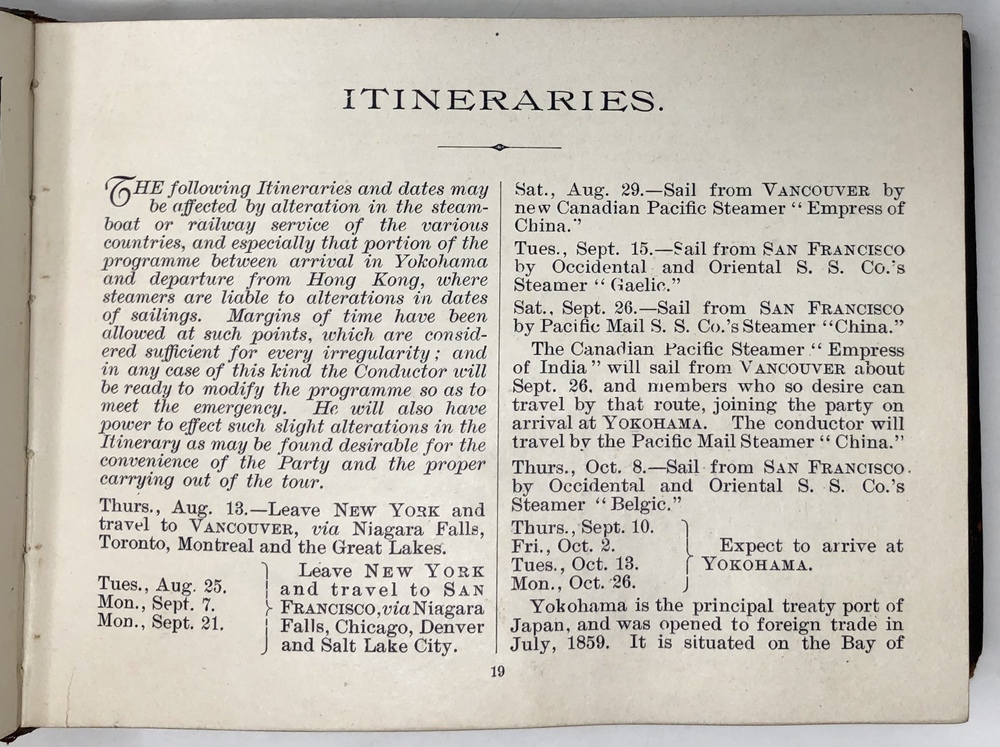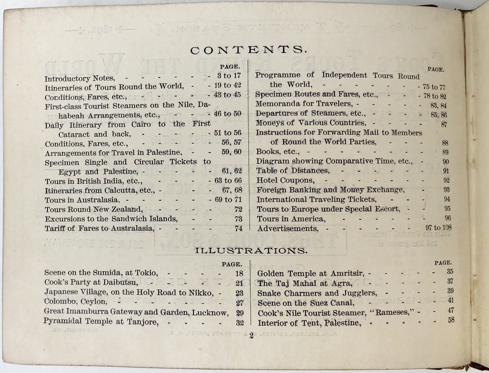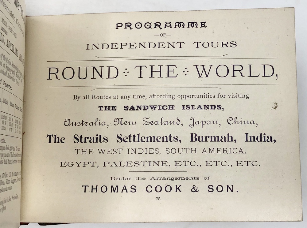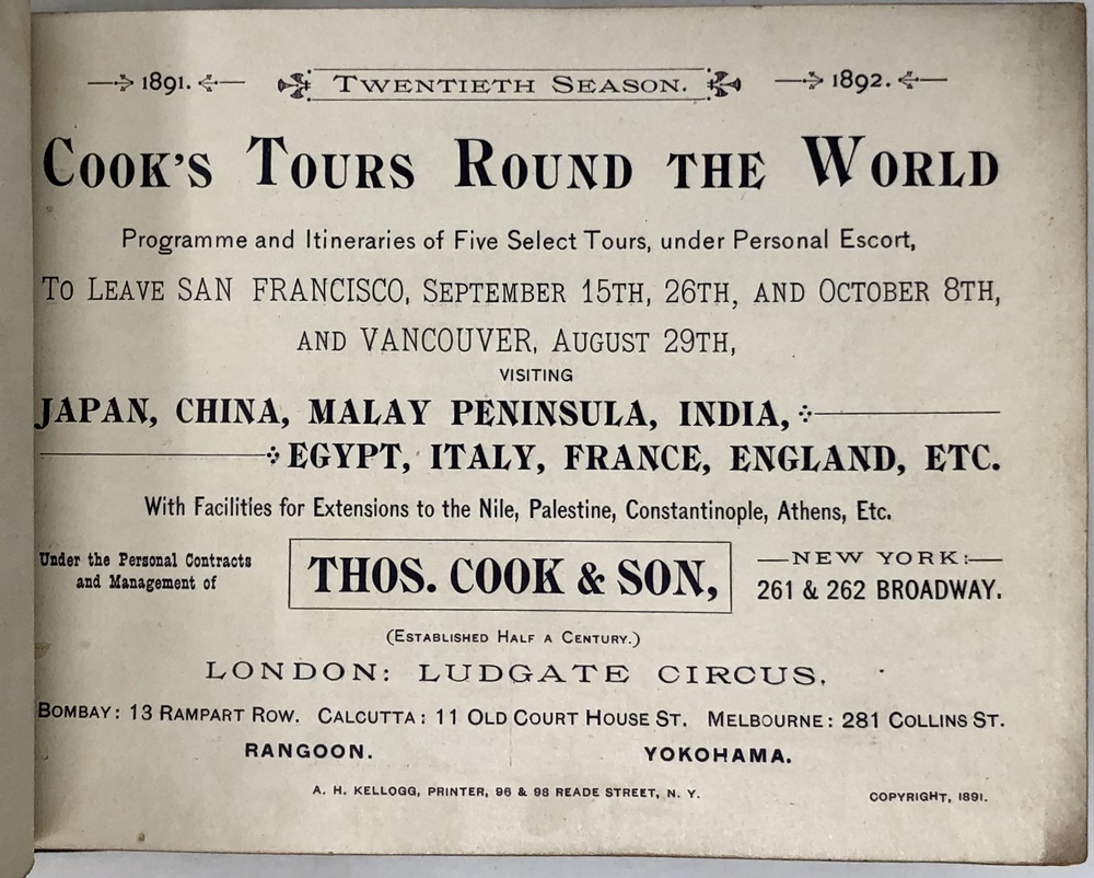TWENTIETH SEASON. COOK'S TOURS ROUND THE WORLD. Programme and Itineraries of Five Select Tours, under Personal Escort, TO LEAVE SAN FRANCISCO, SEPTEMBER 15TH, 26TH, AND OCTOBER 8TH, AND VANCOUVER, AUGUST 29TH, VISITING JAPAN, CHINA, MALAY PENISULA, INDIA,