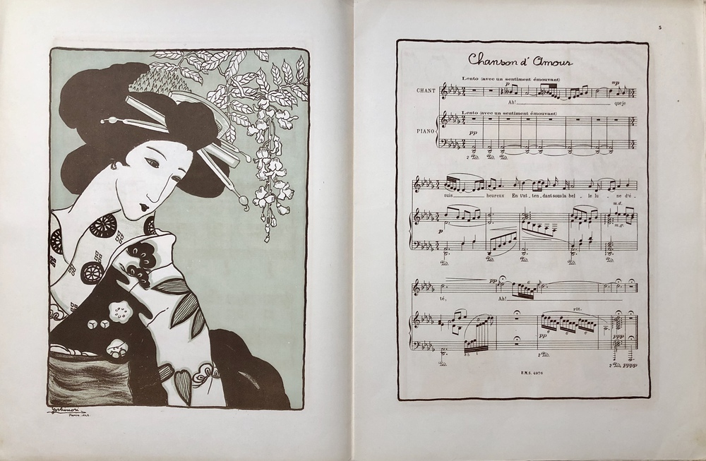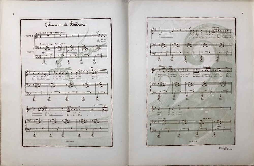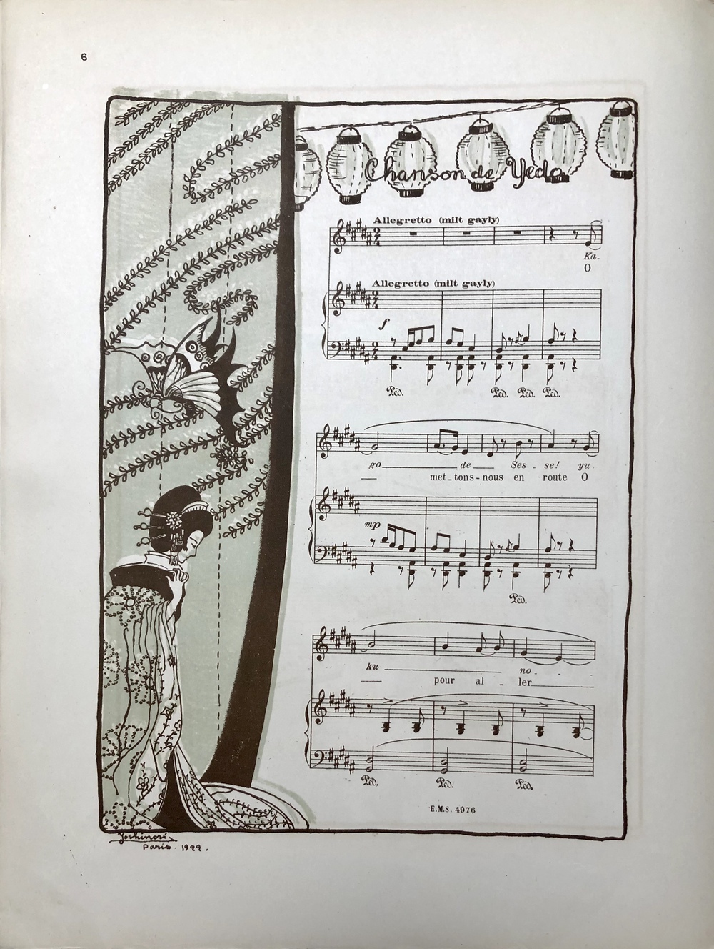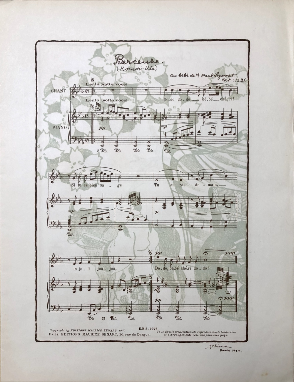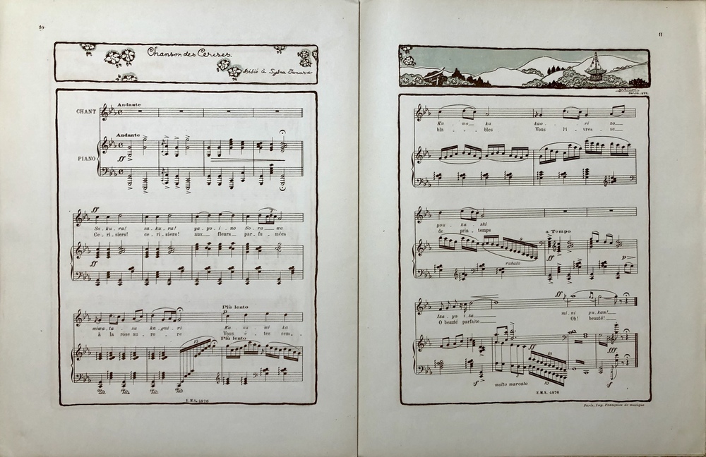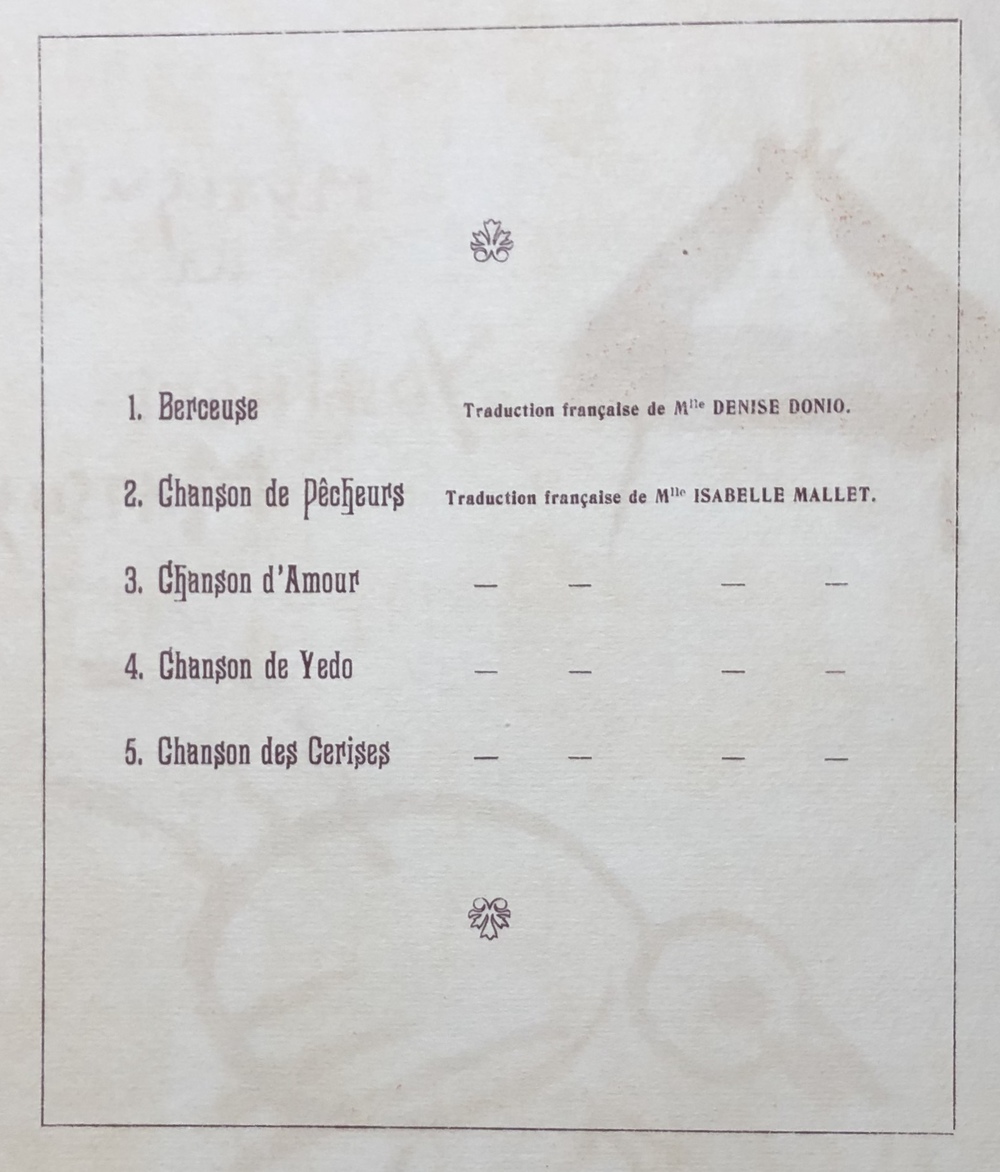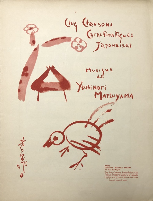 「作曲者の Yoshinori Matsuyama は松山芳野里(1891-1974)。大正から昭和にかけて活躍したテノール歌手。松山は当初、東京音楽学校でヴァイオリンを学んでいたが、声楽への転科を希望。これが学校に認められなかったため、同音楽学校を中退、帝国劇場と歌手契約をした。大正4年から昭和15年にかけて、アメリカ、イギリス、フランス、イタリア、ドイツで活躍。《5つの日本的な歌》は、フランスにいた頃に書かれたものであろう。1922年にスナール社から「室内楽シリーズ」の一環として出版。出版の経緯は不明だが、楽譜のイラストも松山の手になるもの。曲はいずれも日本のよく知られた歌による。 Cinq chansons Caractéristiques japonaises (5つの日本的な歌) 1. Berceuse(子守唄) 2. Chanson de pêcheurs(漁師の唄) 3. Chanson d'amour(愛の唄) 4. Chanson de Yedo(江戸の唄) 5. Chanson de serises(桜の唄)」 (近藤秀樹「仏蘭西で聴く日本の歌〜松山芳野里《5つの日本的な歌》(2008年1月20日南葵音楽文庫ミニレクチャー、レジュメより)
