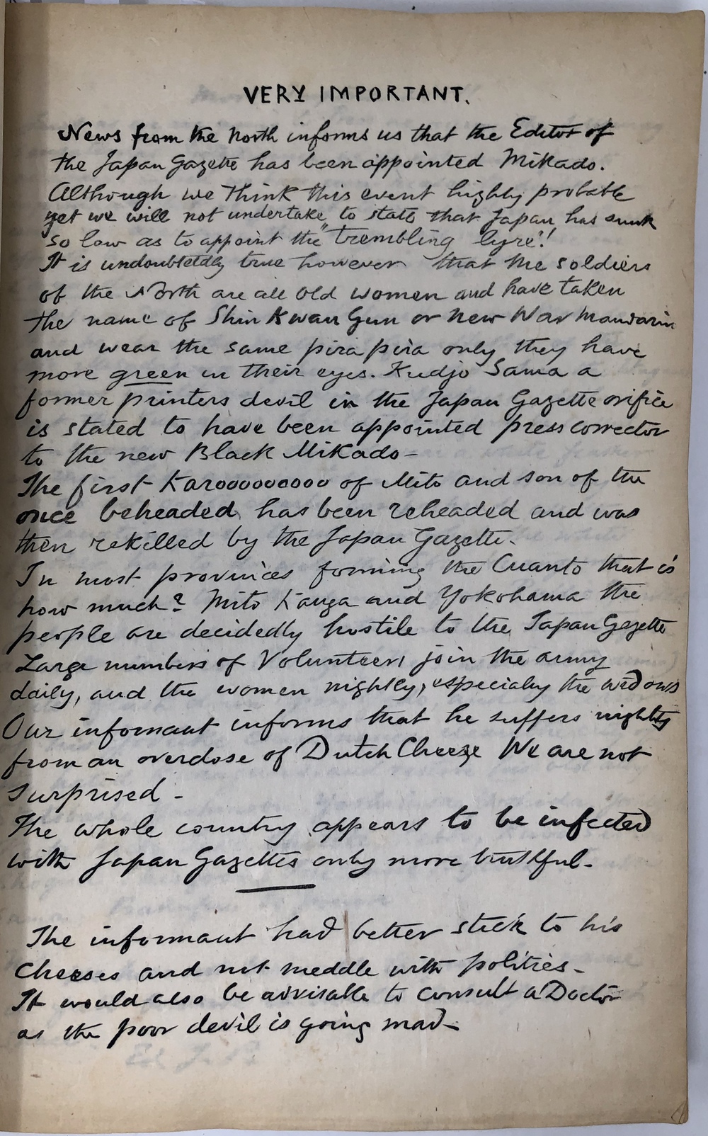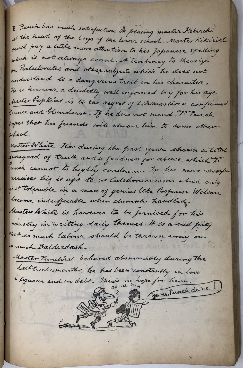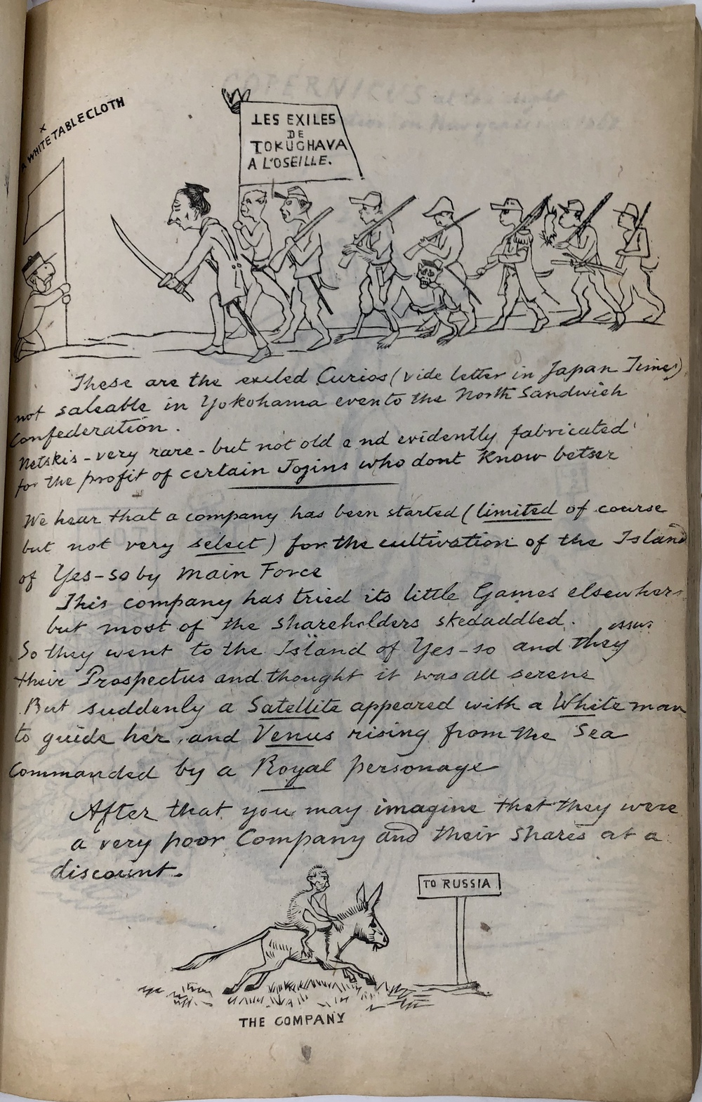 本書は、このように書誌情報の特定が非常に困難で、また現存数が後年の号よりも少ないことで知られる貴重なジャパン・パンチの初期の号を比較的纏った形で、しかも当時の所有者による合冊の形を保っているという点で、非常に価値のある文献ということができます。もちろん、幕末から明治初期にかけて大きな転換期を迎えることになった日本社会を横浜外国人居留地の人々の目線から描いた貴重な史料として、その内容がかけがえのない価値を有していることは言うまでもありません。