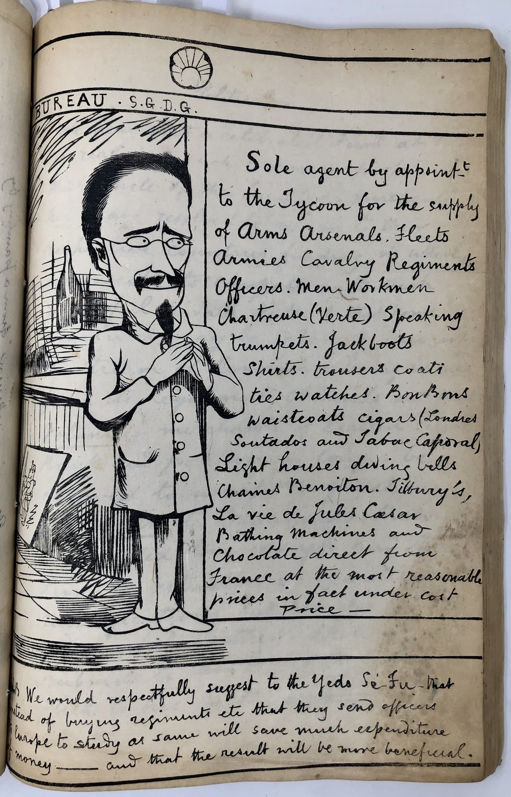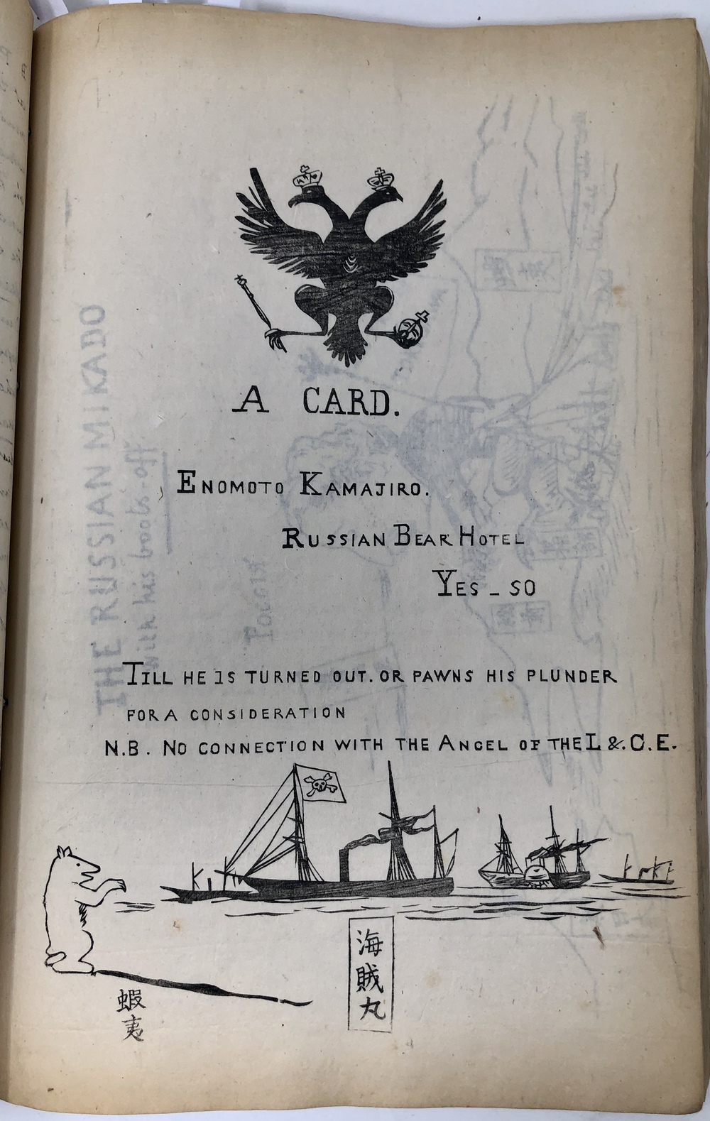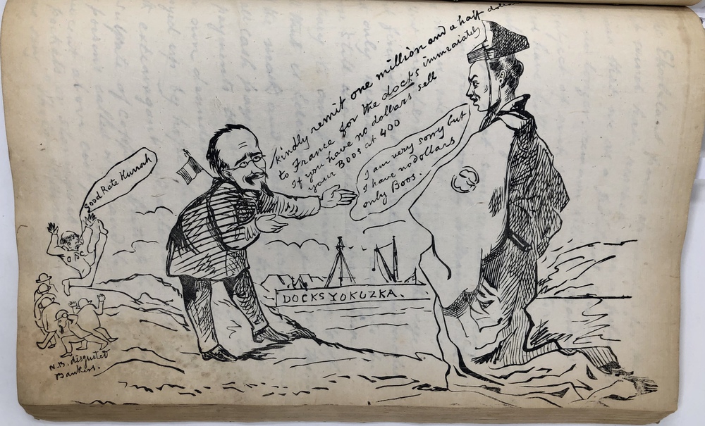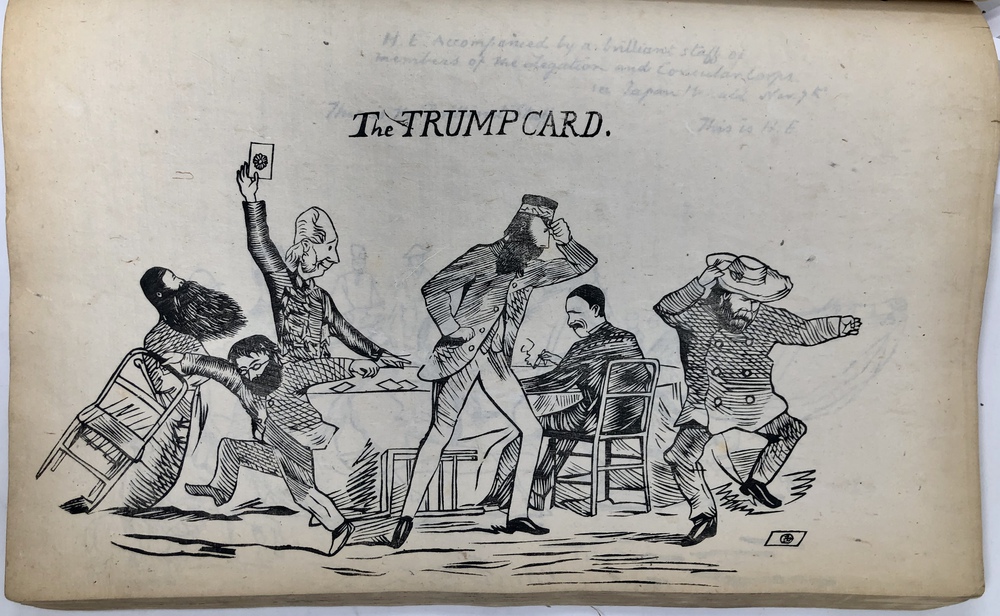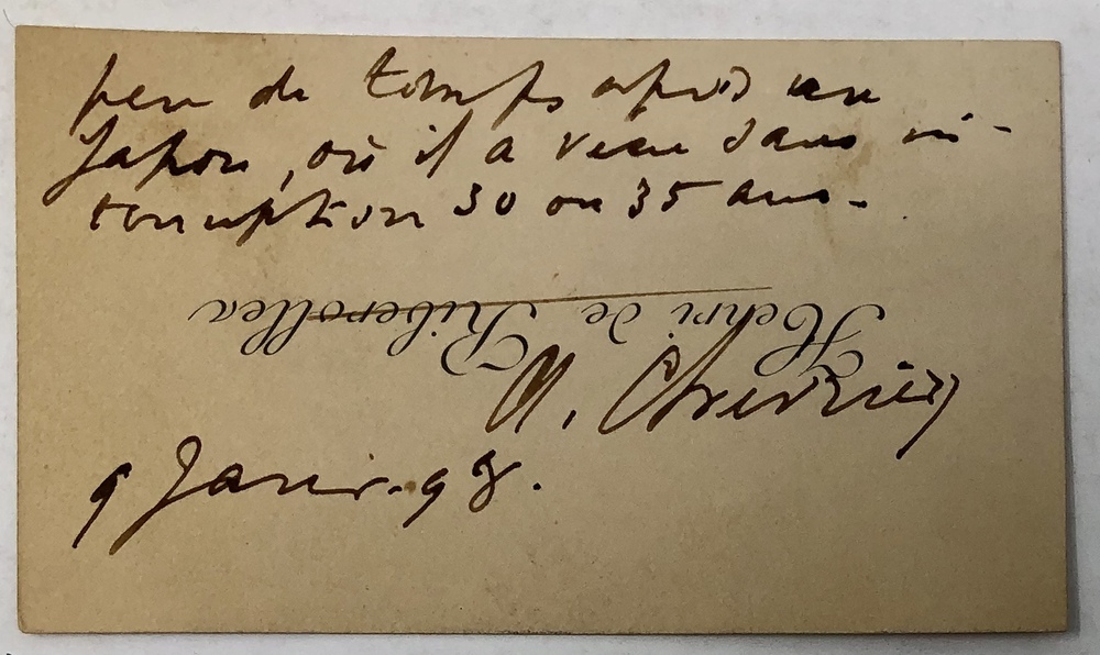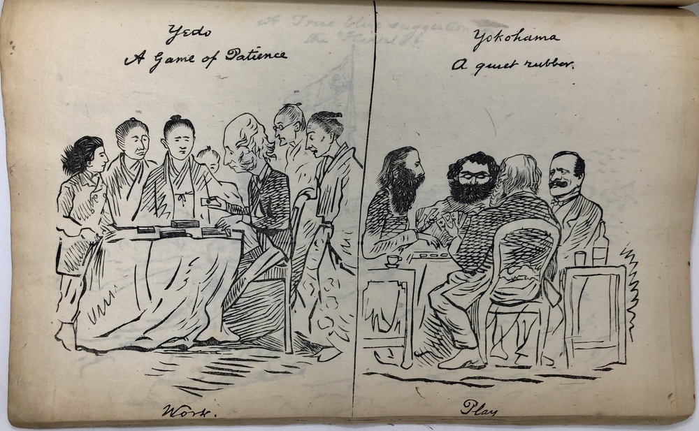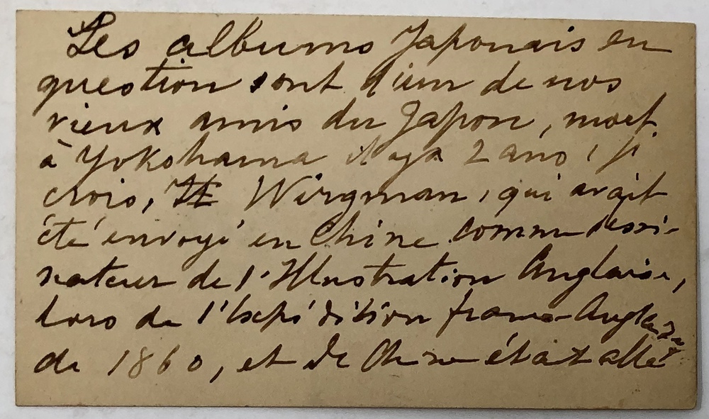 これらに加えて、本書には当時の横浜在住外国人所有者によるものと思われる書き込みのある和紙と名刺が挟み込まれており、これらも大変興味深いものです。和紙には「シュヴィリエ(Chevrier)90番(九十番)」とあり、挟み込まれた名刺の書き込みにもシュヴィリエによる署名があります。このシュヴィリエがどういった人物であるのかは分かりませんが、横浜の居留地番号を示すと思われる90番という場所は、スイスによる日本との通商条約のために1863年に派遣された使節団の商業部門を担当する公使館参事官として来日して以降、横浜に居を構えていたブレンワルド(Casper Brennwald, 1838 - 1899)によるシイベル・ブレンワルド社が1868年以降の所在地としていたことで知られる場所です。名刺は、リベロール(Henri de Riberolles )とありますが、恐らくこのリベロールとは、大学南校を経て、1872年から74年にかけて司法省法学校の教員となっていたリベロールのことと思われます。名刺の書き込みは、『ジャパン・パンチ』とその著者であるワーグマンについて簡単に紹介したもので、1898年1月9日付とあります。この書き込みでは、「私が信じるに2年前に横浜で亡くなった私たちの日本の友人による」ものとして『ジャパン・パンチ』のことを紹介しています(ワーグマンが亡くなったのは1891年のことですので「2年前」というのは明らかに間違いですが)。