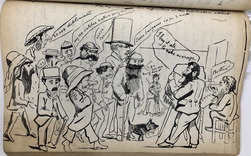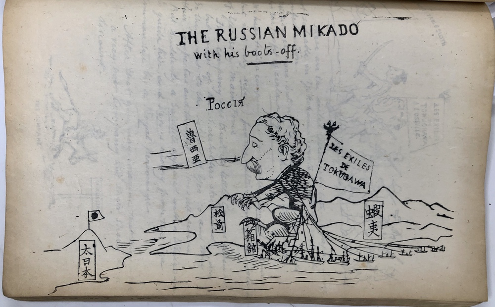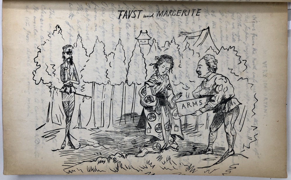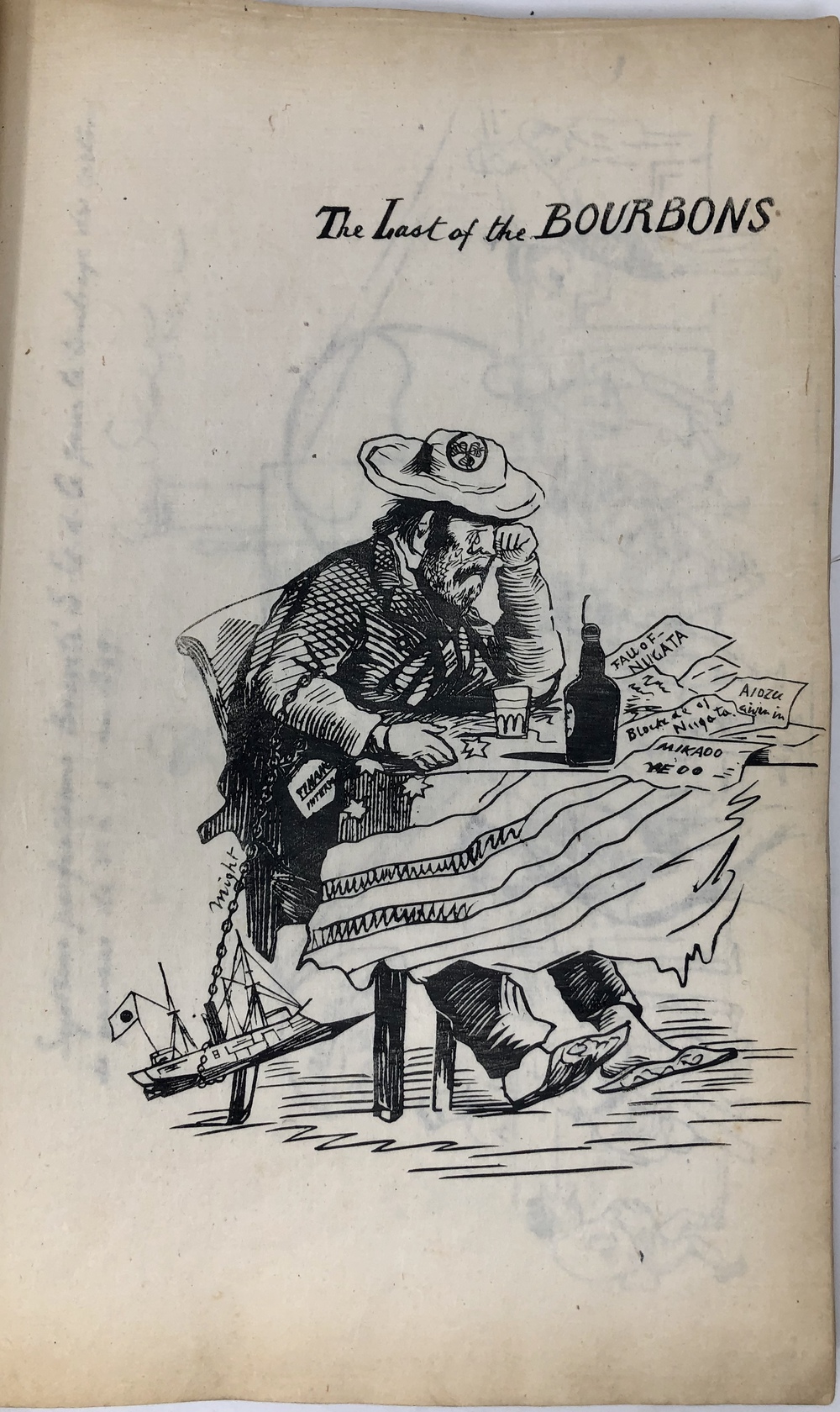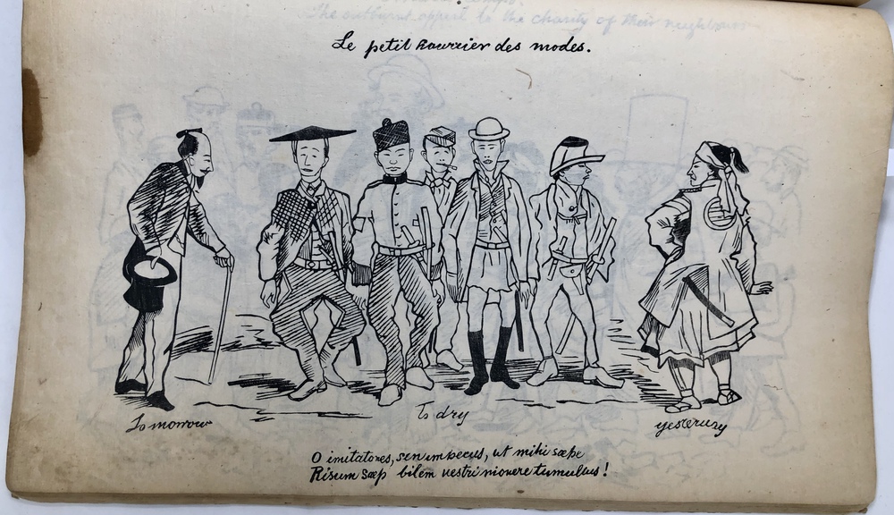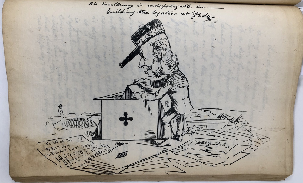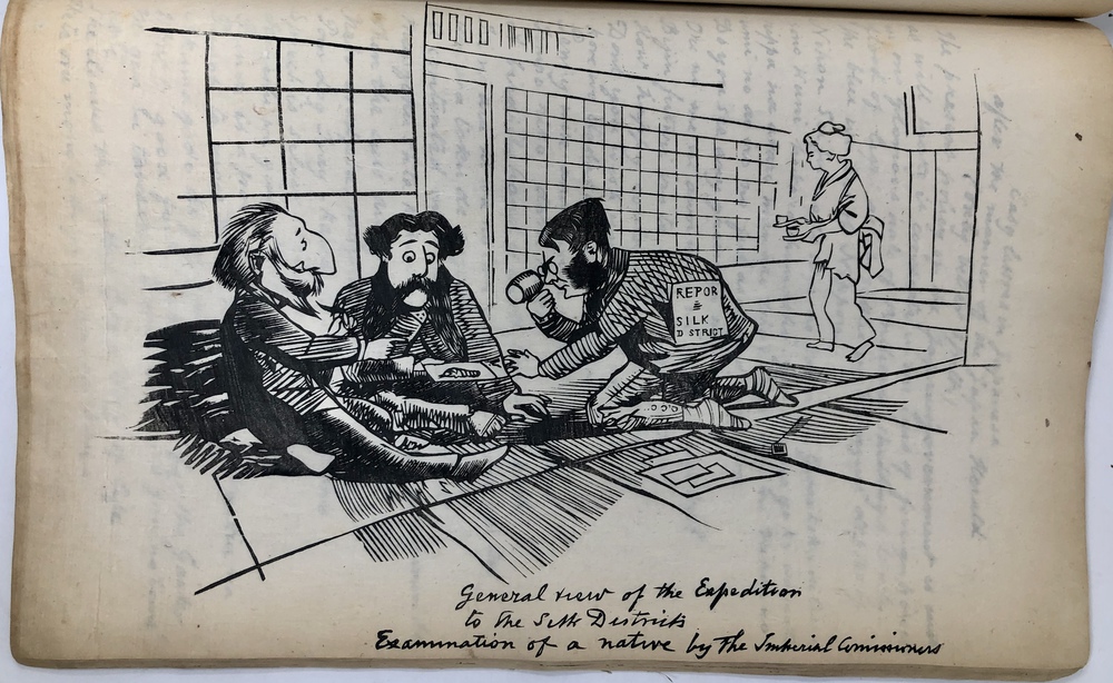 これらに加えて、本書には当時の横浜在住外国人所有者によるものと思われる書き込みのある和紙と名刺が挟み込まれており、これらも大変興味深いものです。和紙には「シュヴィリエ(Chevrier)90番(九十番)」とあり、挟み込まれた名刺の書き込みにもシュヴィリエによる署名があります。このシュヴィリエがどういった人物であるのかは分かりませんが、横浜の居留地番号を示すと思われる90番という場所は、スイスによる日本との通商条約のために1863年に派遣された使節団の商業部門を担当する公使館参事官として来日して以降、横浜に居を構えていたブレンワルド(Casper Brennwald, 1838 - 1899)によるシイベル・ブレンワルド社が1868年以降の所在地としていたことで知られる場所です。名刺は、リベロール(Henri de Riberolles )とありますが、恐らくこのリベロールとは、大学南校を経て、1872年から74年にかけて司法省法学校の教員となっていたリベロールのことと思われます。名刺の書き込みは、『ジャパン・パンチ』とその著者であるワーグマンについて簡単に紹介したもので、1898年1月9日付とあります。この書き込みでは、「私が信じるに2年前に横浜で亡くなった私たちの日本の友人による」ものとして『ジャパン・パンチ』のことを紹介しています(ワーグマンが亡くなったのは1891年のことですので「2年前」というのは明らかに間違いですが)。