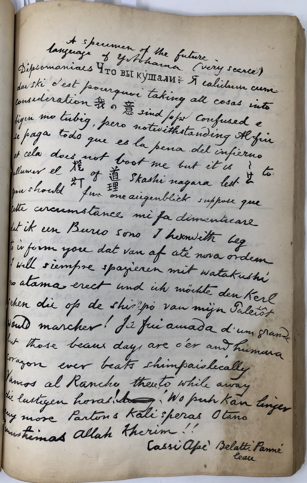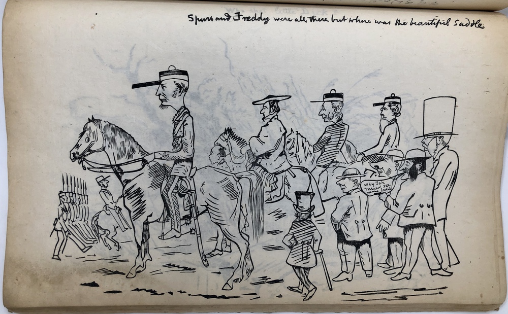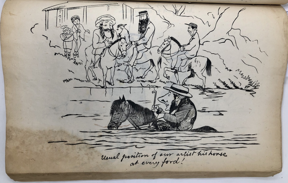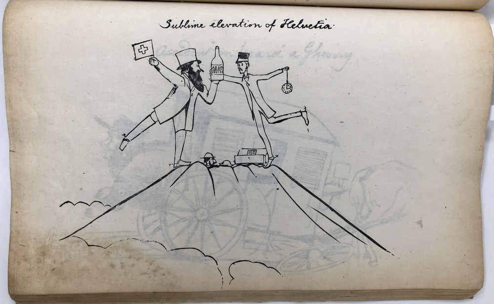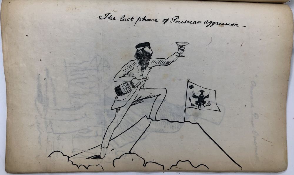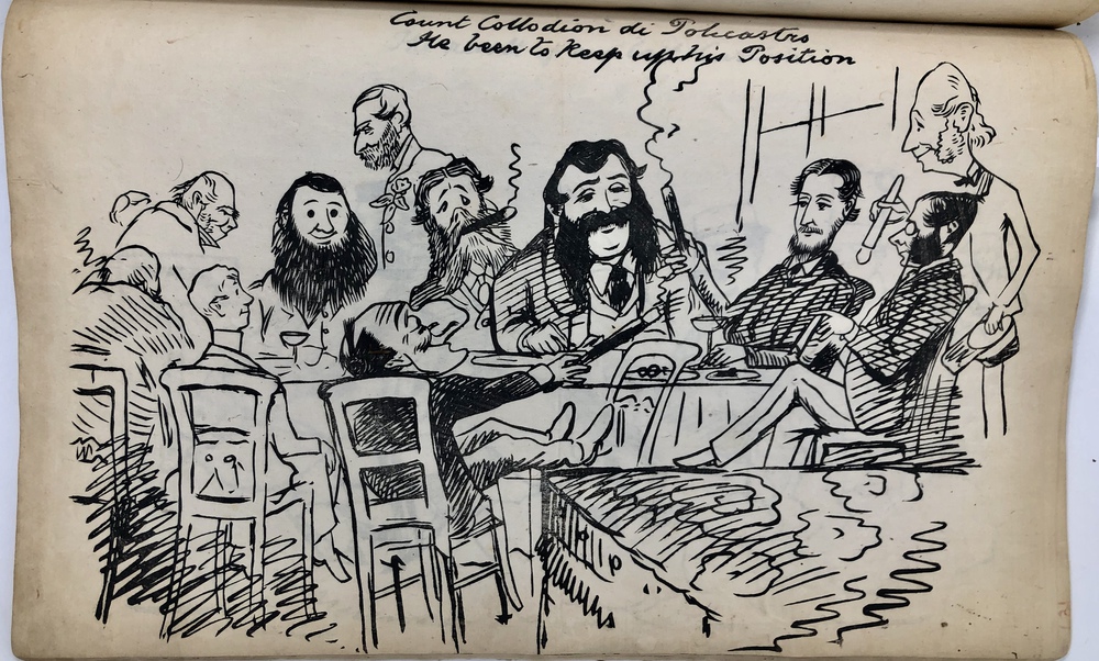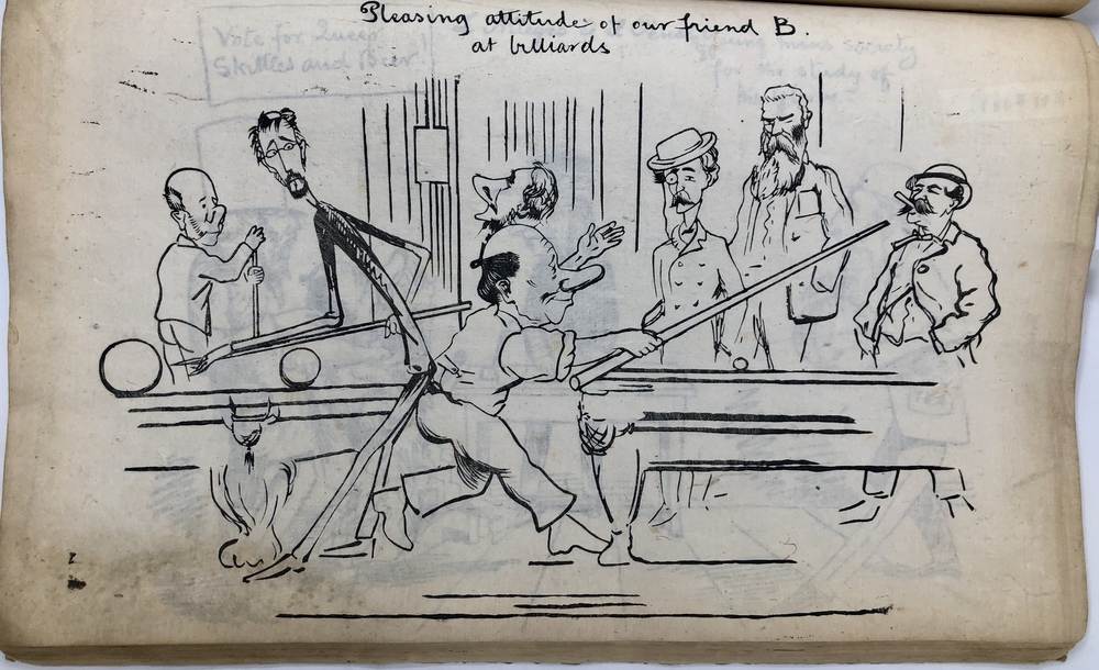 これらに加えて、本書には当時の横浜在住外国人所有者によるものと思われる書き込みのある和紙と名刺が挟み込まれており、これらも大変興味深いものです。和紙には「シュヴィリエ(Chevrier)90番(九十番)」とあり、挟み込まれた名刺の書き込みにもシュヴィリエによる署名があります。このシュヴィリエがどういった人物であるのかは分かりませんが、横浜の居留地番号を示すと思われる90番という場所は、スイスによる日本との通商条約のために1863年に派遣された使節団の商業部門を担当する公使館参事官として来日して以降、横浜に居を構えていたブレンワルド(Casper Brennwald, 1838 - 1899)によるシイベル・ブレンワルド社が1868年以降の所在地としていたことで知られる場所です。名刺は、リベロール(Henri de Riberolles )とありますが、恐らくこのリベロールとは、大学南校を経て、1872年から74年にかけて司法省法学校の教員となっていたリベロールのことと思われます。名刺の書き込みは、『ジャパン・パンチ』とその著者であるワーグマンについて簡単に紹介したもので、1898年1月9日付とあります。この書き込みでは、「私が信じるに2年前に横浜で亡くなった私たちの日本の友人による」ものとして『ジャパン・パンチ』のことを紹介しています(ワーグマンが亡くなったのは1891年のことですので「2年前」というのは明らかに間違いですが)。