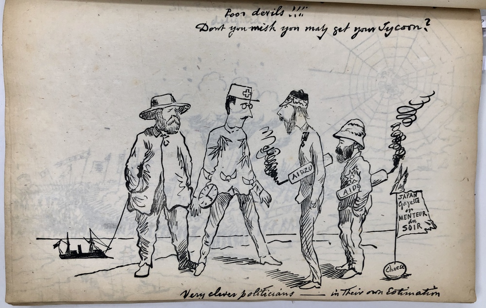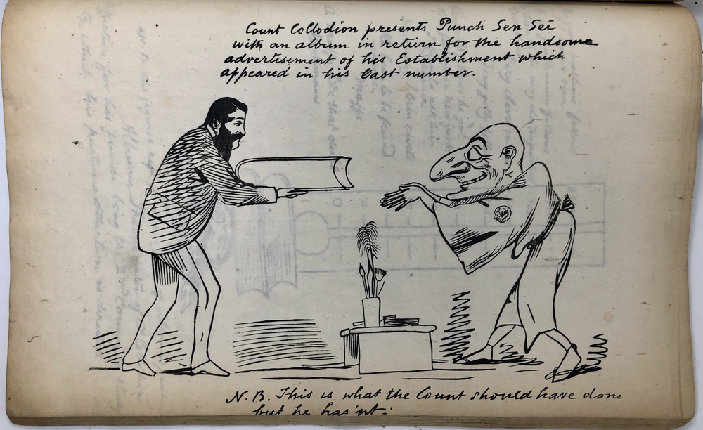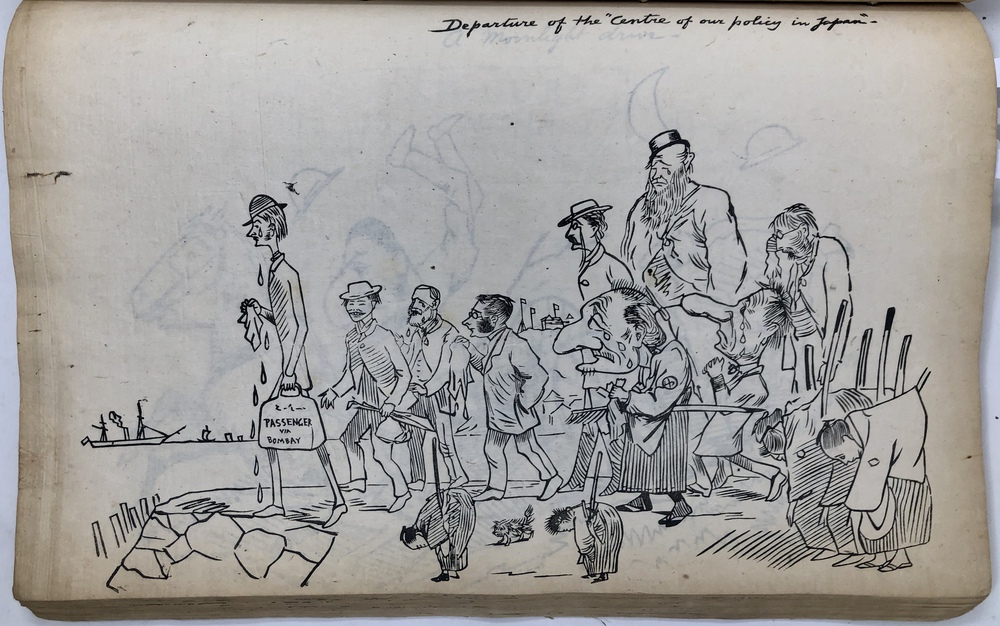 Mr.パンチの登場は1865年以前は表紙だけであったが、1866年以降イラストへの登場が確立され、やがて大きな鼻のハゲ頭の人物へと進化してゆき、たいていは日本風に着物姿で現れる。Mr.パンチの友人が3人、この冒険に共演者として特に頻繁に登場する。−”コロジオン伯爵”(フェリックス・ベアト 、写真家)、”好奇心旺盛男”(ウィリアム・H.スミス、野菜マン)、”スマイルズ卿”(ハリー・スミス・パークス卿、英国公使)の3人である。」