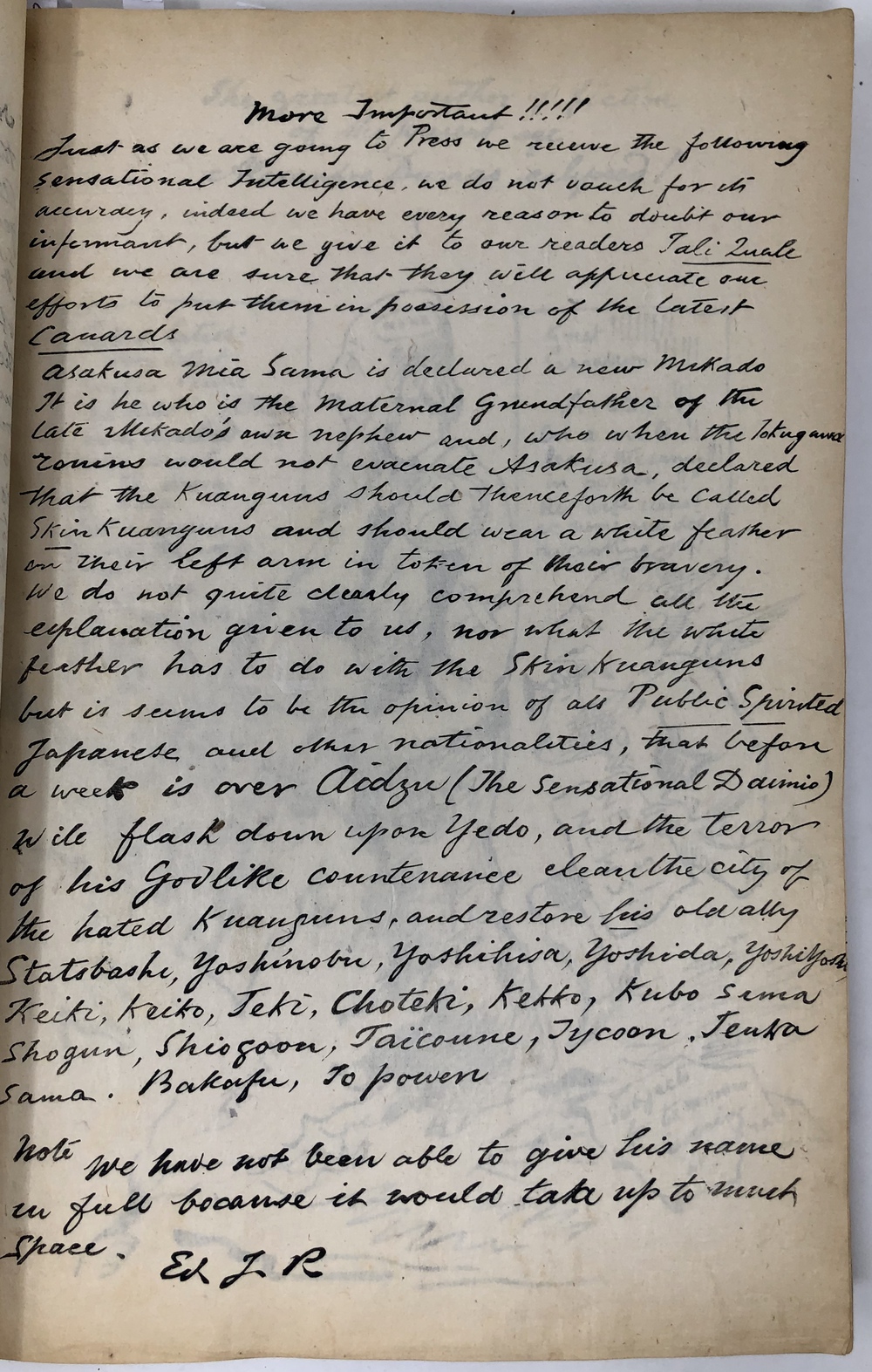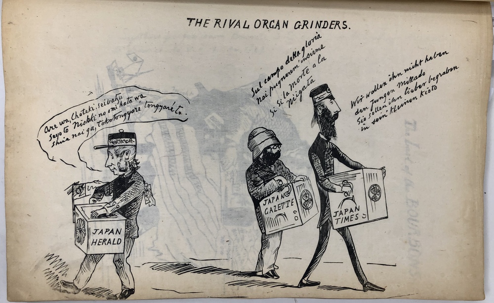 JPの発行形態については謎が多い。ワーグマン自身が取材し、文章と絵を描いたことは疑いない。だが、それを版におこし、仮製本した商社、ないしは人物がいたはずだ。しかし、それを特定することは叶わず、また販売形態も不明だ。1869年の記事によれば、Japan Times社が取次販売をしているが、それがいつからいつまでなのかは不明である。また、1883年末頃から木版印刷から石板印刷へと変更されるが、それを担ったのがアル・メイクルジョン商会であった。このように横浜居留地内の会社等が協力し、発行・販売されていたと想像されるのである。」
