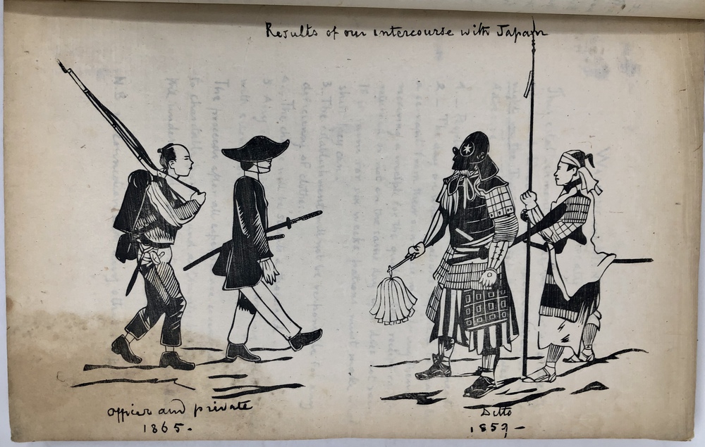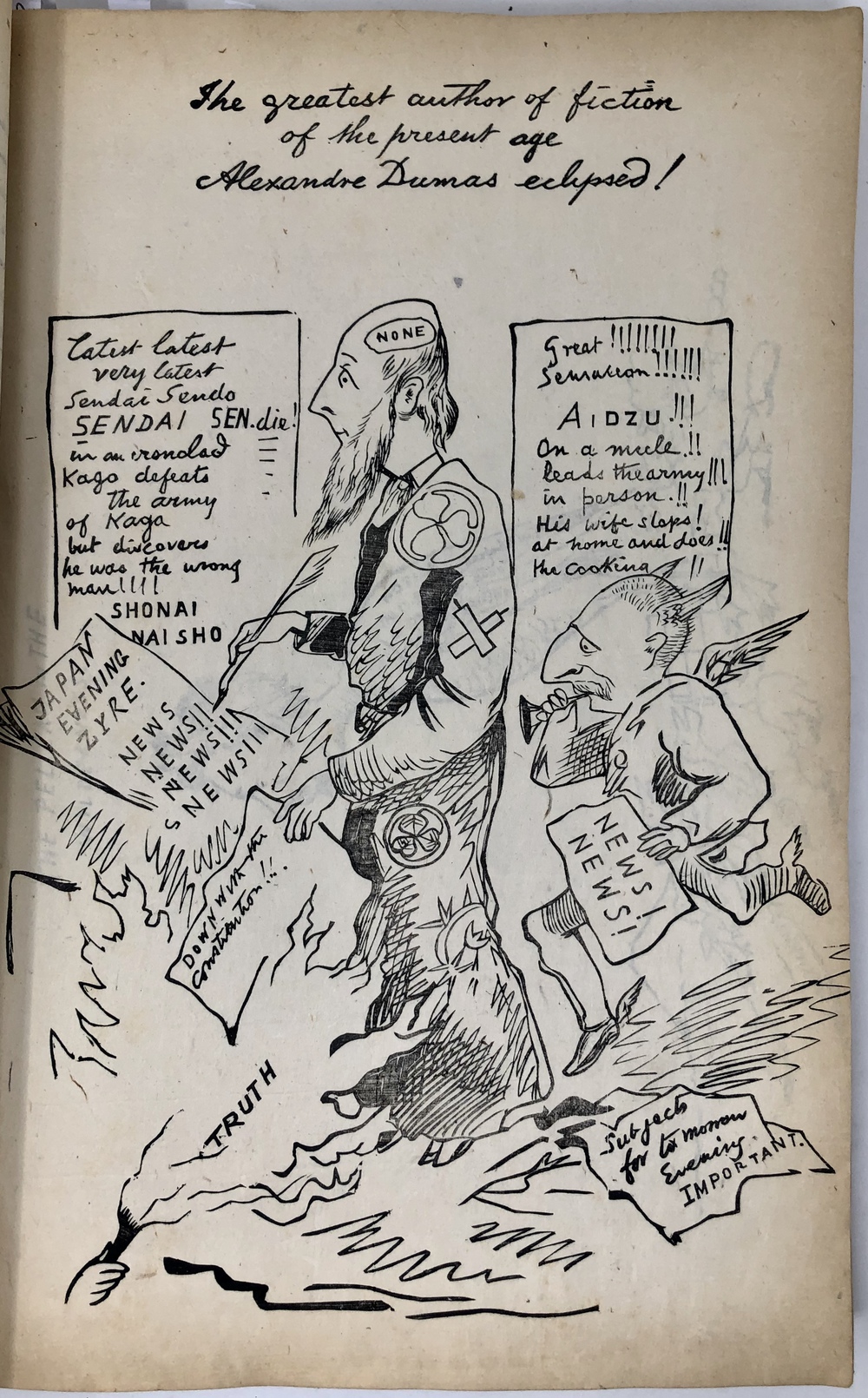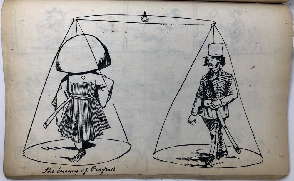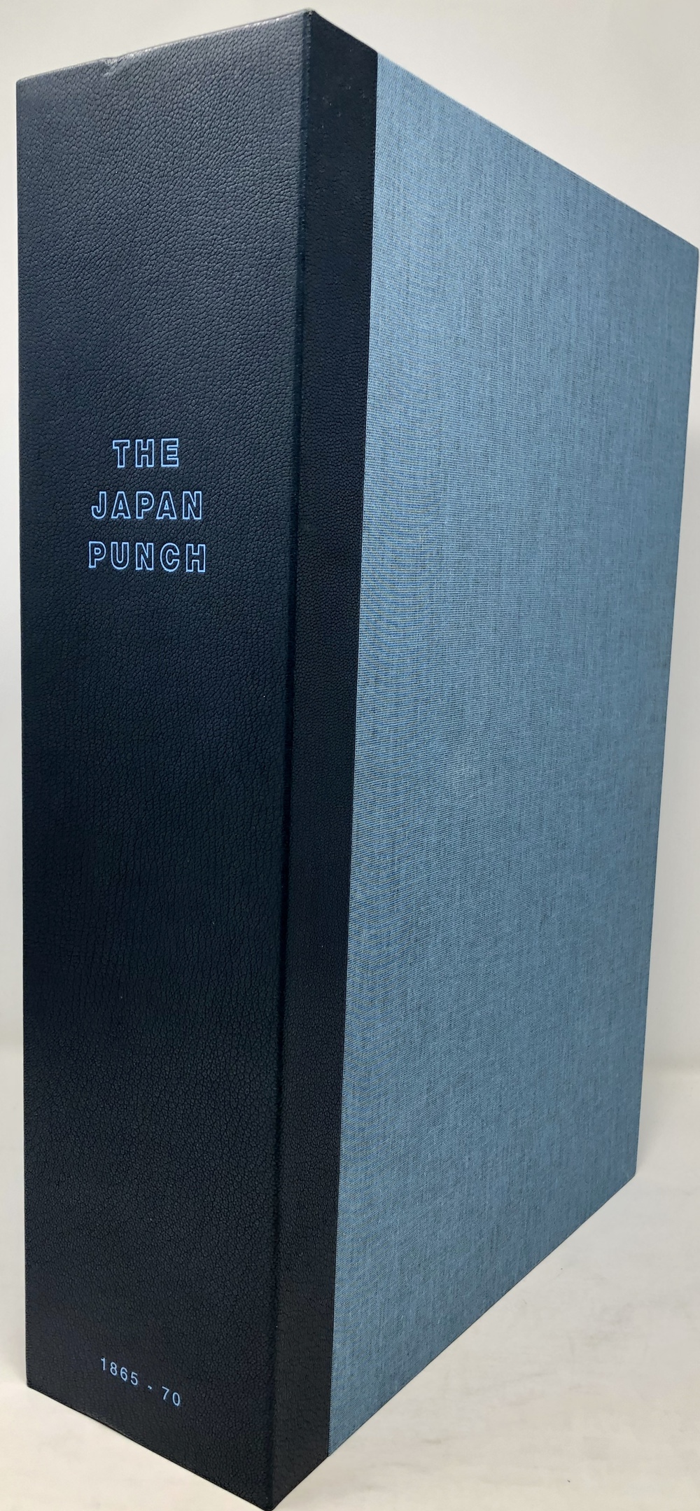 本書は、ワーグマン(Charles Wirgman, 1832 – 1891)による幕末期から明治初期の日本を描いた風俗雑誌「ジャパン・パンチ」の1865年から70年にかけての37号を2冊(和本仕立て)にまとめたものです。ジャパン・パンチは、1862年から1887年まで刊行され、日本の「ポンチ絵」の原型となったことや、優れた風刺画の歴史教科書への掲載でもよく知られる雑誌です。創刊された1862年に3号ほどを刊行してから、以降1865年までは刊行を休止していますので、本書に収録されているのは、最初期の1862年刊行分を除く貴重な初期の号ということになります。いうまでもなく幕末から明治初期にかけて日本国内が激動の時期にあたることから、非常に興味深い記事を数多く見出すことができます。また、ジャパン・パンチは、その刊行頻度や時期、それぞれの内容となると、復刻版の存在にもかかわらず依然として不明な点が多々あることでも知られますが、本書には雄松堂による復刻版に収録されていない号(1870年1月あるいは2月号)が収録されており(2020年7月追記:この点について、当該号が雄松堂復刻版において1869年11月号として収録されている号であることをご指摘いただきました。以下追記として記載を修正するとともに、ご指摘いただきましたことに重ねて御礼申し上げます)、ジャパン・パンチの全貌をより明らかにするための貴重な史料とも言えます。