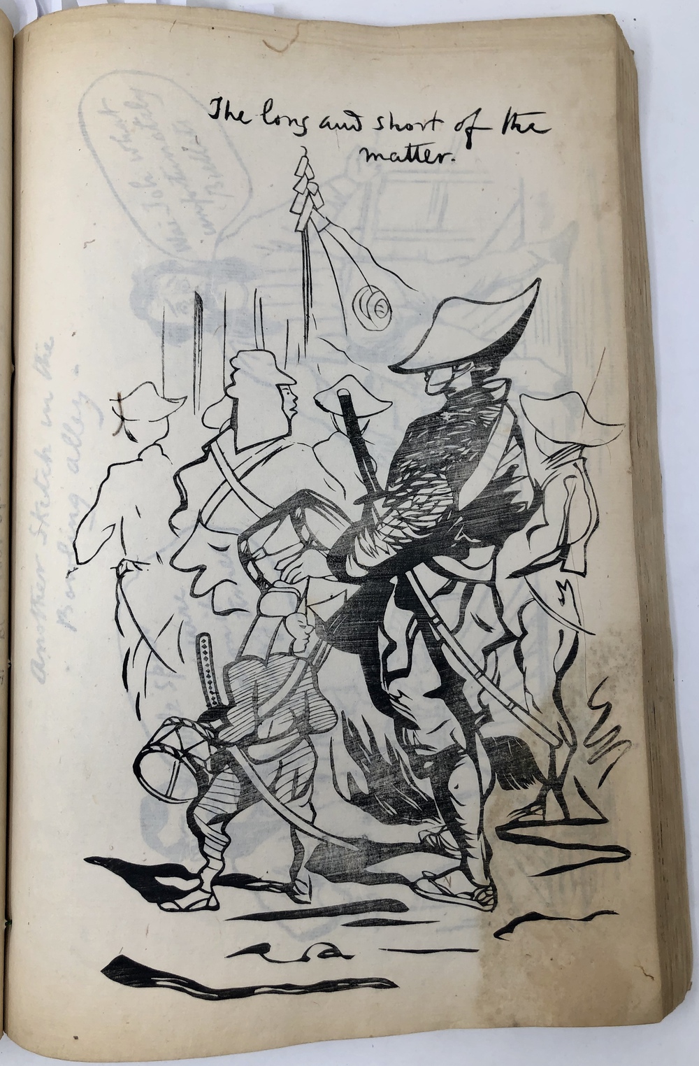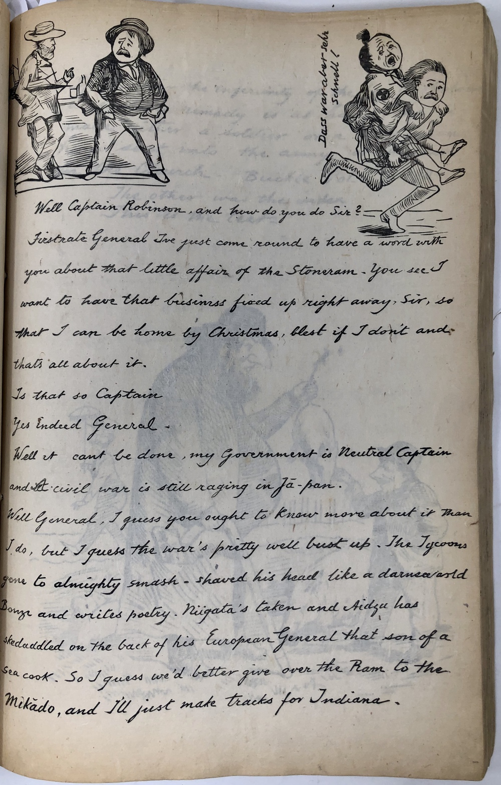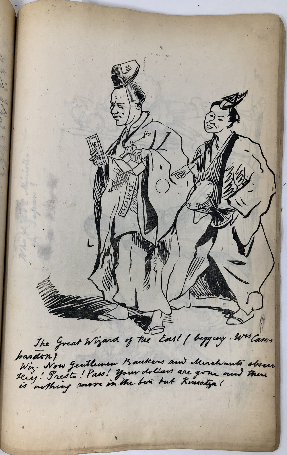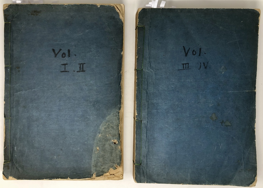 本書は、ワーグマン(Charles Wirgman, 1832 – 1891)による幕末期から明治初期の日本を描いた風俗雑誌「ジャパン・パンチ」の1865年から70年にかけての37号を2冊(和本仕立て)にまとめたものです。ジャパン・パンチは、1862年から1887年まで刊行され、日本の「ポンチ絵」の原型となったことや、優れた風刺画の歴史教科書への掲載でもよく知られる雑誌です。創刊された1862年に3号ほどを刊行してから、以降1865年までは刊行を休止していますので、本書に収録されているのは、最初期の1862年刊行分を除く貴重な初期の号ということになります。いうまでもなく幕末から明治初期にかけて日本国内が激動の時期にあたることから、非常に興味深い記事を数多く見出すことができます。また、ジャパン・パンチは、その刊行頻度や時期、それぞれの内容となると、復刻版の存在にもかかわらず依然として不明な点が多々あることでも知られますが、本書には雄松堂による復刻版に収録されていない号(1870年1月あるいは2月号)が収録されており(2020年7月追記:この点について、当該号が雄松堂復刻版において1869年11月号として収録されている号であることをご指摘いただきました。以下追記として記載を修正するとともに、ご指摘いただきましたことに重ねて御礼申し上げます)、ジャパン・パンチの全貌をより明らかにするための貴重な史料とも言えます。