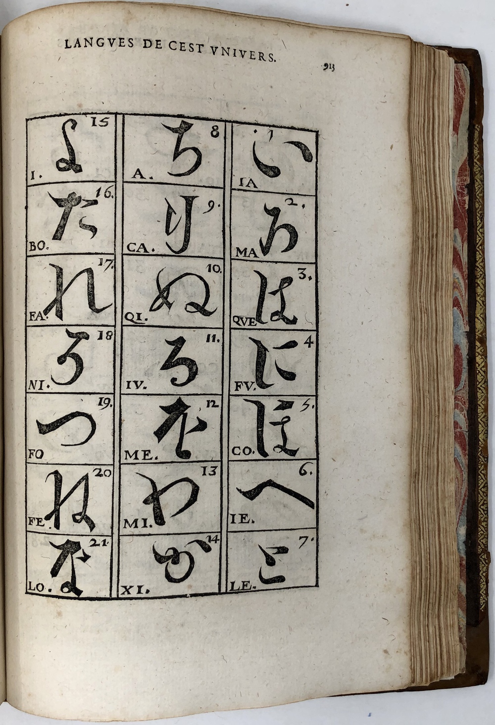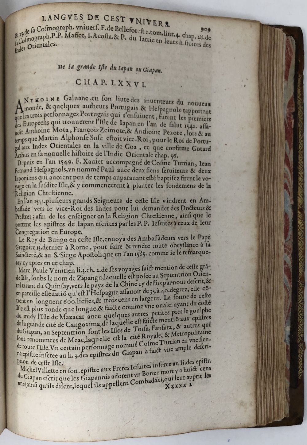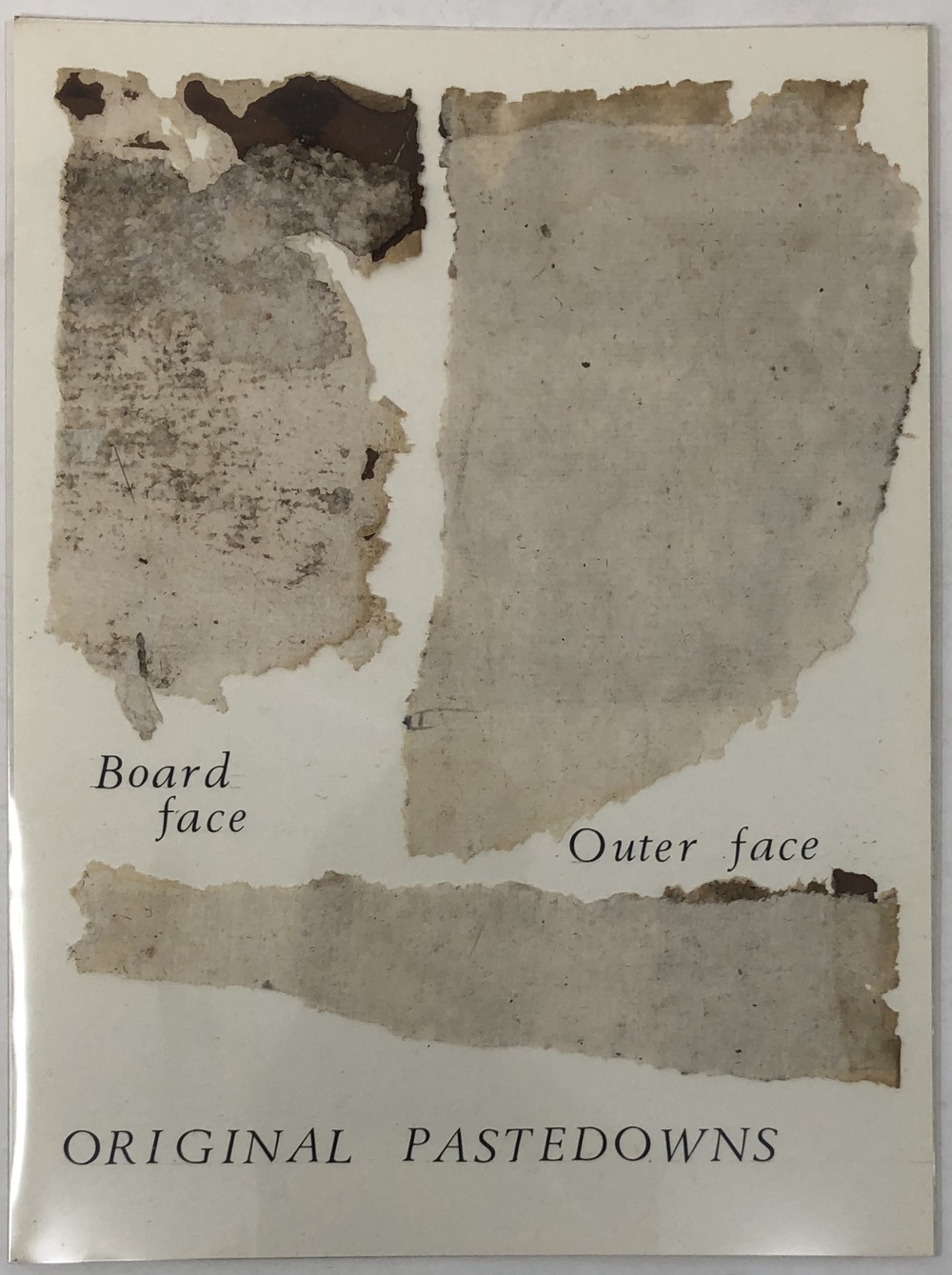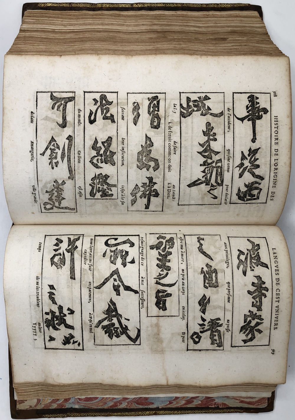 それ以前は2冊本であったものを1790年に1冊に綴じ直されており、表紙に金箔押しが施されている。現在の装丁はそれをさらに近年再修復したもので、その際の修理記録と以前の装丁に用いられていた花切れなどが付属。修理記録と書籍本体を納められる専用のスリップケースが付属。(Cordier: 274-275 / NCID: BA62618695(2nd ed.))
