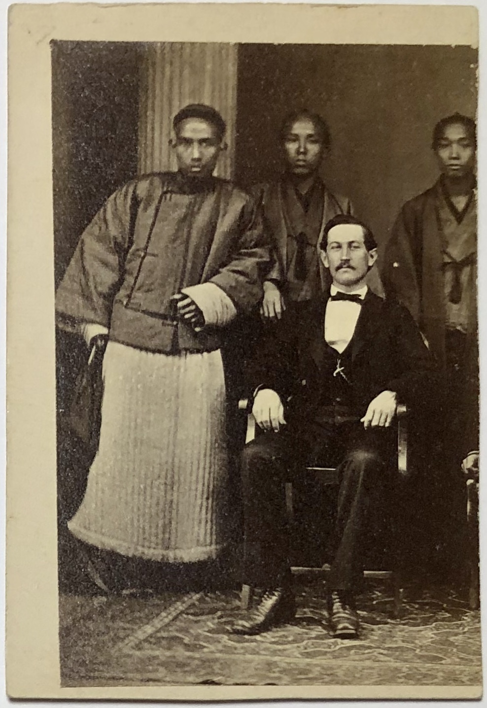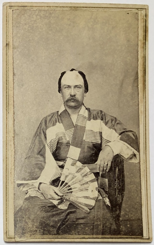 ファン・リードは、その名前から分かるようにオランダ系のアメリカ人で、浜田彦蔵(ジョセフ・ヒコ)と出会ったことをきっかけに日本に関心を抱き、1859年にアメリカ総領事館付きの初期生として来日しました。来日してからはハード商会の社員として活動したほか、「横浜新報もしほ草」という新聞を岸田吟香と協力して発行するなど文化活動においても精力的な活躍を見せ、幕末から明治初期に日本に滞在した外国人の中でも一際目立つ存在だったと言われています。また、1868年のイギリス船によるハワイ移民(明治元年であったことから「元年者」と呼ばれる)斡旋の企画者としては、明治政府と対立しながら移民移送を強行したことでも知られており、こうしたことも災いしてか後年の彼に対する評価は毀誉褒貶が激しいものになっています。ファン・リードを撮影した写真としては浜田彦蔵とともに写った比較的若い時期の写真のみがこれまで知られていますが、②や④はそれ以降の日本で活躍するようになってからの姿を写したこれまで知られていなかった写真で、特に②については(その評価はともかく)彼の親日ぶりをユーモラスに伝える史料として非常に興味深いものと言えるでしょう。