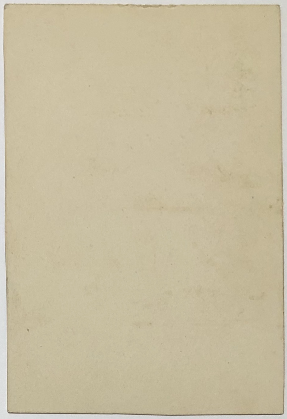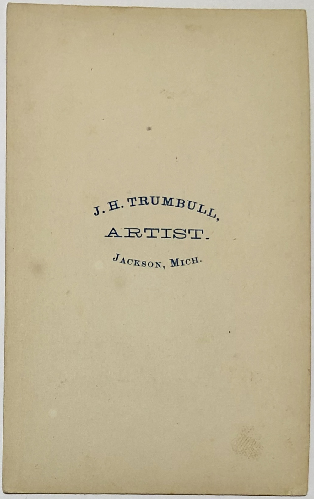 日本風のカツラと着物、センスを手にした和装姿のファン・リードが写っている。裏面に書き込みはなし。写真館の名称と思しき印刷があるが、①のものとは異なる。「Jackson, Mich.」との表記からミシガン州ジャクソンで撮影されたことがわかるため、①と同じくファン・リードが一時帰国していた1865年に撮影されたものと推定できる。