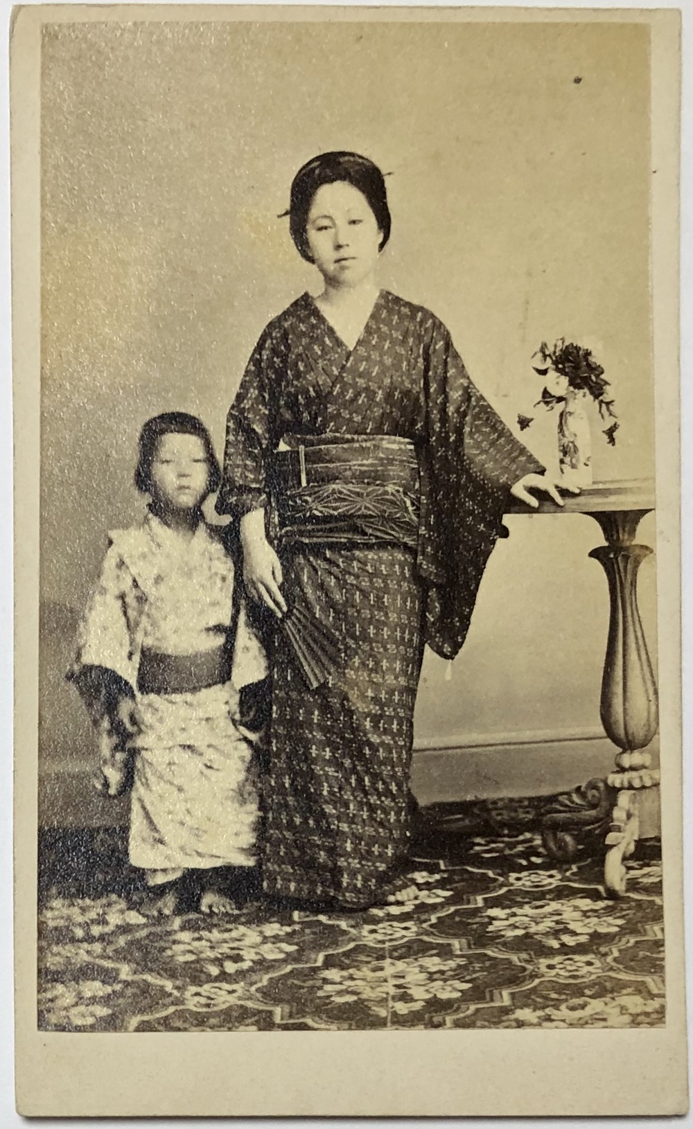 ③八戸喜三郎の妻(ハナさん)と子(台紙のサイズ:6.2 cm x 10.2 cm) 横浜で撮影 1868年