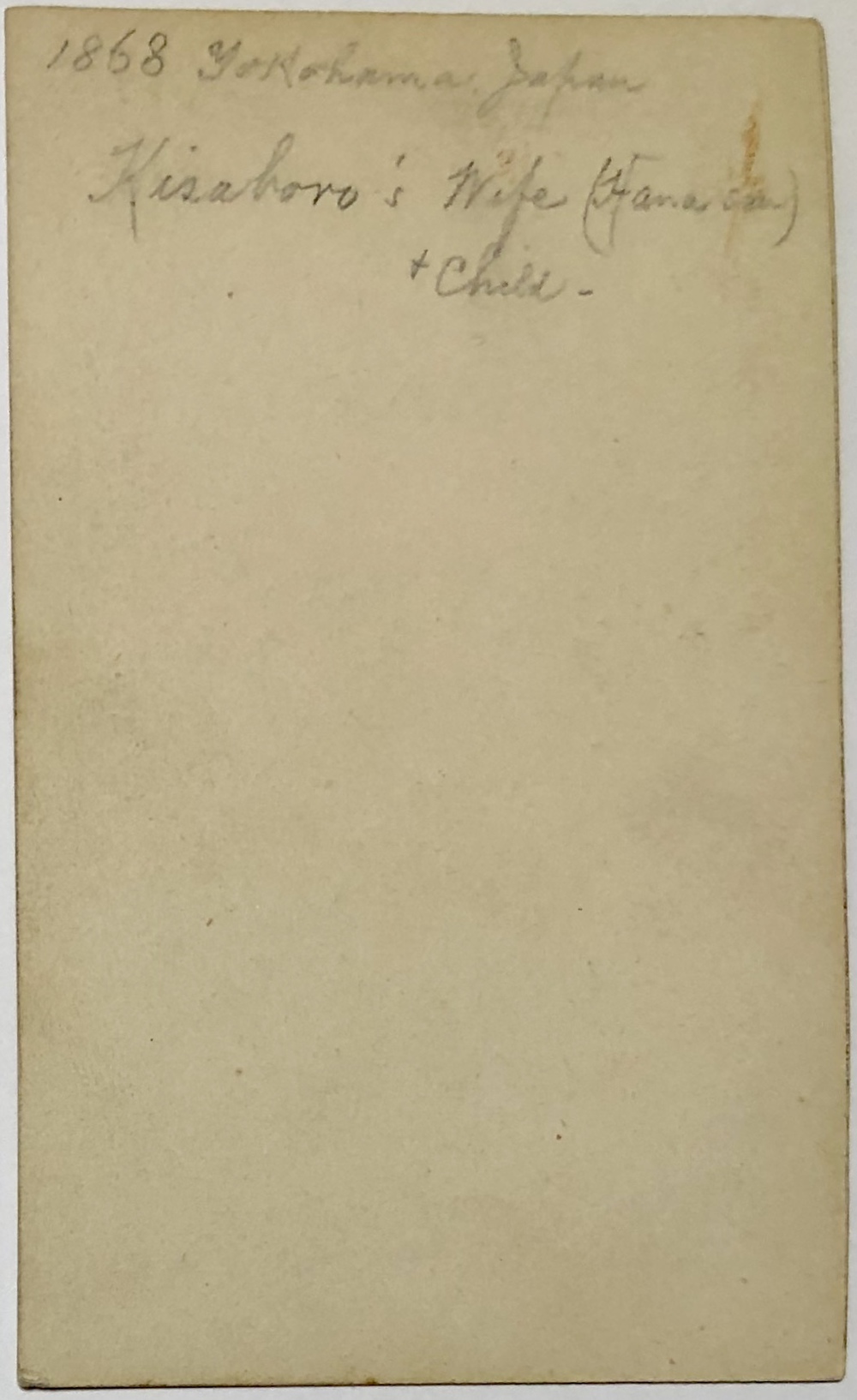 裏面に「1868 Yokohama, Japan. Kisaboro’s Wife(Hana san) + Child.」と鉛筆で書き込まれており、写っているのが喜三郎の妻子であること、1868年に横浜で撮影されたことがわかる。写真館の名称記載等はないが、1868年当時に横浜で活動していた写真館ということから推察が可能と思われる(現在調査中)。