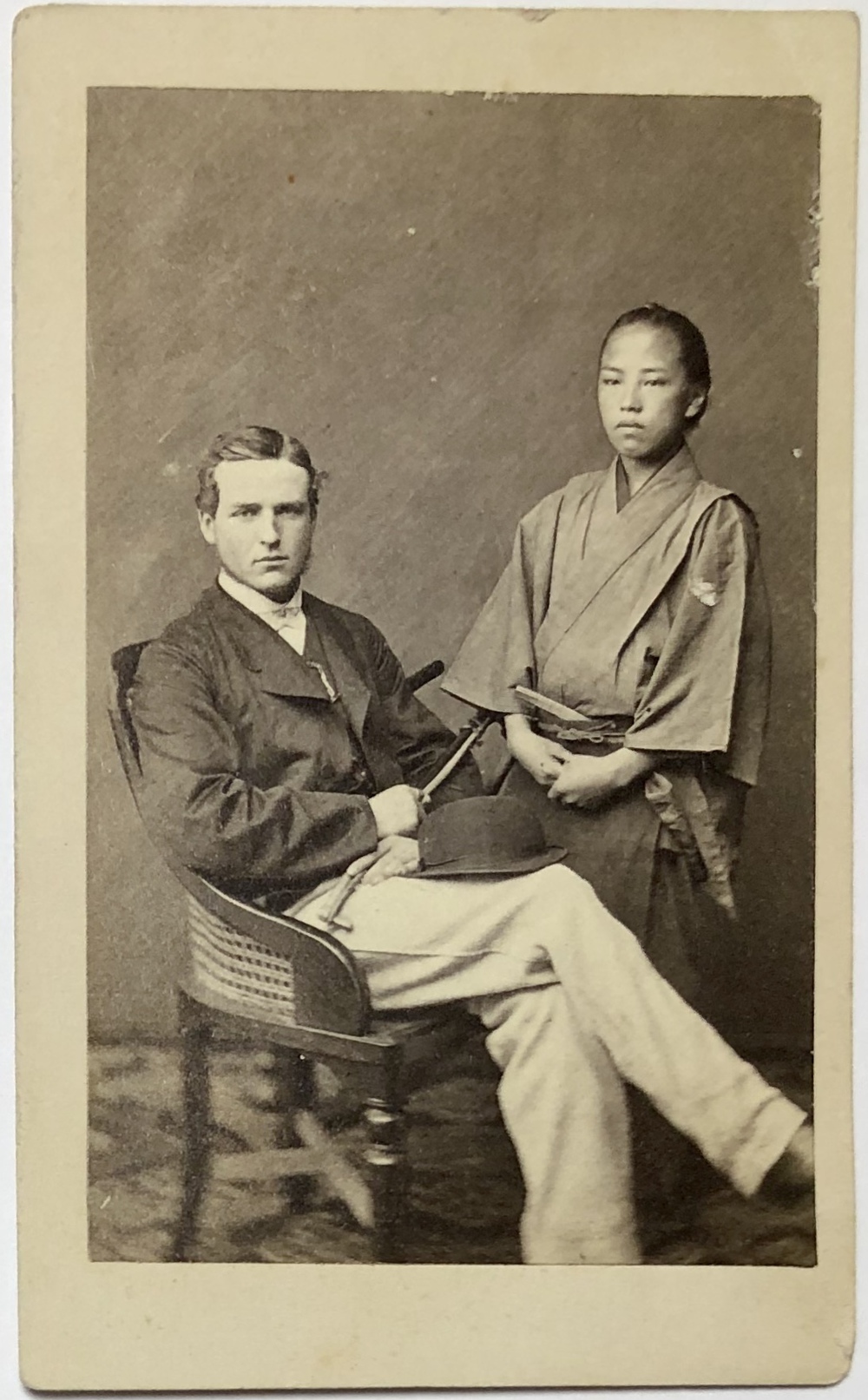 ⑤洋装の西洋人と和装の少年(台紙のサイズ:6.2 cm x 10.1 cm) 撮影地、撮影年不明
