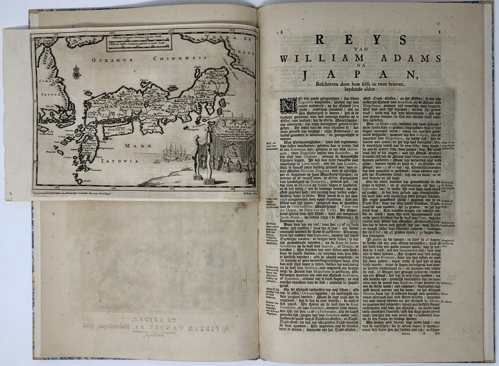 本書が取り扱うアダムズ(William Adams, 1654 - 1620)は、1600年に豊後に漂着した最初のイギリス人で、家康の外交顧問として日本に残り「三浦按針」という日本名と所領を与えられるという異例の待遇を受けた外国人として大変有名です。本書は、アダムズについて言及する際、必ずと言ってよいほど参照されることが多い、アダムズが日本からイギリスに宛てて認めた2通の書簡をオランダ語に翻訳して収録したものです。このオランダ語版は、アダムズが徳川家康に謁見する場面を描いた日本地図を収録した唯一の版で、各国語で紹介された「アダムズの書簡」の中でも極めて強い影響力を持ったと思われる書物です。