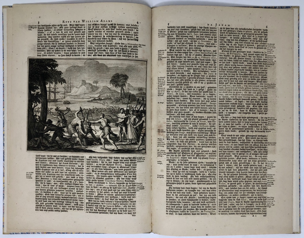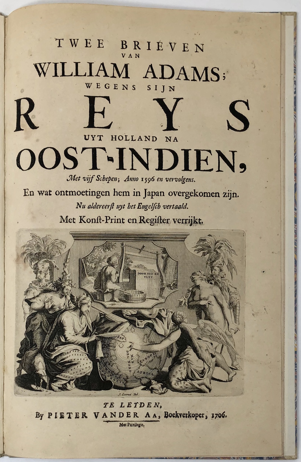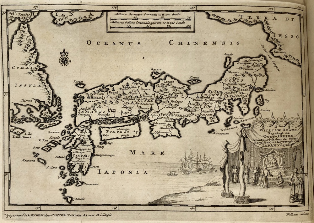 本書は、17世紀後半から18世紀初めにかけて活躍した当時のオランダを代表する出版社、編集人の一人であったアア(Pieter van der Aa, 1659 - 1733)がオランダ語に翻訳して出版したものです。アアは、17世紀までの世界の主要な航海、旅行記を網羅的に収録し、豊富な図版や地図とともにオランダ語で出版するという『ポルトガル、スペイン、イングランド、 その他の国々による航海、旅行記集成(De Aanmerkenswaardigste en Alomberoemde ZEE - EN LANDEREIZEN DER PORTUEEZEN, SPANJAARDEN, ENGELSEN EN ALLERHANDE NATIËN: ZOO VAN FRANSEN, ITALIAANEN, DEENEN, HOOGH-EN NEDERDUITSEN Als van beetle Andrew Volkeren. 8 vols.1706-1707)』(大型本)全8巻を刊行しました。この壮大な航海記集成の中にアダムズの書簡も収録されることになり、パーチャスの記事にはなかったアダムズを描いた地図を付してオランダ語に訳されました。このアアによる航海記集成は、アダムズの記事に限らず、オリジナルの資料にはない図版や地図をふんだんに新たに作成して収録している点に際立った特徴があり、本書にも日本地図とともに、アダムズが大坂で家康に接見する場面を描いたと思われる図版を採用しています。先述のようにアダムズが図版で登場するのは、それまで流布していたパーチャスの原著や英語版にはなかったことで、その結果、このオランダ語版が最も印象的な「アダムズの書簡」として記憶されることになり、現在の日本でも「アダムズの書簡」といえば、このアアによるオランダ語版が言及されることが多くなっています。