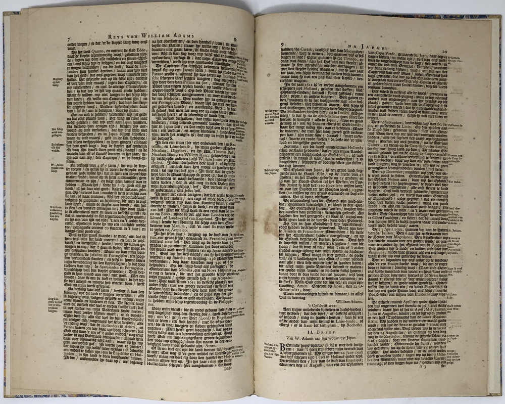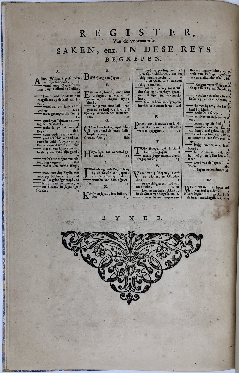 なお、アアの『旅行記集成』に収録された個別の航海期は、全ての記事がそれぞれ独立したタイトルページを有し、個別にページづけがなされているという、非常に珍しい形式をとっています。これは、個別の航海記を独立した単独の出版物としても、同時に刊行、分売していたことによるもので、当時の読者は、『旅行記集成』として全ての記事が収録された合冊本を購入するか、あるいは、自分の関心のある航海期だけを個別に購入するかを選ぶことができました。両者とも全く同じ内容のため、本書が元から個別に販売されたものか、あるいは『旅行記集成』に収録されたものが後年になって解体されて個別に再製本されたものかを区別することは不可能ですが、いずれにしても、「アダムズの書簡」を代表する作品であることに相違はありません。