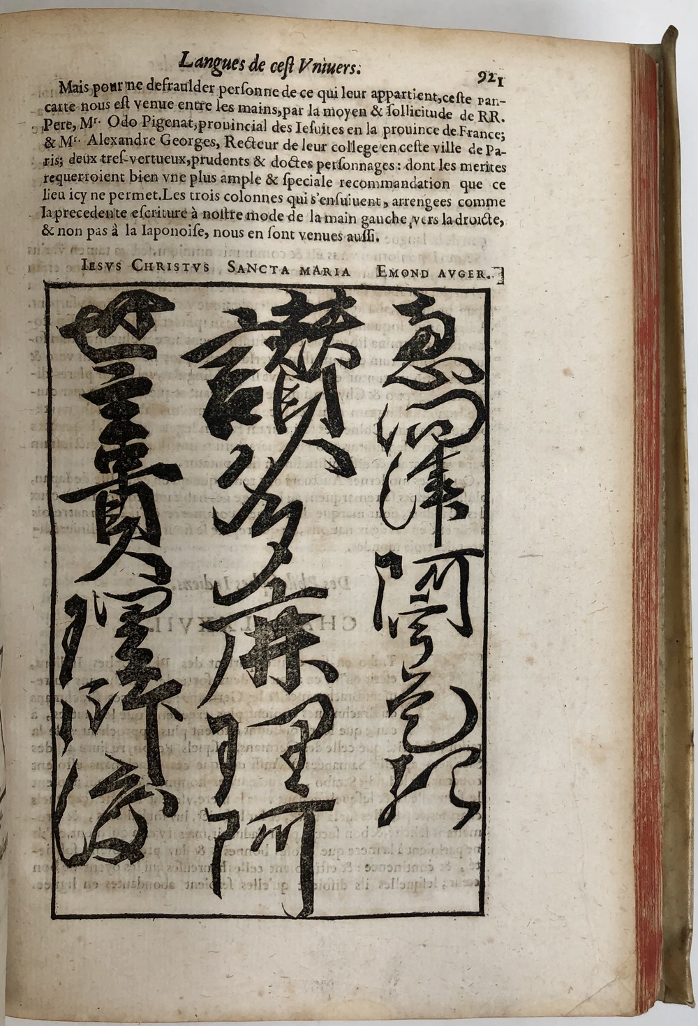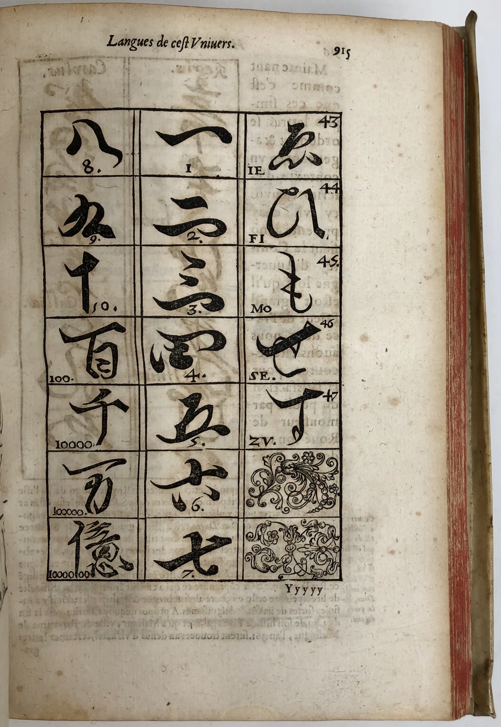 本書は、当時ヨーロッパで知られていた55の言語(に加えて動物の鳴き声までもを含む)を網羅的に論じたもので、細かな活字で版組みされた四つ折り判で千ページを越えるという非常に大部の著作です。1613年にケルンで刊行されたものですが、日本との関係で非常に興味深いのは、本書で検討されている55の言語の中に日本語が含まれており、大変貴重と思われる日本文字の翻刻とともに日本語が詳細に論じられていることです。日本文字の翻刻や日本語研究は、日本で宣教活動を行なっていたイエズス会によって精力的に進められていましたが、その成果は、当時のヨーロッパにおいて入手が容易でなかった日本で印刷されたいわゆる「キリシタン版」において主に発表されていました。従って、翻刻とともに詳細に本書に掲載された日本語研究は、ヨーロッパで広く読まれ得る書物において掲載された最初のものと言うことができると思われます。本書は、新村出によって昭和初期にその重要性が紹介されていた文献であるにも関わらず、その希少性も災いしてか、それ以降、国内では目立った研究がなされておらず、あたかもその存在すら忘れられてきた感のある稀覯資料です。