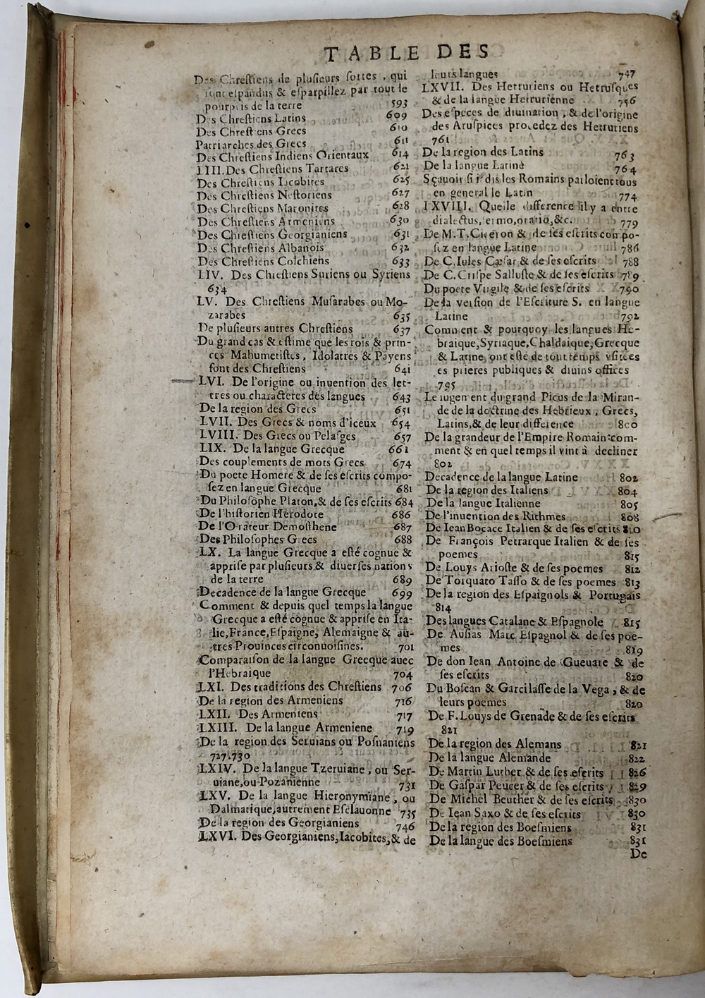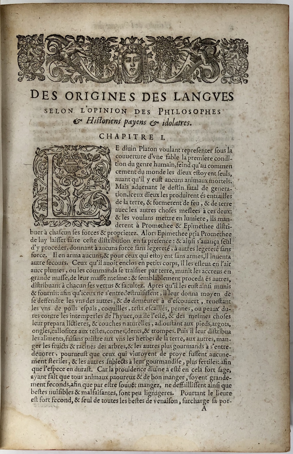 「『世界言語志宝典』とは仏国のクロード・デューレー Claude Duret が世界各国の言語凡そ五十数種について記載を試みた一千頁あまりの細字大冊本であって、諸国民族の言語文字文学の記述のほか、古文献に散見せる鳥獣の音声言辞までも書中に録してある。記述は仏文である。著者はムーランの人で博物家にして博言家を兼ね、土地の法院の学頭などをしたというだけの外、伝記を私は知らない。歿時は1611年9月すなわち我が慶長十六年だということが明らかである。(中略)本題は、THRESOR DE L’HISTOIRE DES LANGUES DE CEST UNIVERS というが、今訳して『世界言語志宝典』とした。私が見た両伊藤本は共に1619年の再版本であるが、初版は1613年に出ている。その初版本は未見であるが、コロンで印刷したらしく、再版本は瑞西のイヴェルドンで印行されたのであった。」