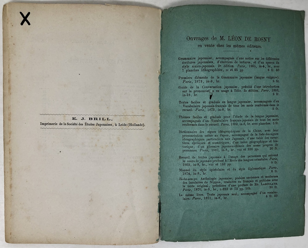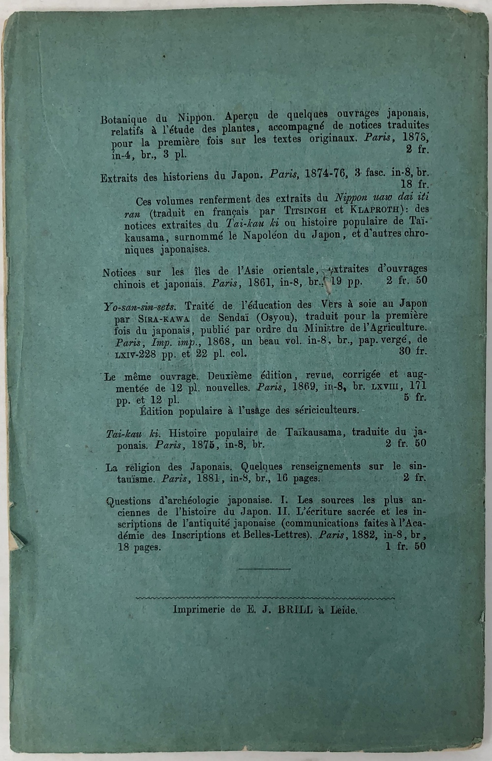 Maisonneuve Frères & Ch. Leclerc. (E. J. Brill, Imprimerie de la Société des Études Japonaises, à Leide (Hollande).),