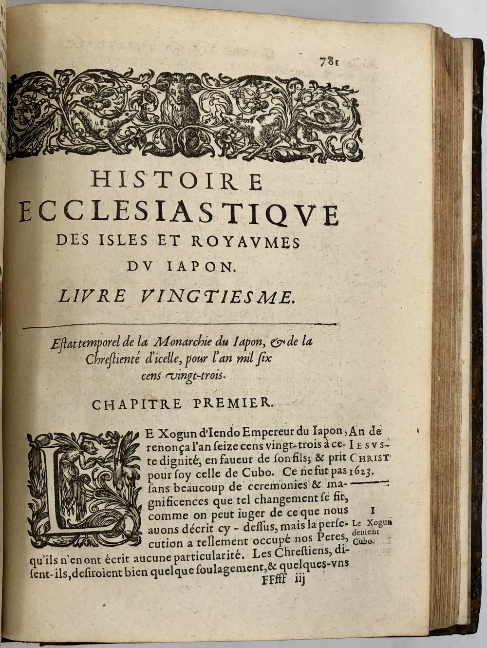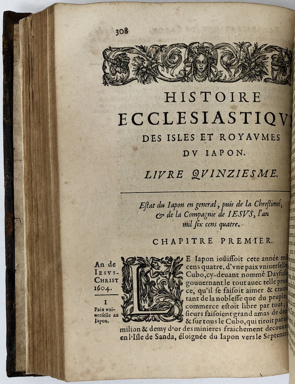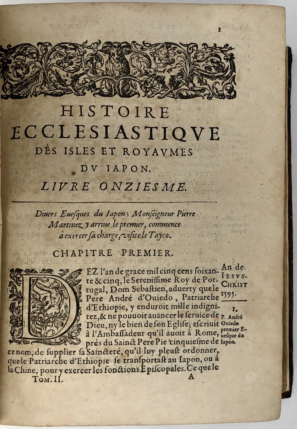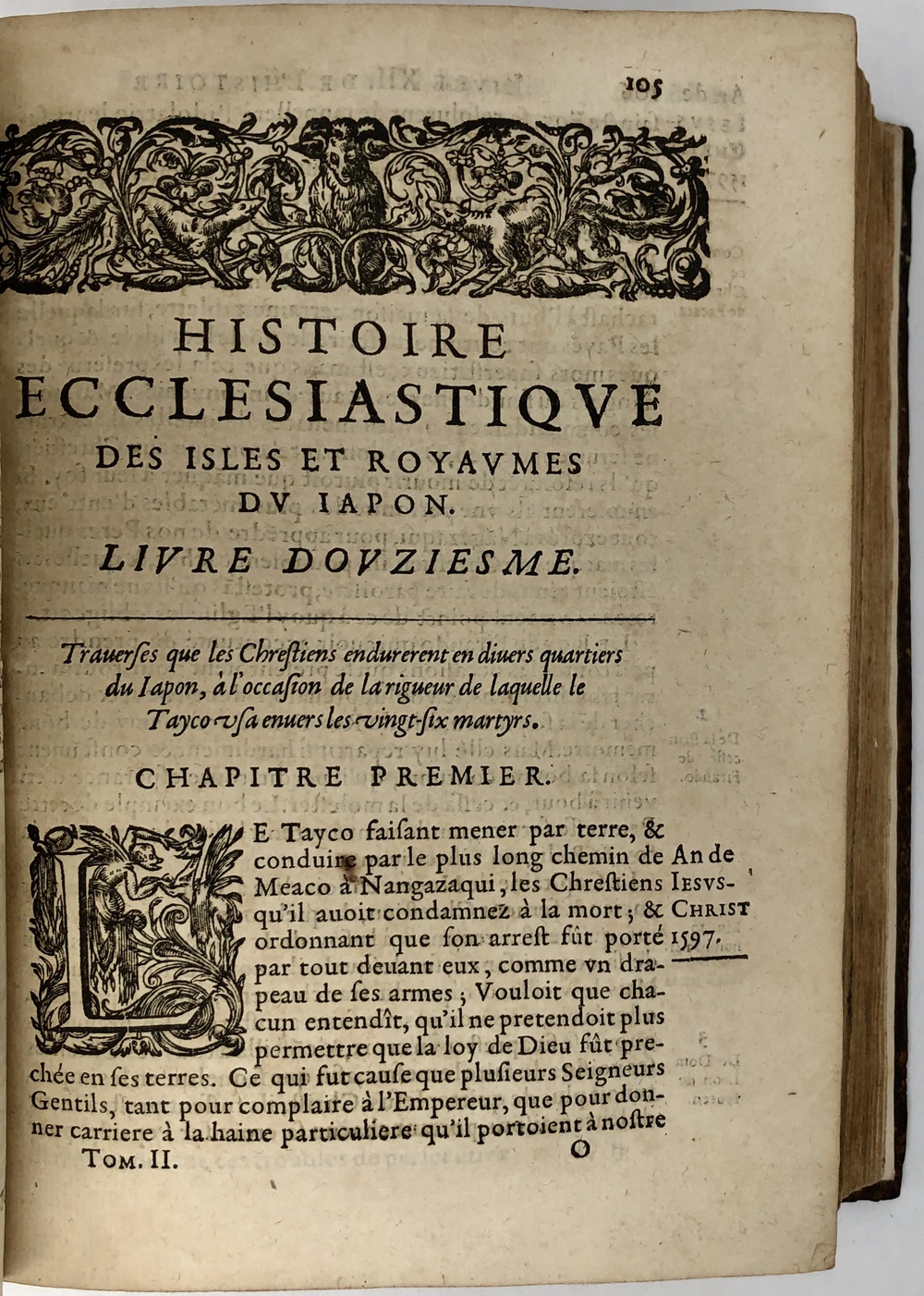 本書は、ソリエ(François Solier, 1558 - 1638)によって著された、ザビエル来航の1549年から(当時の)現代(1624年)までの日本におけるイエズス会のあらゆる活動と、日本社会の様々な動向が記された書物です。全2巻、合計1,800ページほどにもなる大部の著作で、17世紀前半に刊行された「日本教会史」としては最大の量と最高の質を誇る書物として、現代でも高く評価されている名著です。1627年に第1巻が、そして1629年に第2巻が刊行されていますが、いずれも現在では稀覯文献とされており、特に第2巻は、国内のみならず世界的に見ても残存数がきわめて少ないことで知られています。