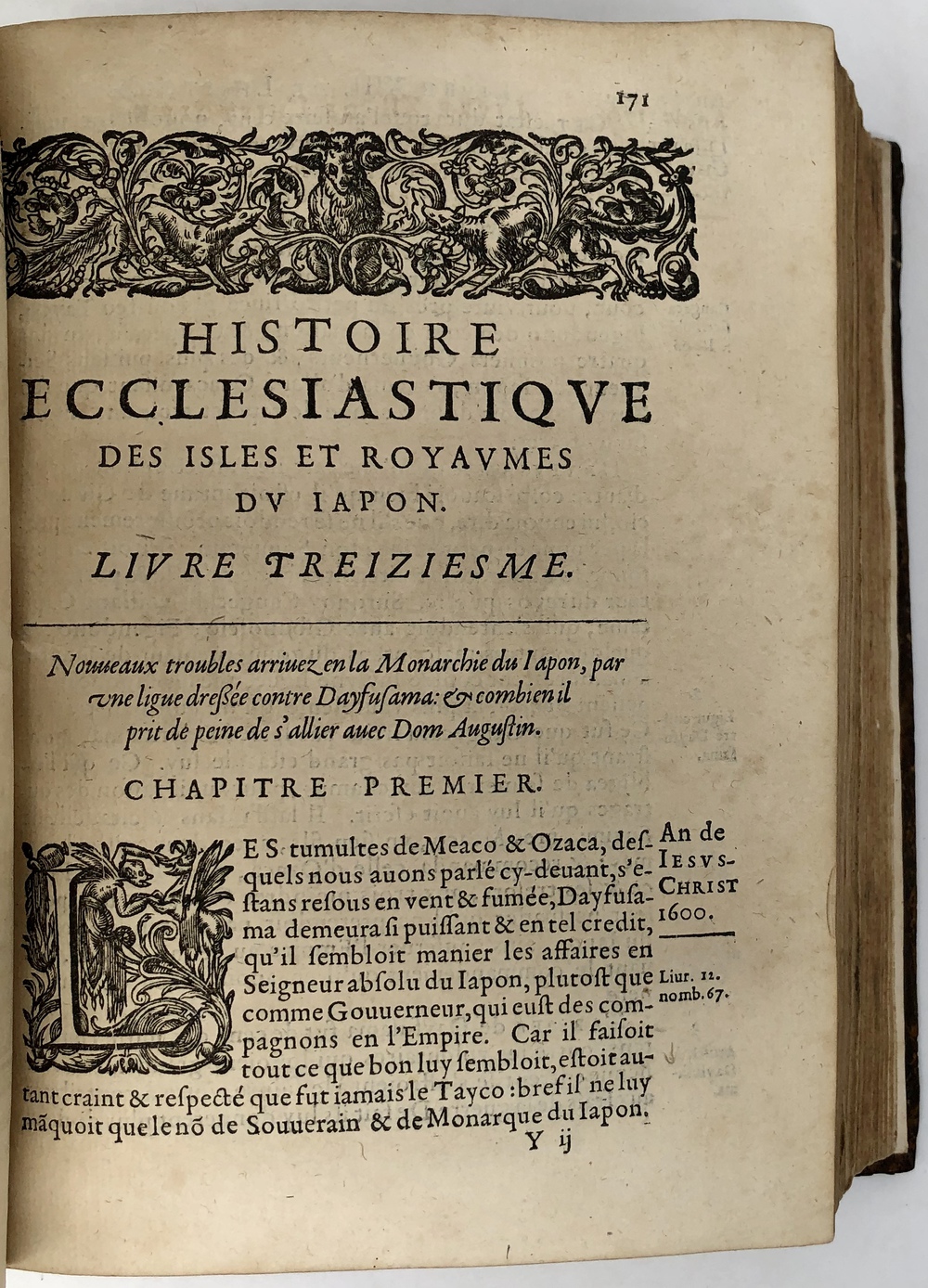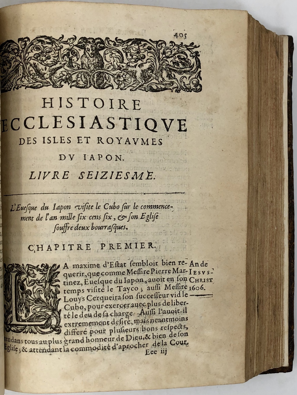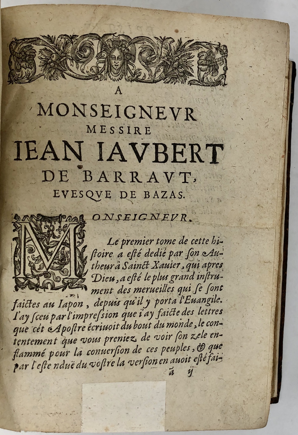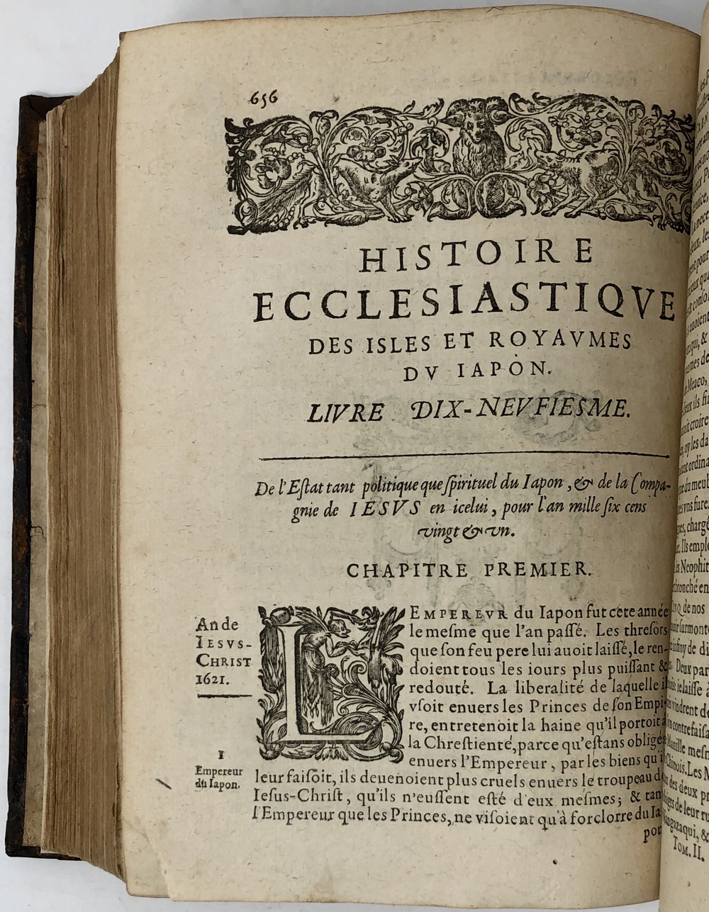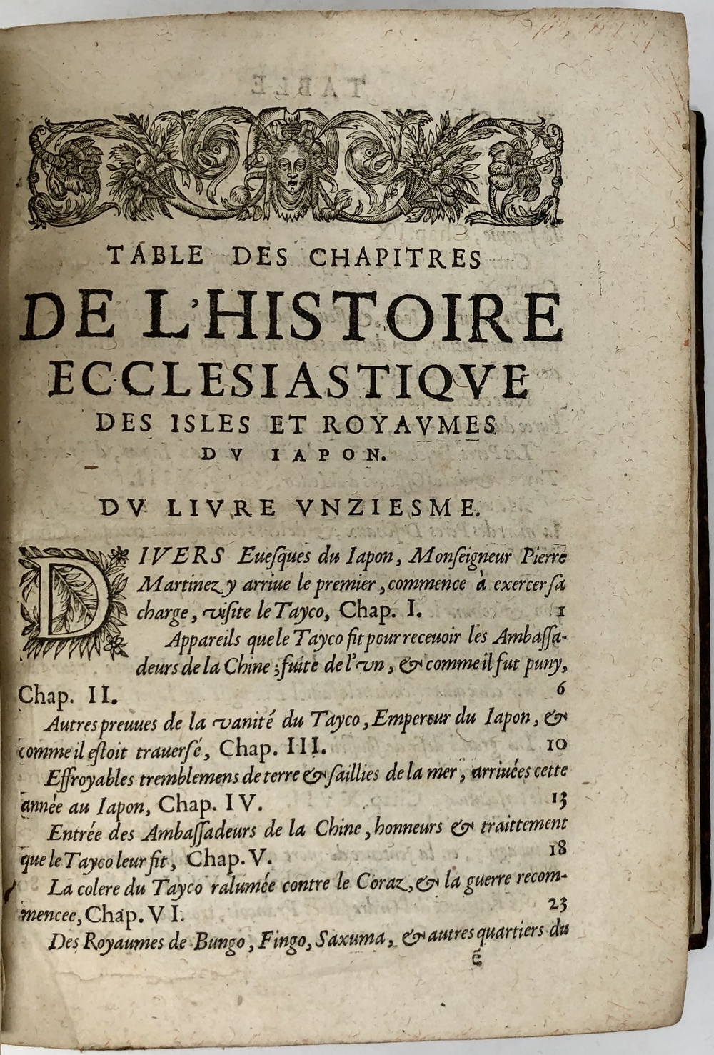 本書は、ソリエ(François Solier, 1558 - 1638)によって著された、ザビエル来航の1549年から(当時の)現代(1624年)までの日本におけるイエズス会のあらゆる活動と、日本社会の様々な動向が記された書物です。全2巻、合計1,800ページほどにもなる大部の著作で、17世紀前半に刊行された「日本教会史」としては最大の量と最高の質を誇る書物として、現代でも高く評価されている名著です。1627年に第1巻が、そして1629年に第2巻が刊行されていますが、いずれも現在では稀覯文献とされており、特に第2巻は、国内のみならず世界的に見ても残存数がきわめて少ないことで知られています。