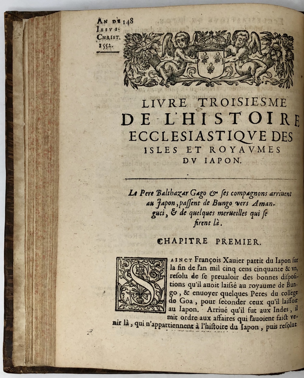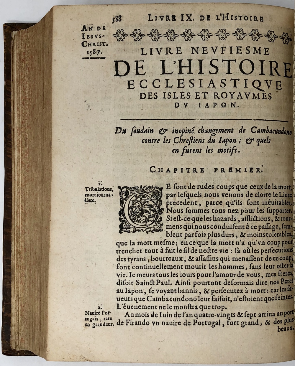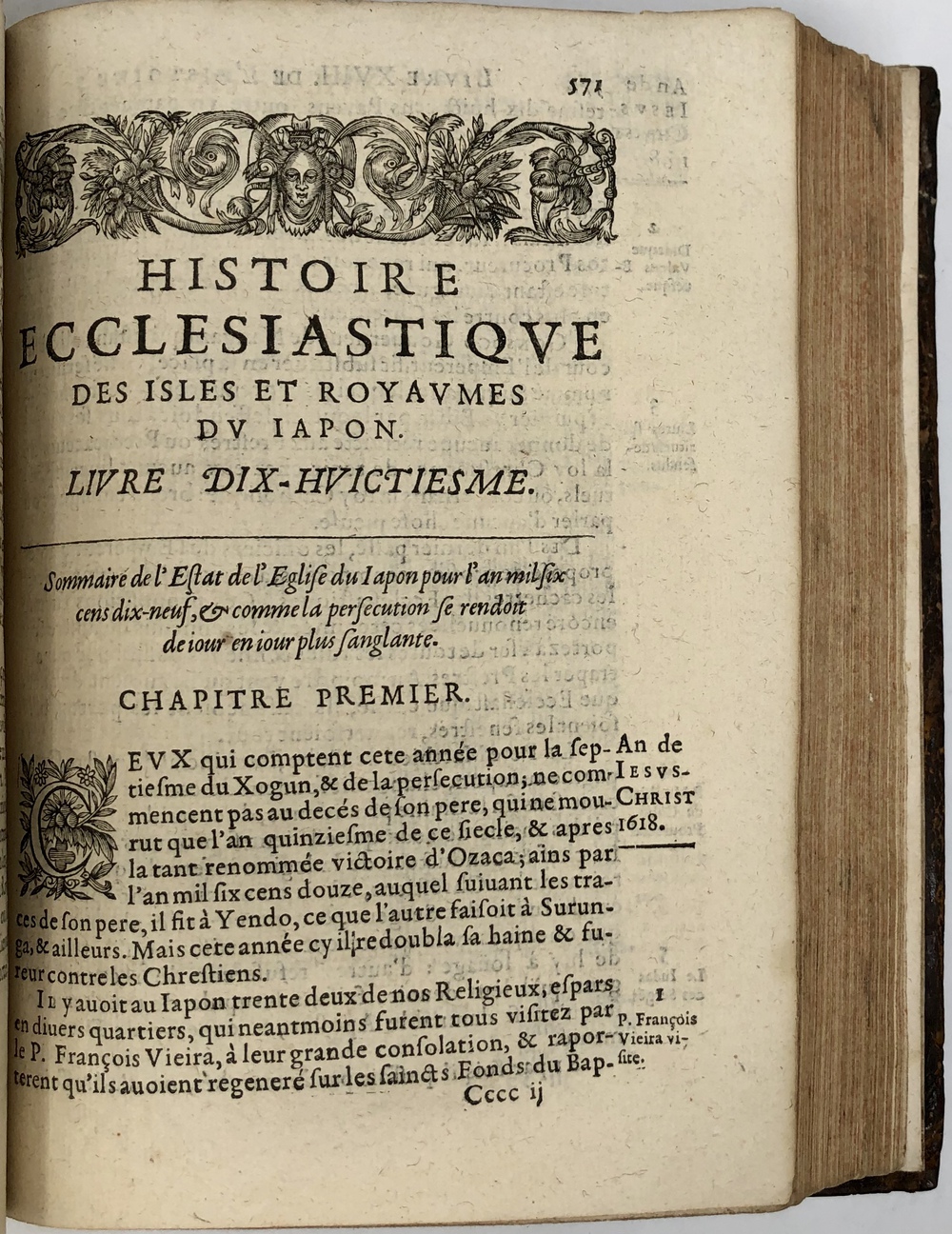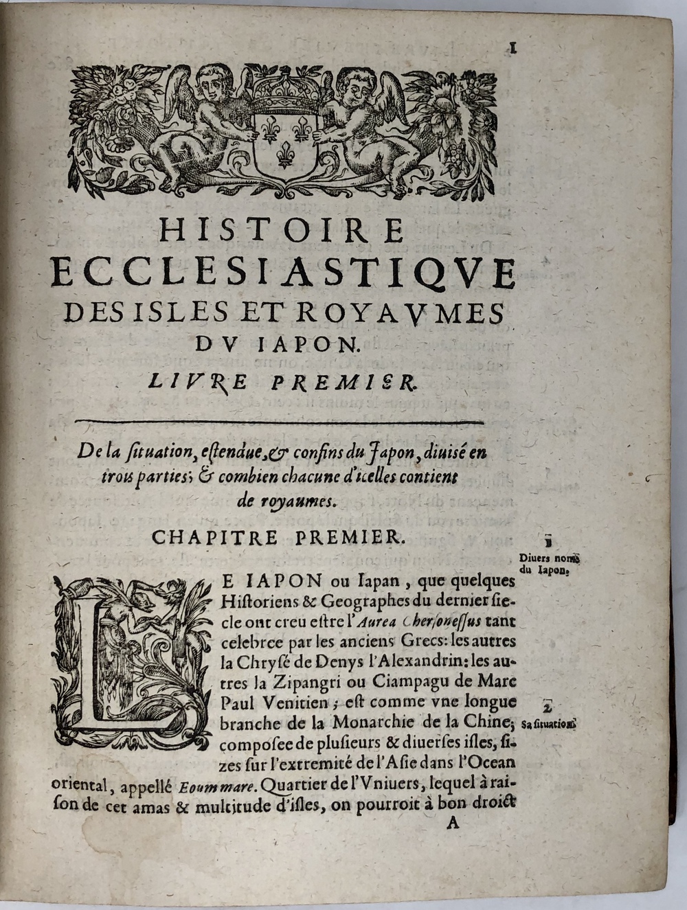 本書は、ソリエ(François Solier, 1558 - 1638)によって著された、ザビエル来航の1549年から(当時の)現代(1624年)までの日本におけるイエズス会のあらゆる活動と、日本社会の様々な動向が記された書物です。全2巻、合計1,800ページほどにもなる大部の著作で、17世紀前半に刊行された「日本教会史」としては最大の量と最高の質を誇る書物として、現代でも高く評価されている名著です。1627年に第1巻が、そして1629年に第2巻が刊行されていますが、いずれも現在では稀覯文献とされており、特に第2巻は、国内のみならず世界的に見ても残存数がきわめて少ないことで知られています。