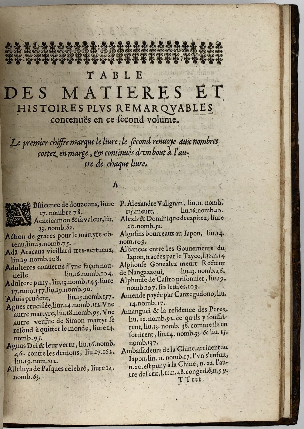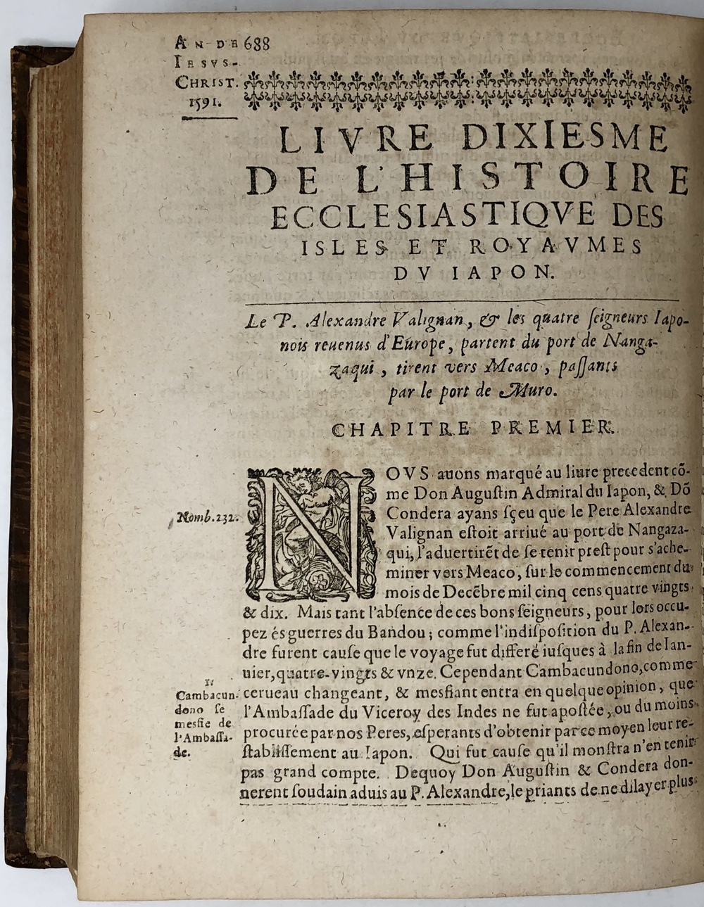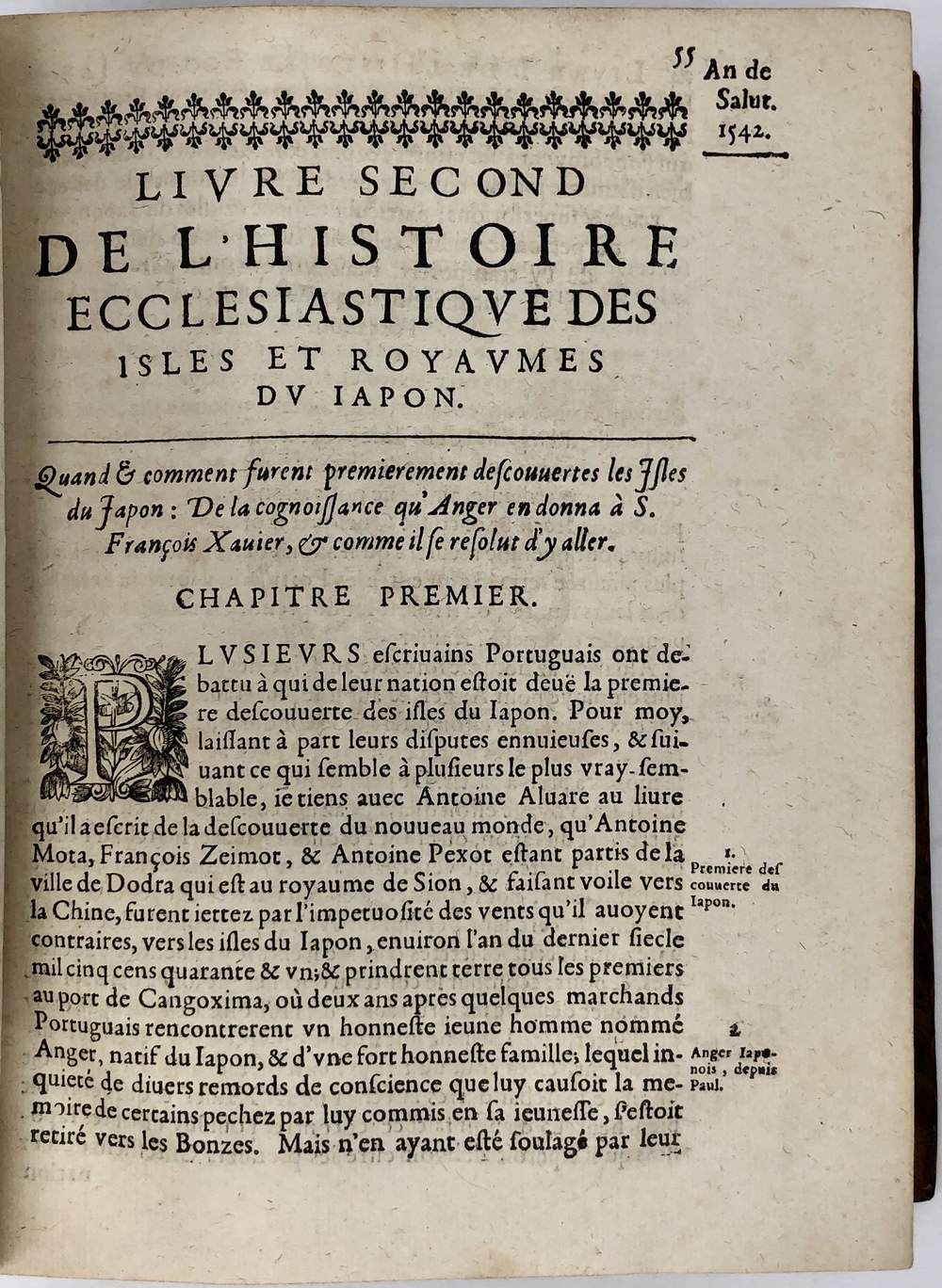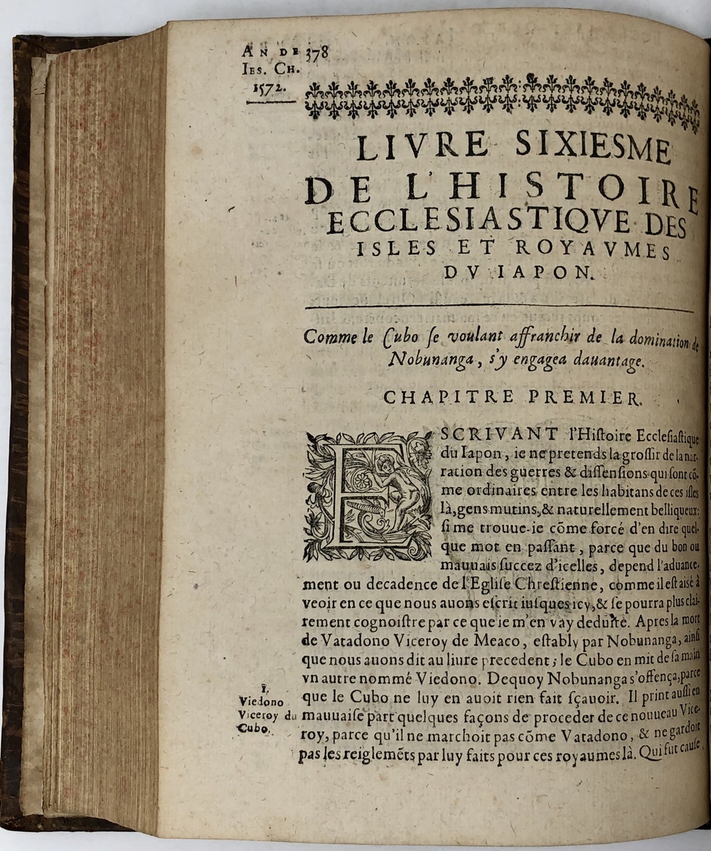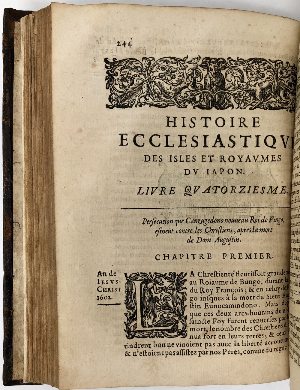 本書は、ソリエ(François Solier, 1558 - 1638)によって著された、ザビエル来航の1549年から(当時の)現代(1624年)までの日本におけるイエズス会のあらゆる活動と、日本社会の様々な動向が記された書物です。全2巻、合計1,800ページほどにもなる大部の著作で、17世紀前半に刊行された「日本教会史」としては最大の量と最高の質を誇る書物として、現代でも高く評価されている名著です。1627年に第1巻が、そして1629年に第2巻が刊行されていますが、いずれも現在では稀覯文献とされており、特に第2巻は、国内のみならず世界的に見ても残存数がきわめて少ないことで知られています。