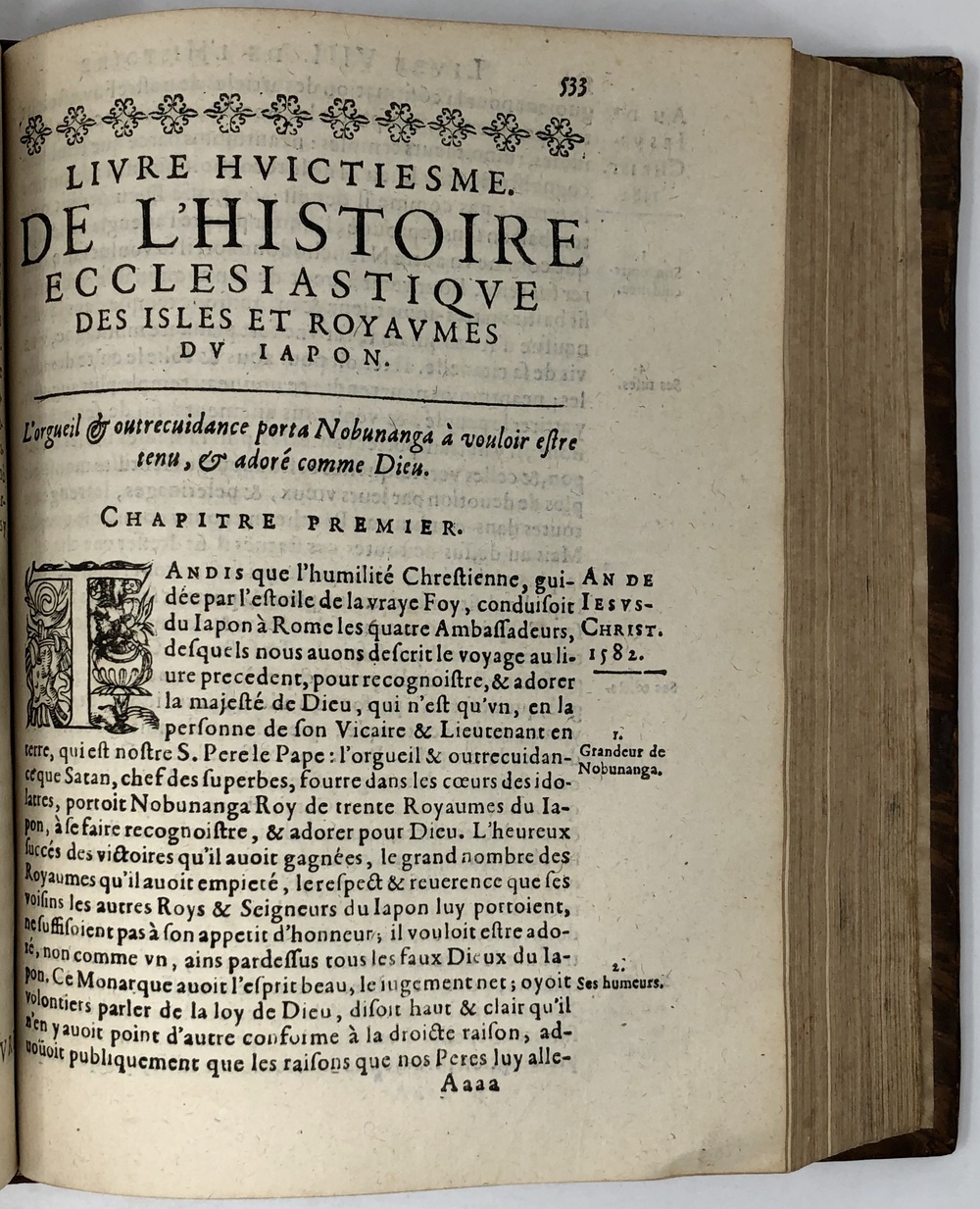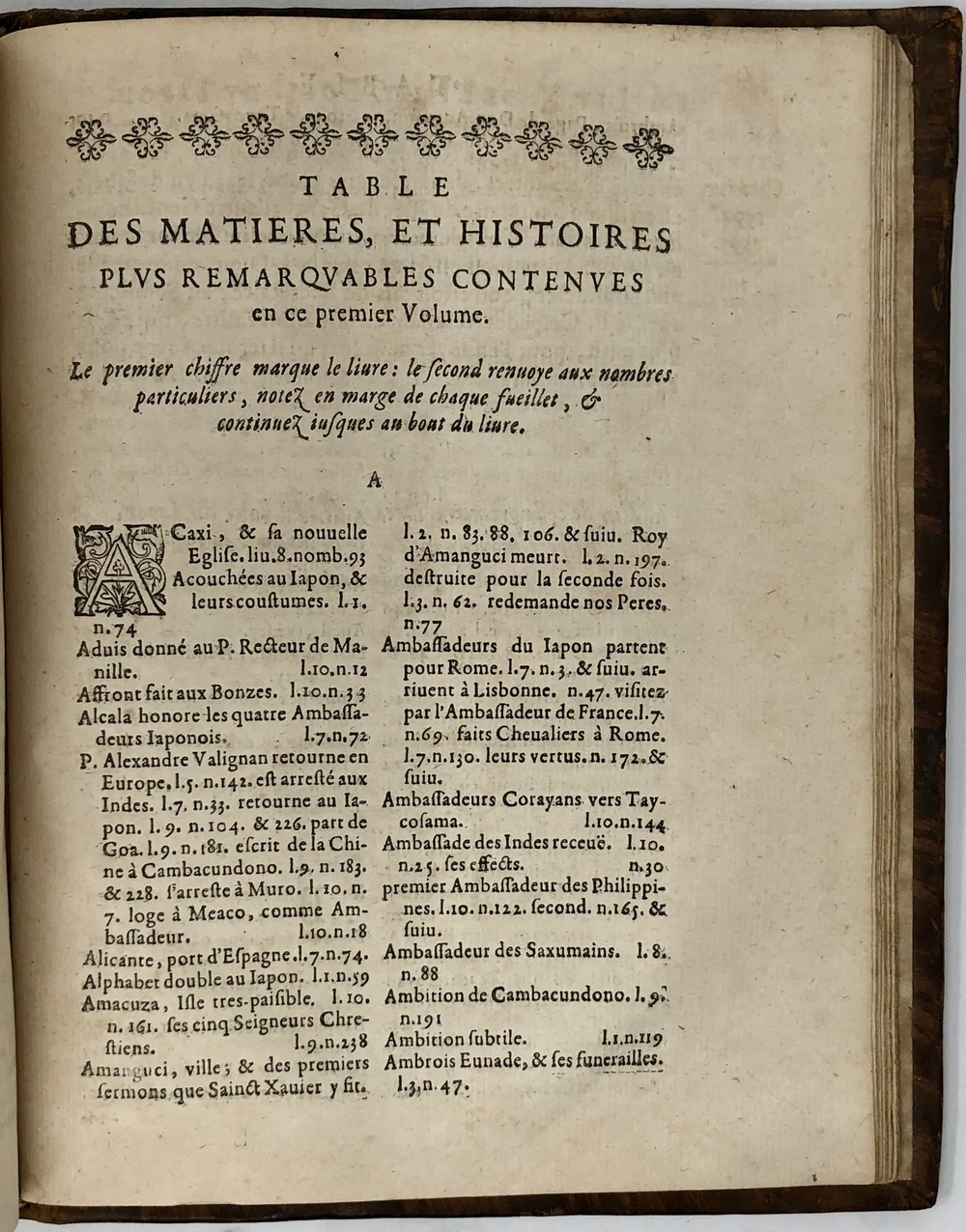 著者ソリエは、イエズス会の神父としてリモージュのコレッジで教鞭をとる傍ら、数多くの歴史書、神学書を著したことで知られています。当時のイエズス会における最高峰の水準にあった学者でもあり、イエズス会が発行、所蔵する膨大な史料にアクセスすることが可能であった著者によって著された本書は、その記述が、浩瀚かつ史料によって裏付けられた質の高い内容を誇っています。序文において彼が述べているように、当時入手可能であった数多くの史料を用いて本書は執筆されており、毎年の活動を記録、公刊した日本年報や、それらをまとめた書簡集などに加え、当時から名著の誉れが高かったグスマン(Luis de Guzmán, 1544 - 1605)の『東方布教史(Historia de las missiones que han heco los religiosos de la Compañia de Iesus,...2 vols. Alcala, 1602)』を参照しています。『東方布教史』は1601年に刊行されているため、16世期末までの記述で終わっていますが、その年代を現代にまで延ばし、さらに多くの史料を用いて記述を全面的に改めることで、本書は当時のヨーロッパで得ることのできる最高水準の日本情報を提供する欧文史料となりました。
