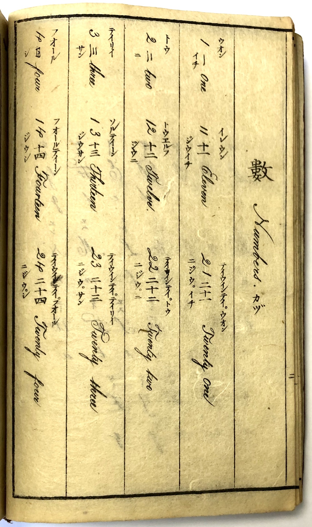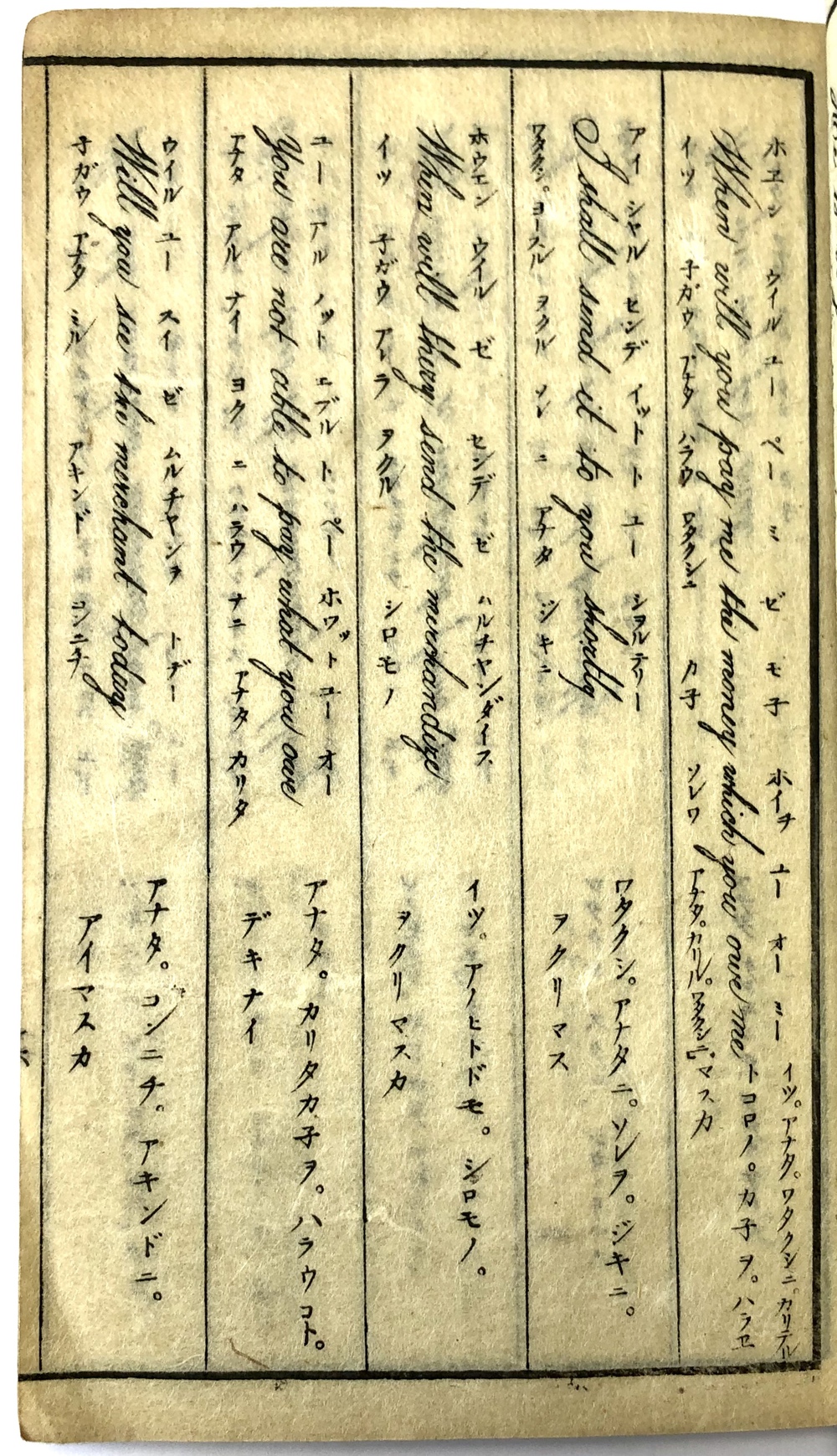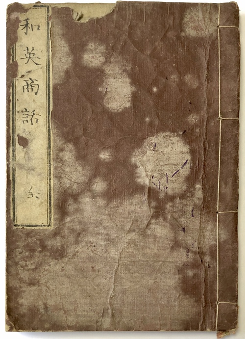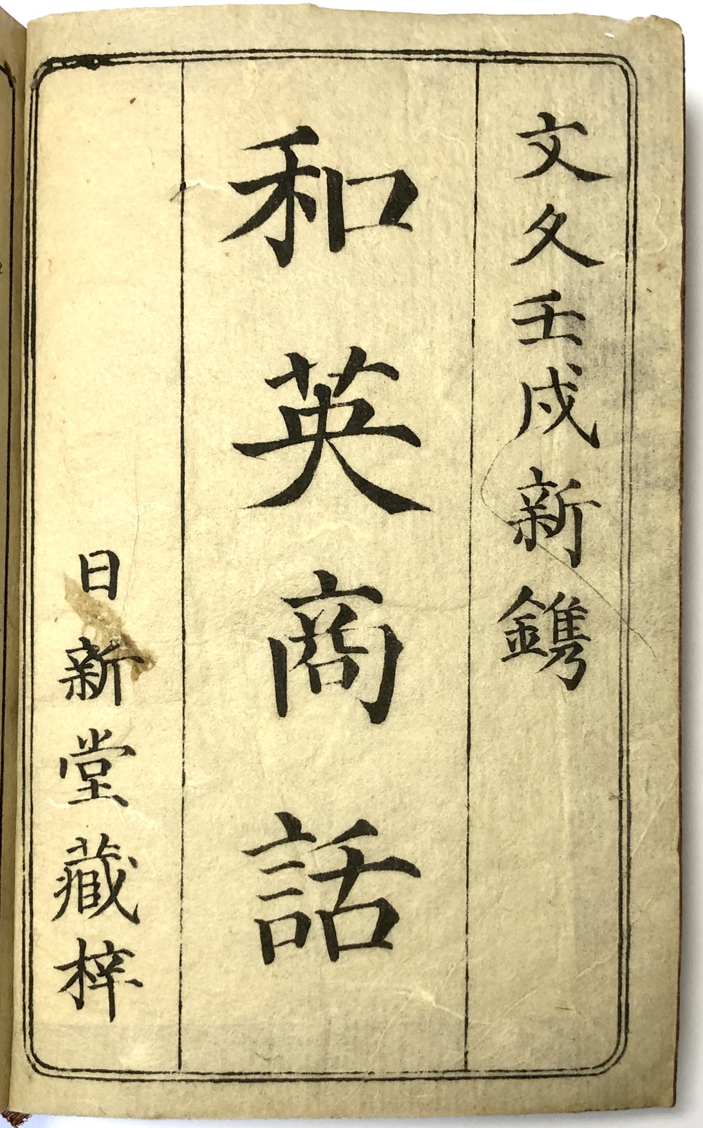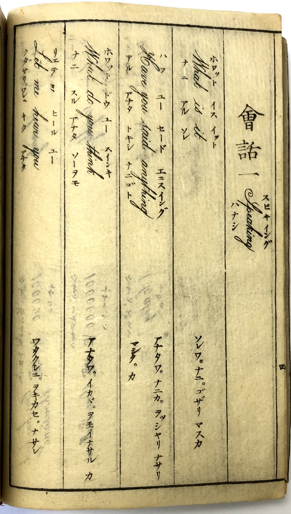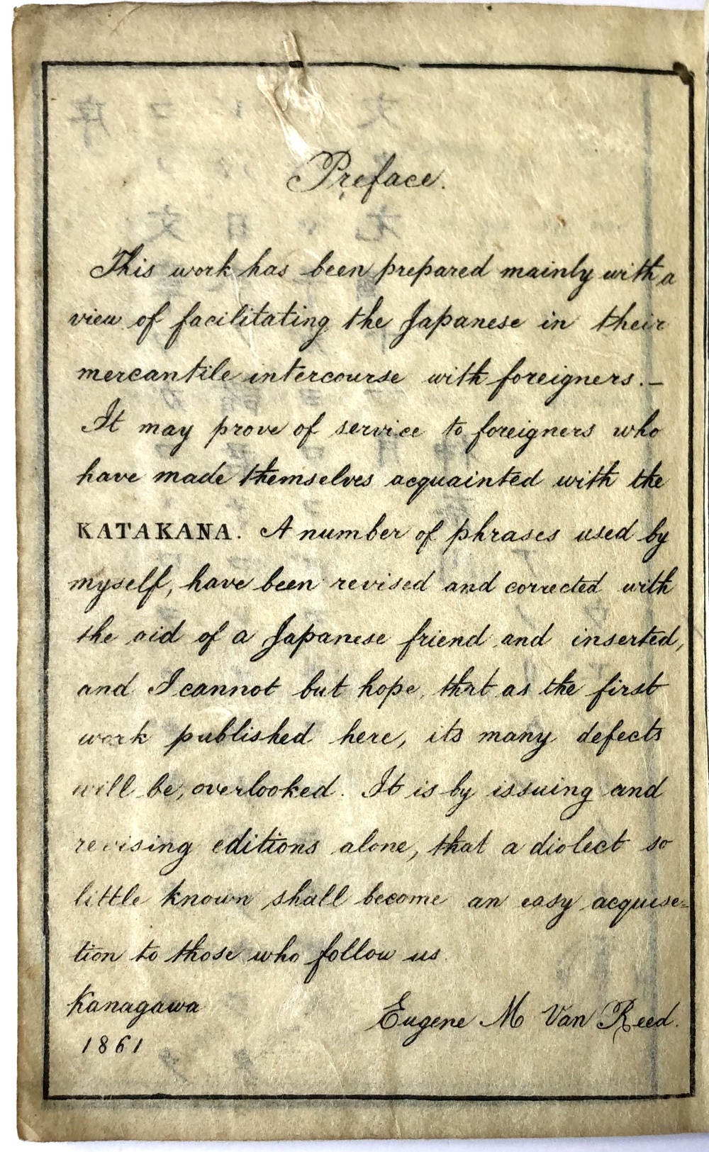 本書は、横浜在住のアメリカ人ファン・リード(Eugene Miller Van Reed, 1835 - 1873)が、横浜居留地で日々行われている商取引に際して必要と思われる日本語と英語のフレーズをまとめたもので、日本語話者を対象とすると同時に、カナ文字を英文と併記することで、英語話者の外国商人にとっても助けとなるように工夫して作成されています。1862年に刊行されており、英会話書としてはかなり早い時期の作品で、しかも横浜在住の外国人によって書かれているという、幕末の東西交流が生んだ大変ユニークな書物です。 ファン・リードは、その名前から分かるようにオランダ系のアメリカ人で、浜田彦蔵(ジョセフ・ヒコ)と出会ったことをきっかけに日本に関心を抱き、1859年にアメリカ総領事館付きの書記生として来日しました。来日してからはハード商会の社員として活動したほか、本書や簡便な商用英語教本である『和英商話』を著すなど文化活動においても精力的な活躍を見せ、幕末から明治初期に日本に滞在した外国人の中でも一際目立つ存在だったと言われています。また、1868年のイギリス船によるハワイ移民(明治元年であったことから「元年者」と呼ばれる)斡旋の企画者として、明治政府と対立しながら移民移送を強行したことでも知られており、こうしたことも災いしてか後年の彼に対する評価は毀誉褒貶が激しいものになっています。ただし、同時代の新聞や書物においては概ね好意的な評が多かったようで、例えば下記のような記事があります。 「(前略)当時、横浜で発行されていた『萬国新聞紙』には、「リードは生まれつき純善正直なれば、交る人々皆親しみ愛す」とあり、文久2年(1862)刊の『横浜開港見聞誌』には、「ウェンリイトなる人は、日本風薄鼠、細き蛇の日傘を用ゆ。夏の日でんちゅう笠を用ゆ。」「馬にくら置いてしとしと自分館中広き所にて日本風に強くしずかに乗まわす。」などの姿を紹介し、また、文久3年刊の『珍事横浜噺』には、「亜米利加人ウインリウトと申すは商人なり。日本の身ぶり、こわいろにて交わり、いたって通人なり」とある。横浜居留の外人のなかでは、かなり異彩をはなった存在であったらしい。」 (高橋辰雄「ヨコハマの名物男ヴァン・リード」日本英学史学会編『英学事始』エンサイクロペディアブリタニカ(ジャパン)インコーポレーテッド、1976年所収、130,131頁より) 序文は英文で書かれており、本書が日本と外国の双方の人々にとって有用となることを願って著された旨が記されており、英文序文の裏面にある日本語序文では、ごく簡単に「この文章我が心を砕きしたためれば、日本の諸君子、これをまなびつうじたまはば、予が、よろこぶこと、これにすぎず。」と書かれています。冒頭には、アルファベットとイロハの一覧があり、商取引において最も重要であったと思われる数字の案内に続いて、様々な会話文例が掲載されています。いずれも、カタカナでの発音と英文、各単語のカタカナで記された日本語訳、そして文章での日本語訳が併記されています。たとえば、冒頭の文例には次のようにあります。 ホワット イス イット What is it ナニ アル ソレ 「ソレワ、ナニ、ゴザリマスカ」 文例はごく簡単な挨拶、商取引の場面で使われるであろう文例が中心で、実際に商人であったファン・リード自身の豊富な経験を反映したもので、「海外ビジネス・とっさの一言」と言える内容です。当時の横浜で用いられていた英語だけでなく、ファン・リードのような外国人が実際に耳にした日本語を記していることから、「横浜ピジン日本語」と呼ばれる当時の横浜の商用話し言葉を知る手掛かりにもなる大変興味深い書物と言えるでしょう。
