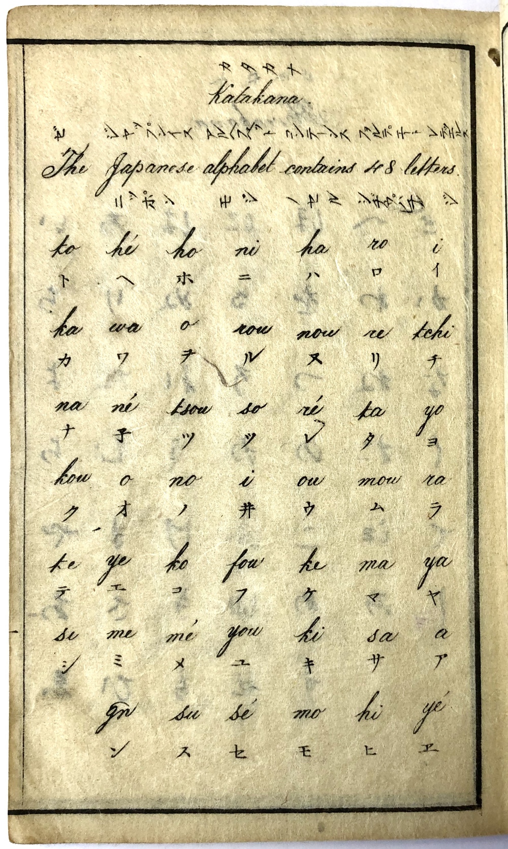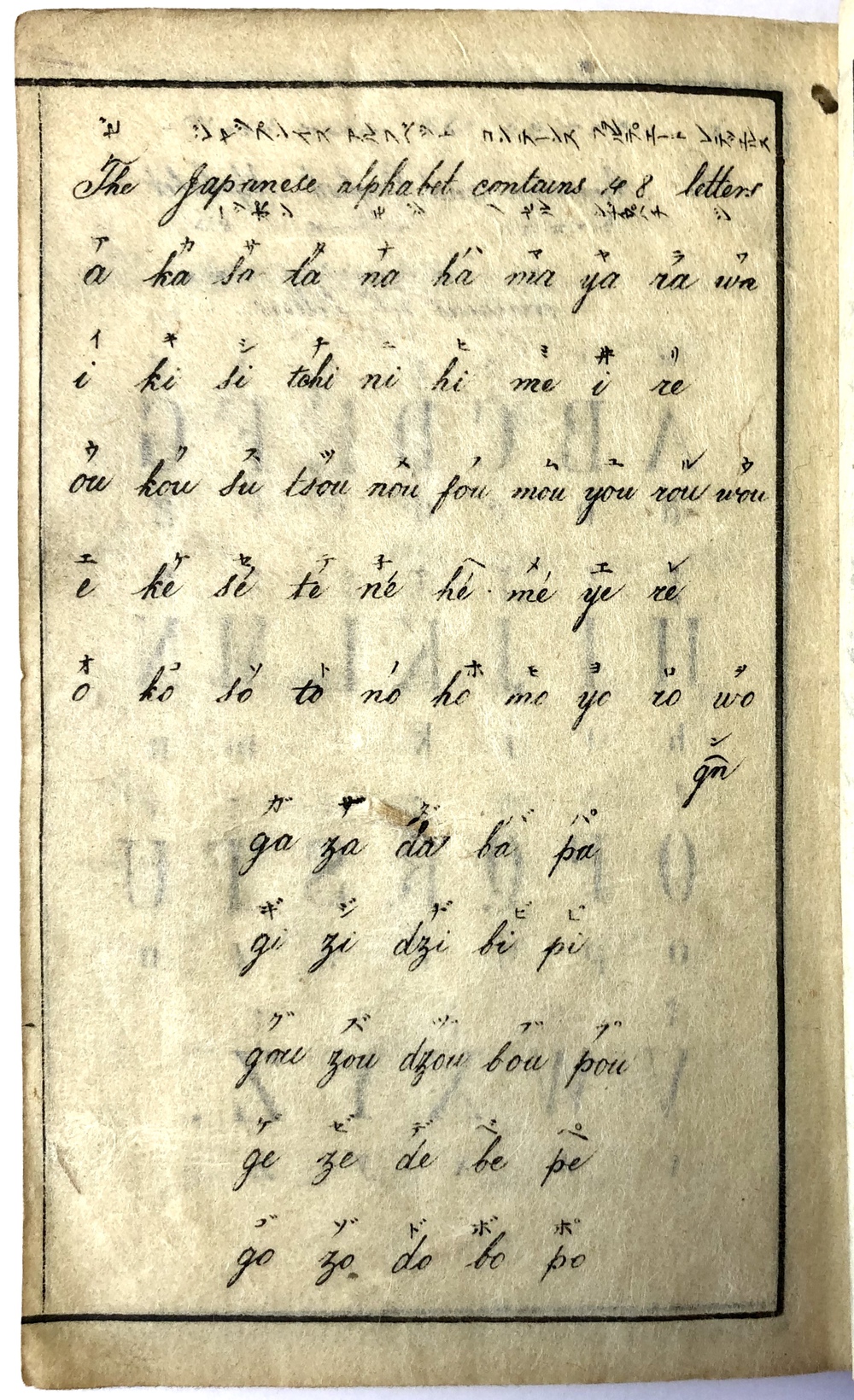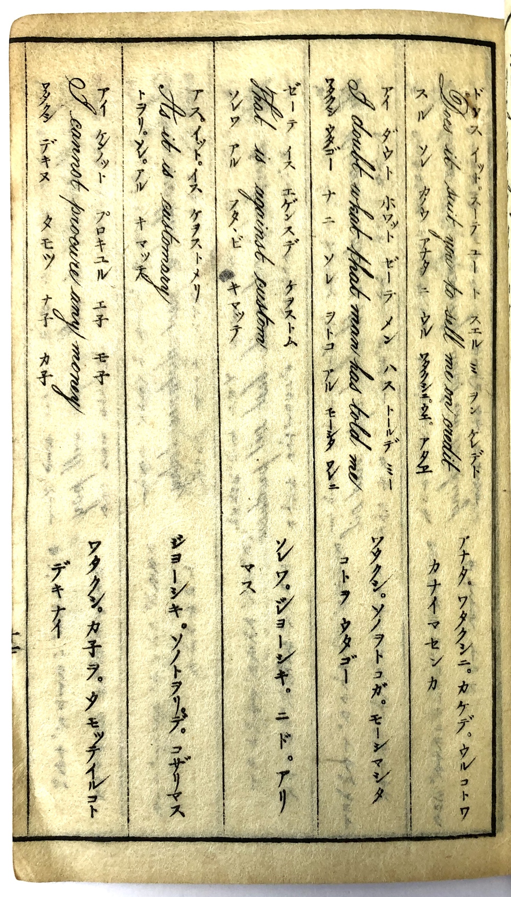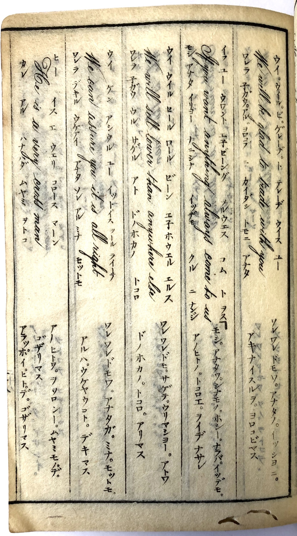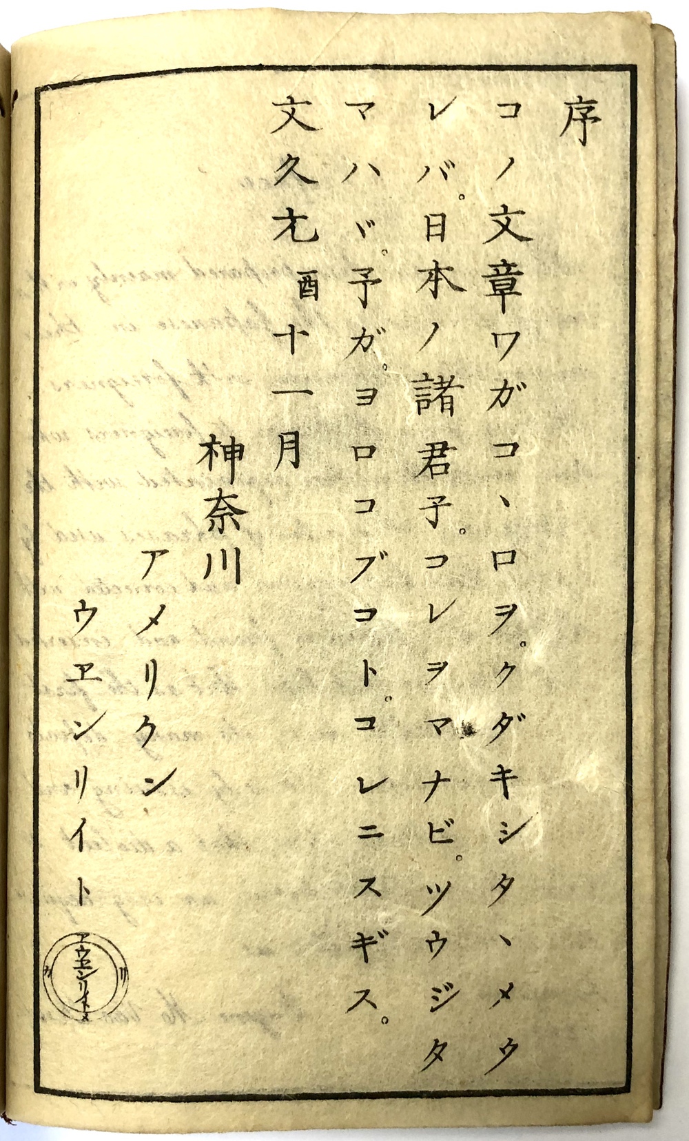 本書は、横浜在住のアメリカ人ファン・リード(Eugene Miller Van Reed, 1835 - 1873)が、横浜居留地で日々行われている商取引に際して必要と思われる日本語と英語のフレーズをまとめたもので、日本語話者を対象とすると同時に、カナ文字を英文と併記することで、英語話者の外国商人にとっても助けとなるように工夫して作成されています。1862年に刊行されており、英会話書としてはかなり早い時期の作品で、しかも横浜在住の外国人によって書かれているという、幕末の東西交流が生んだ大変ユニークな書物です。 ファン・リードは、その名前から分かるようにオランダ系のアメリカ人で、浜田彦蔵(ジョセフ・ヒコ)と出会ったことをきっかけに日本に関心を抱き、1859年にアメリカ総領事館付きの書記生として来日しました。来日してからはハード商会の社員として活動したほか、本書や簡便な商用英語教本である『和英商話』を著すなど文化活動においても精力的な活躍を見せ、幕末から明治初期に日本に滞在した外国人の中でも一際目立つ存在だったと言われています。また、1868年のイギリス船によるハワイ移民(明治元年であったことから「元年者」と呼ばれる)斡旋の企画者として、明治政府と対立しながら移民移送を強行したことでも知られており、こうしたことも災いしてか後年の彼に対する評価は毀誉褒貶が激しいものになっています。ただし、同時代の新聞や書物においては概ね好意的な評が多かったようで、例えば下記のような記事があります。 「(前略)当時、横浜で発行されていた『萬国新聞紙』には、「リードは生まれつき純善正直なれば、交る人々皆親しみ愛す」とあり、文久2年(1862)刊の『横浜開港見聞誌』には、「ウェンリイトなる人は、日本風薄鼠、細き蛇の日傘を用ゆ。夏の日でんちゅう笠を用ゆ。」「馬にくら置いてしとしと自分館中広き所にて日本風に強くしずかに乗まわす。」などの姿を紹介し、また、文久3年刊の『珍事横浜噺』には、「亜米利加人ウインリウトと申すは商人なり。日本の身ぶり、こわいろにて交わり、いたって通人なり」とある。横浜居留の外人のなかでは、かなり異彩をはなった存在であったらしい。」 (高橋辰雄「ヨコハマの名物男ヴァン・リード」日本英学史学会編『英学事始』エンサイクロペディアブリタニカ(ジャパン)インコーポレーテッド、1976年所収、130,131頁より) 序文は英文で書かれており、本書が日本と外国の双方の人々にとって有用となることを願って著された旨が記されており、英文序文の裏面にある日本語序文では、ごく簡単に「この文章我が心を砕きしたためれば、日本の諸君子、これをまなびつうじたまはば、予が、よろこぶこと、これにすぎず。」と書かれています。冒頭には、アルファベットとイロハの一覧があり、商取引において最も重要であったと思われる数字の案内に続いて、様々な会話文例が掲載されています。いずれも、カタカナでの発音と英文、各単語のカタカナで記された日本語訳、そして文章での日本語訳が併記されています。たとえば、冒頭の文例には次のようにあります。 ホワット イス イット What is it ナニ アル ソレ 「ソレワ、ナニ、ゴザリマスカ」 文例はごく簡単な挨拶、商取引の場面で使われるであろう文例が中心で、実際に商人であったファン・リード自身の豊富な経験を反映したもので、「海外ビジネス・とっさの一言」と言える内容です。当時の横浜で用いられていた英語だけでなく、ファン・リードのような外国人が実際に耳にした日本語を記していることから、「横浜ピジン日本語」と呼ばれる当時の横浜の商用話し言葉を知る手掛かりにもなる大変興味深い書物と言えるでしょう。