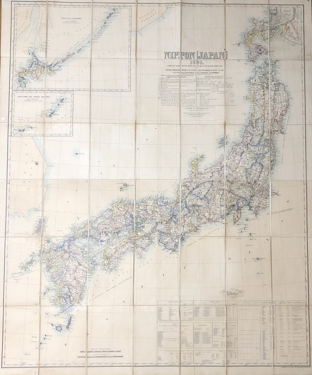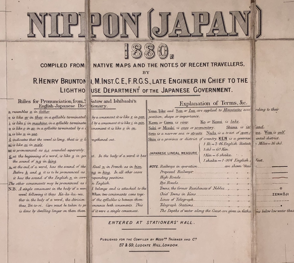 NIPPON [JAPAN] 1880. COMPILED FROM NATIVE MAPS AND THE NOTES OF RECEN TRAVELLERS, BY R. HENRY BRUNTON, M. INST. C. E., F.R.G.S., LATE ENGINEER IN CHIEF TO THE LIGHT HOUSE DEPARTMENT OF THE JAPANESE GOVERNMENT.