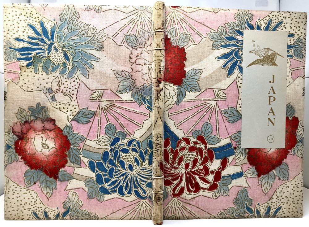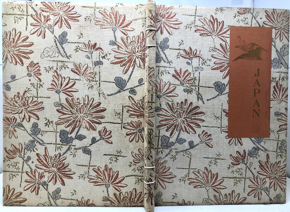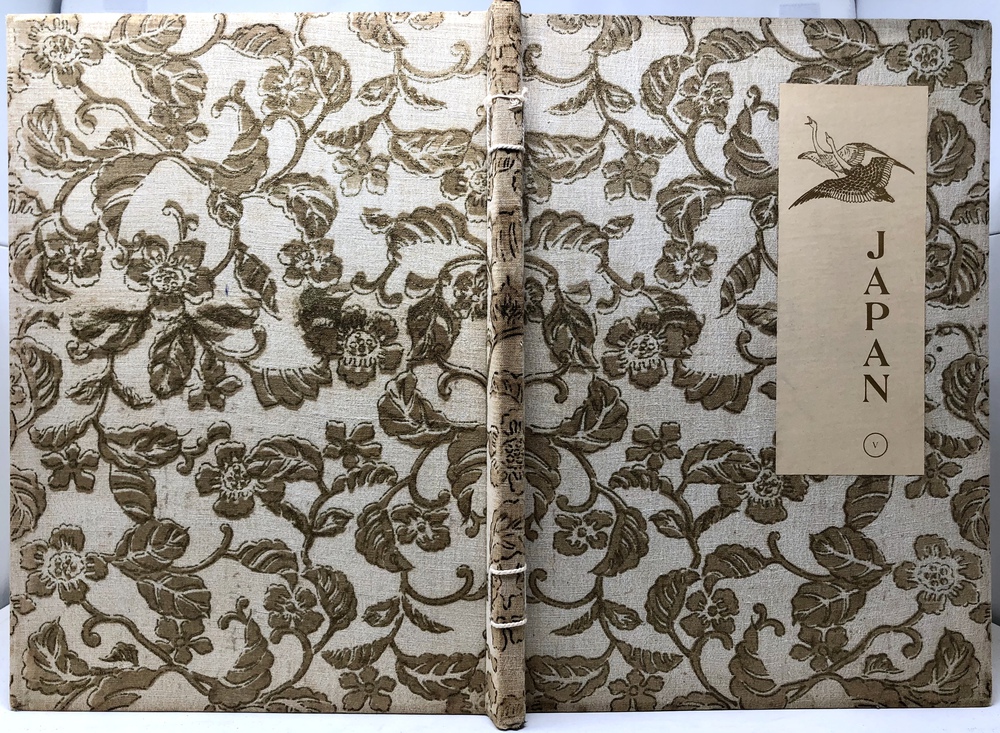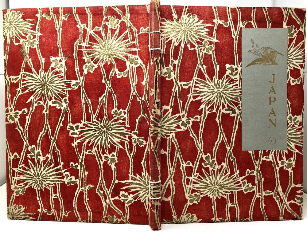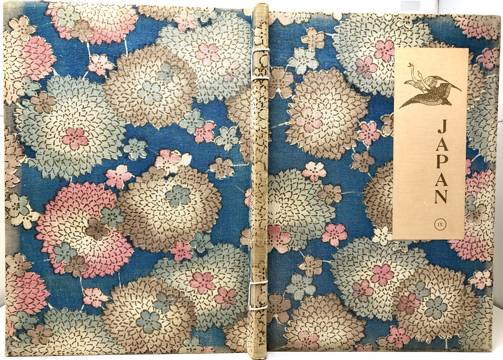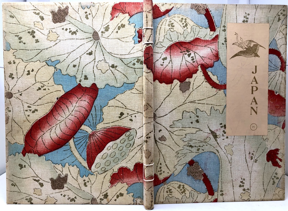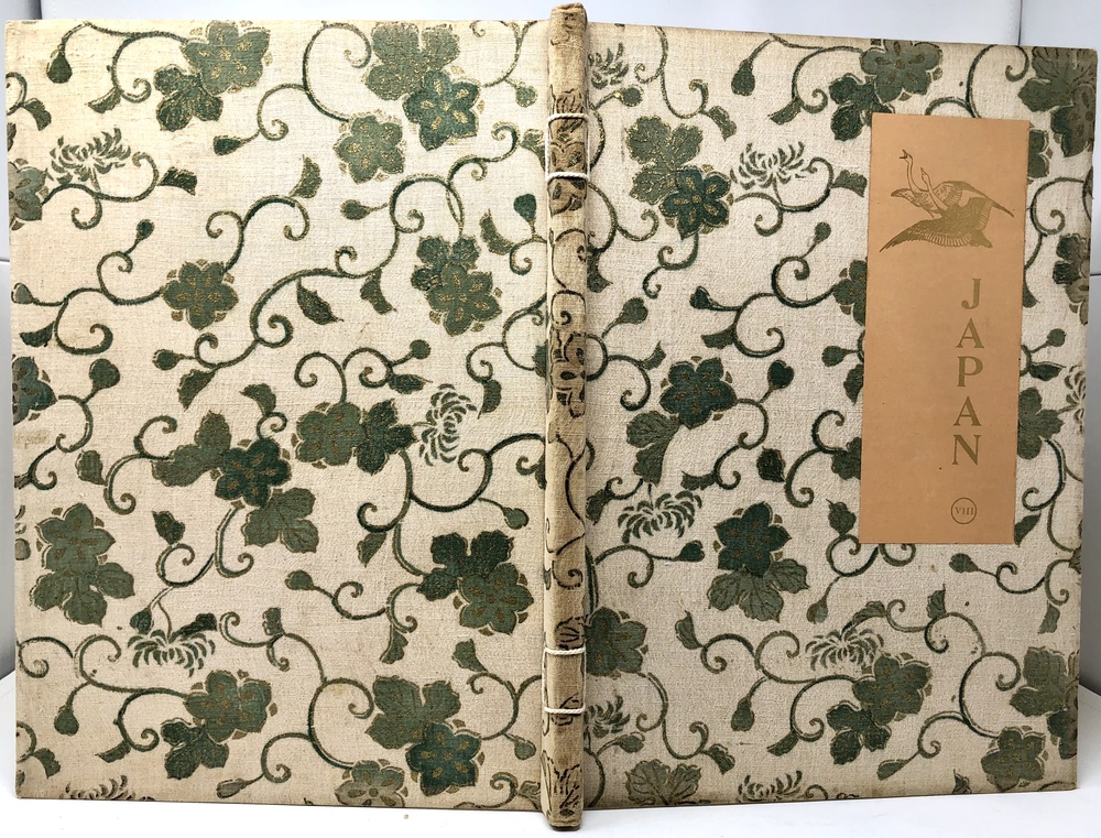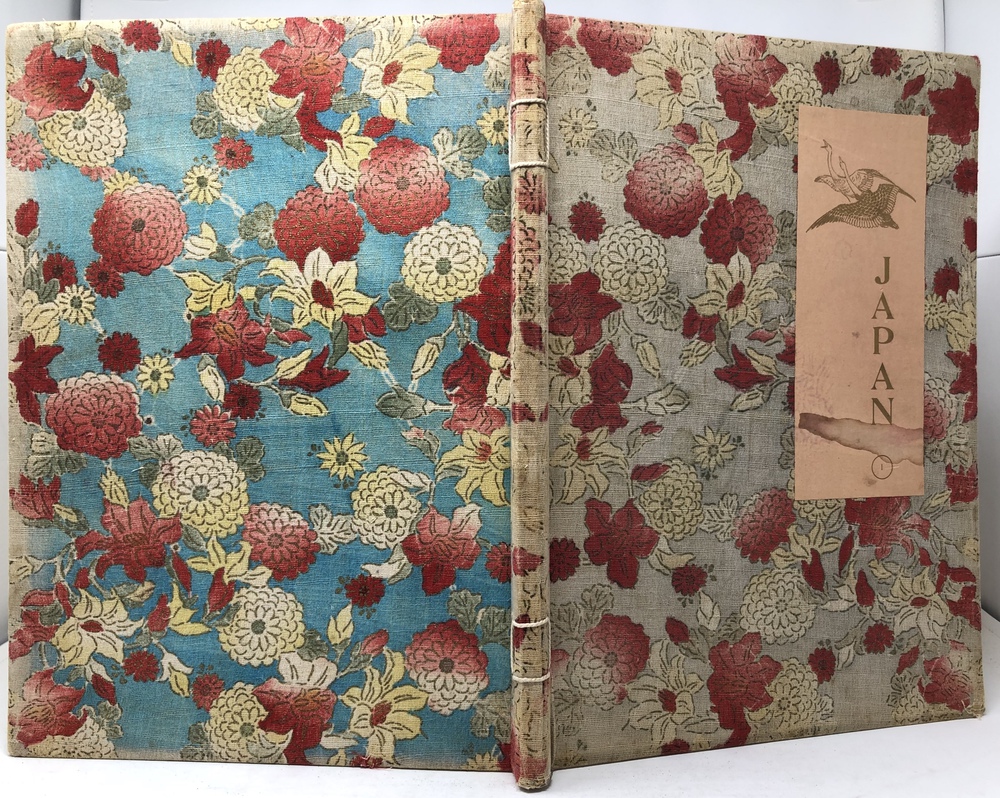 本書は、幕末に来日してから多方面に渡って活躍したイギリス人ブリンクリー(Francis Brinkley, 1841 - 1912)が編集したもので、日本の歴史、文化、現状などを紹介するテキストに加えて、30枚の大判手彩色写真、200枚近くの文中白黒写真、10枚の花々の口絵写真を収録しています。全10巻にわたって文字と視覚情報の双方で日本を紹介する内容で、来日以降一貫して親日的立場にあったことで知られるブリンクリーが精力を込めて日本の魅力を日本国外に発信しようとする強い意志が感じられる書物です。収録されている写真は明治初期を代表する写真家である日下部金兵衛の作品と考えられるものが大半を占めており、彼の作品の特徴で高い評価を受けていた、極めて質の高い彩色が施された写真は、当時の情景が眼前に浮かぶような魅力を備えています。各巻の口絵として収録されている様々な花の彩色写真は、おなじく当時を代表する写真家である小川一真の作品で、美術的な完成度の高い写真作品で著名であった小川の力量が存分に発揮された写真が本書を彩っています。また、本書は、長辺が40センチ近くにもなる極めて大型の書籍ですが、全10巻それぞれに全く異なる意匠の美しい布装丁が施されており、しかも和綴本の手法を用いて綴じるという大変に凝った造本がなされていて、工芸書物としても極めて高い完成度を有しています。本書は、「江戸版(Edo edition)」とされた限定1000部発行のうちの420番にあたるものですが、驚くべきことに、ブリンクリーは20前後ものの意匠の異なる限定版を出版しています。