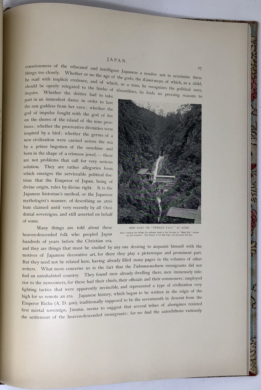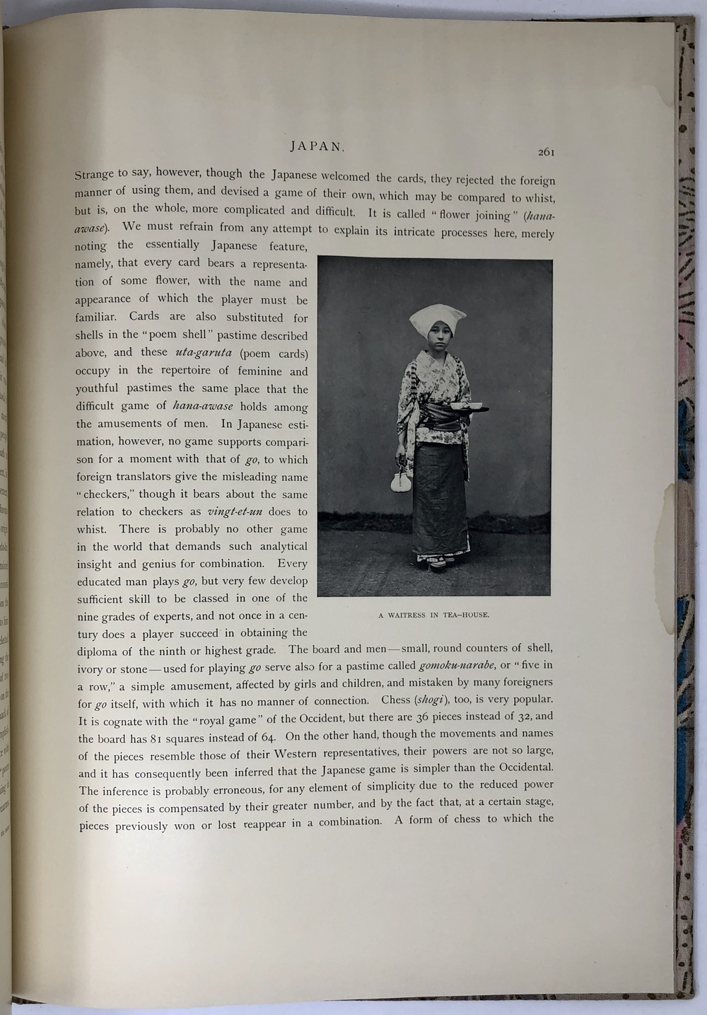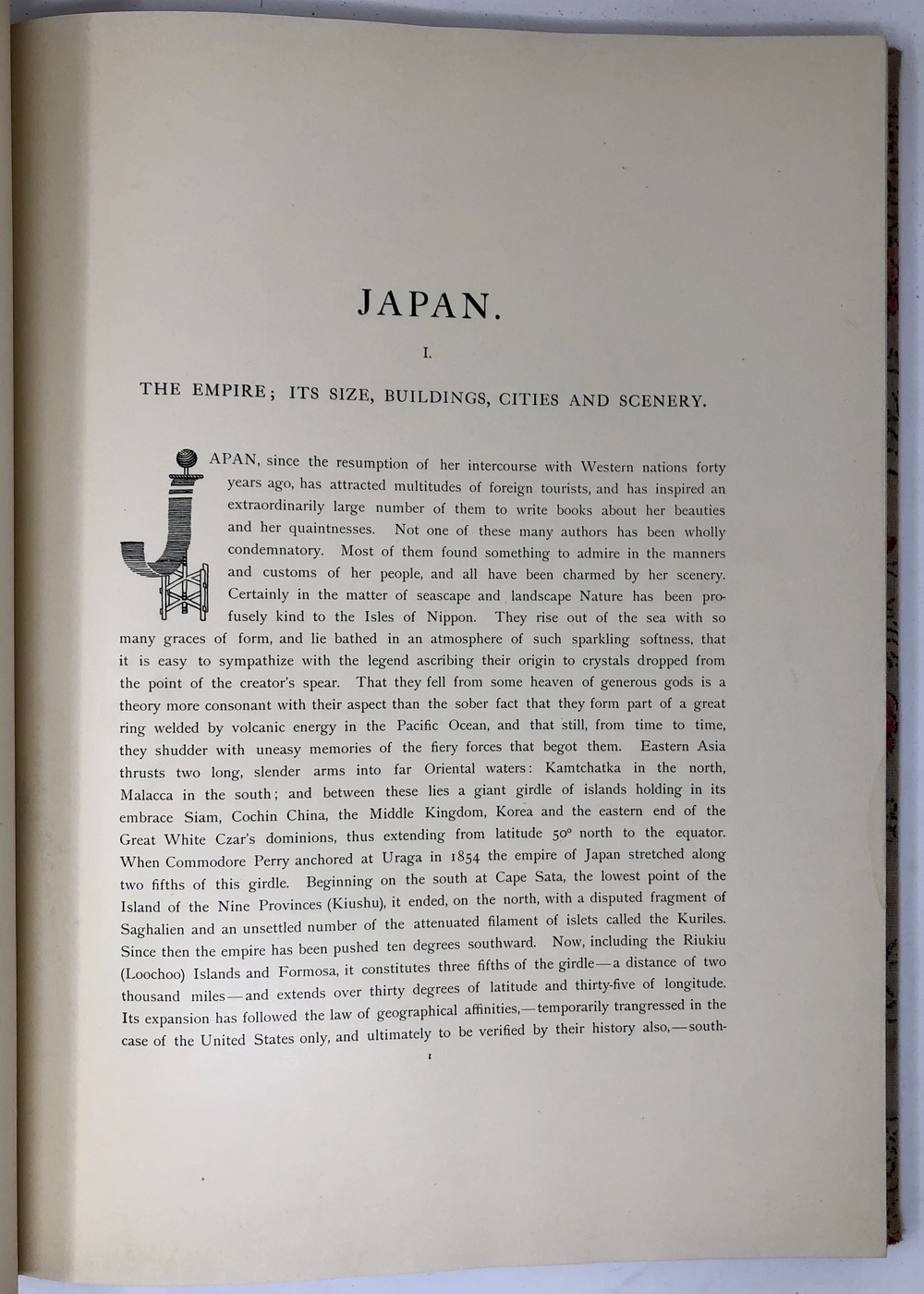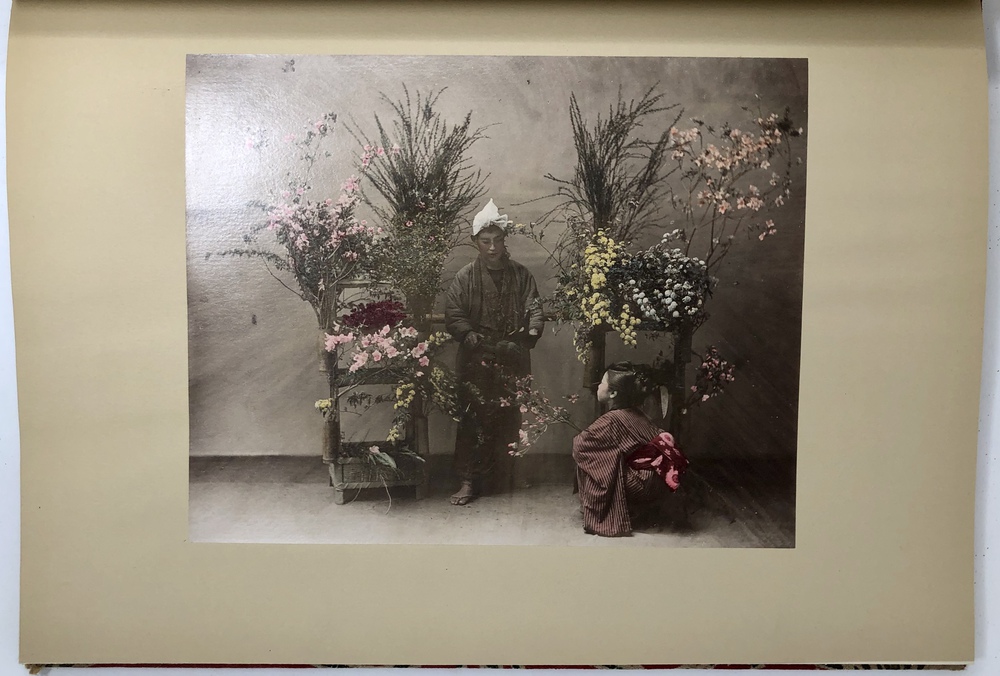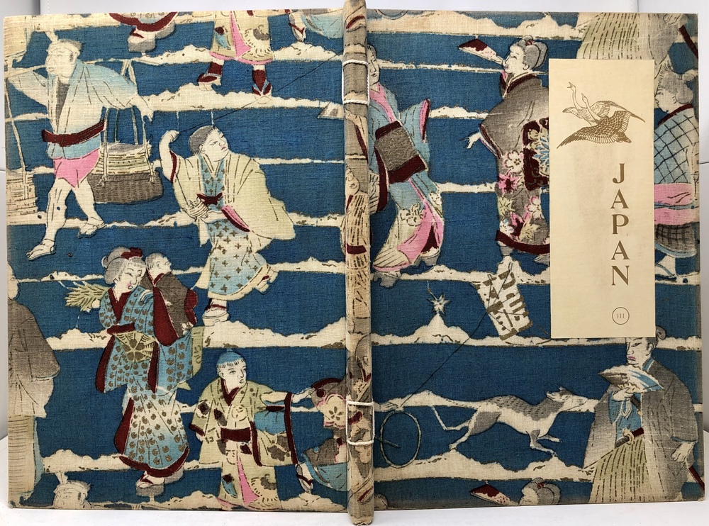 本書は、幕末に来日してから多方面に渡って活躍したイギリス人ブリンクリー(Francis Brinkley, 1841 - 1912)が編集したもので、日本の歴史、文化、現状などを紹介するテキストに加えて、30枚の大判手彩色写真、200枚近くの文中白黒写真、10枚の花々の口絵写真を収録しています。全10巻にわたって文字と視覚情報の双方で日本を紹介する内容で、来日以降一貫して親日的立場にあったことで知られるブリンクリーが精力を込めて日本の魅力を日本国外に発信しようとする強い意志が感じられる書物です。収録されている写真は明治初期を代表する写真家である日下部金兵衛の作品と考えられるものが大半を占めており、彼の作品の特徴で高い評価を受けていた、極めて質の高い彩色が施された写真は、当時の情景が眼前に浮かぶような魅力を備えています。各巻の口絵として収録されている様々な花の彩色写真は、おなじく当時を代表する写真家である小川一真の作品で、美術的な完成度の高い写真作品で著名であった小川の力量が存分に発揮された写真が本書を彩っています。また、本書は、長辺が40センチ近くにもなる極めて大型の書籍ですが、全10巻それぞれに全く異なる意匠の美しい布装丁が施されており、しかも和綴本の手法を用いて綴じるという大変に凝った造本がなされていて、工芸書物としても極めて高い完成度を有しています。本書は、「江戸版(Edo edition)」とされた限定1000部発行のうちの420番にあたるものですが、驚くべきことに、ブリンクリーは20前後ものの意匠の異なる限定版を出版しています。