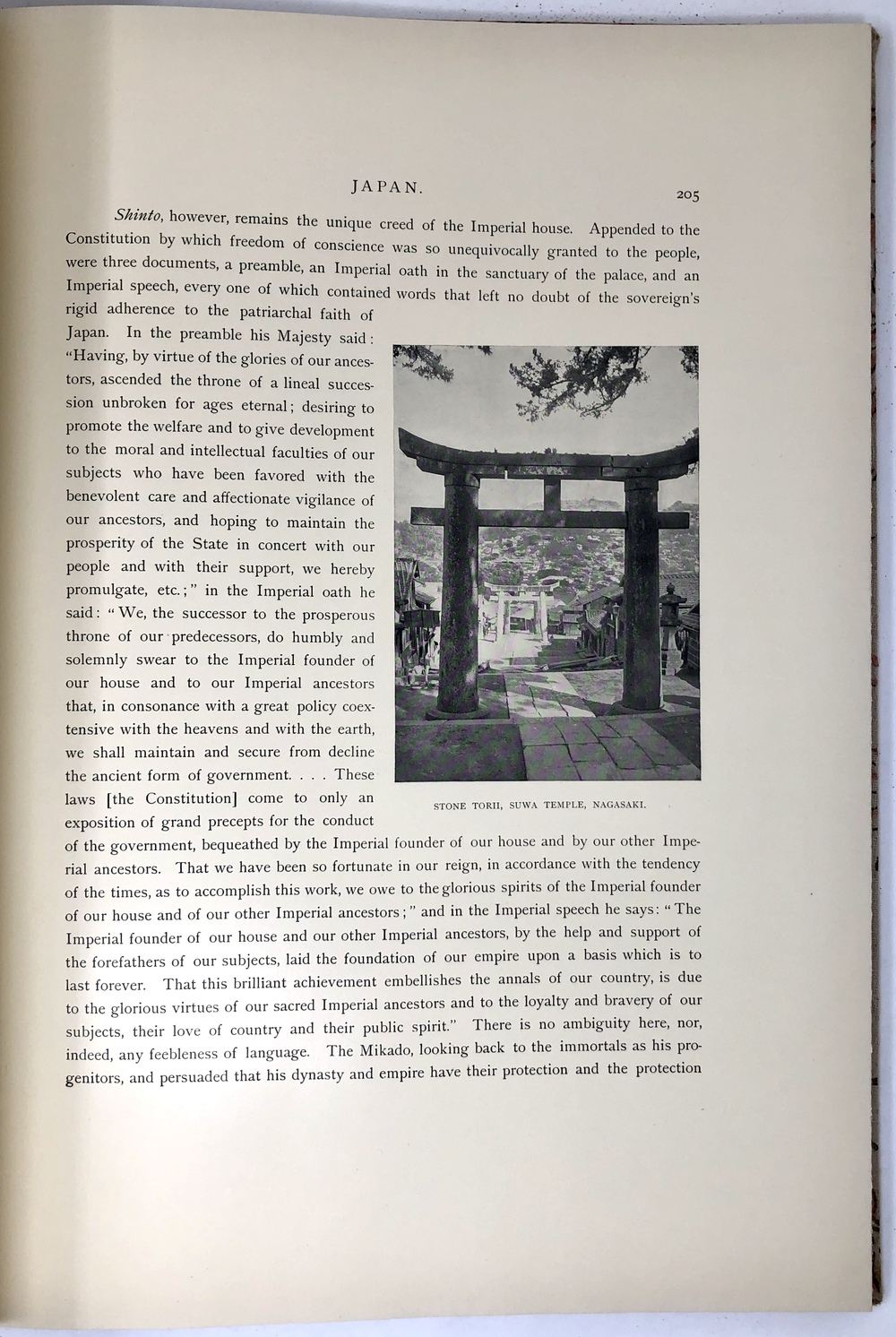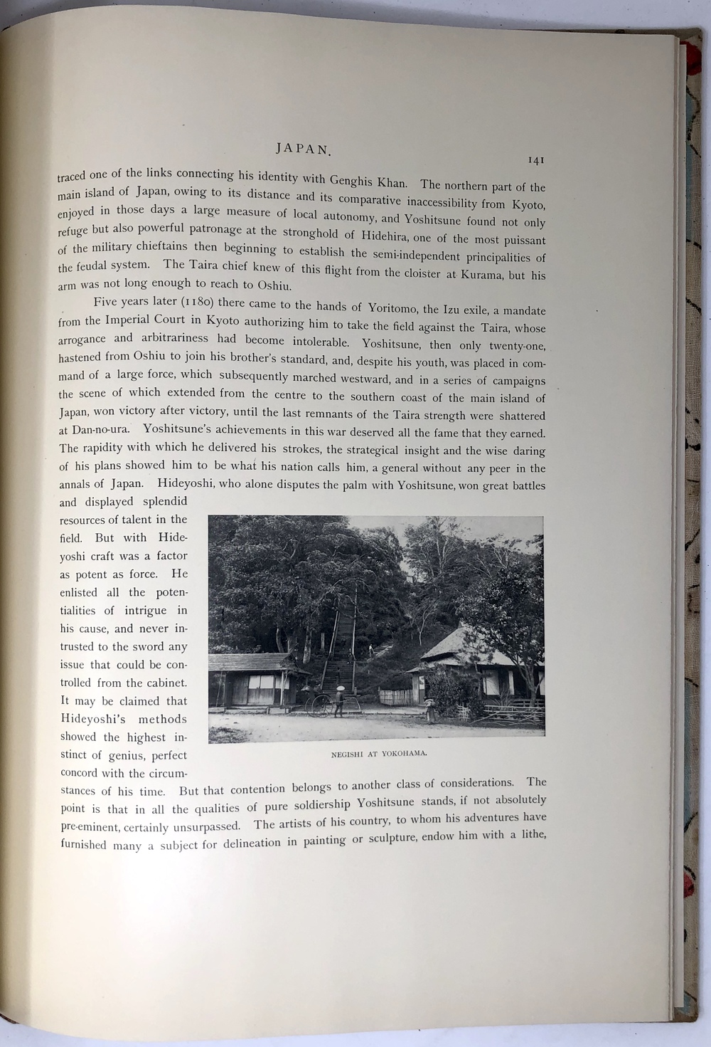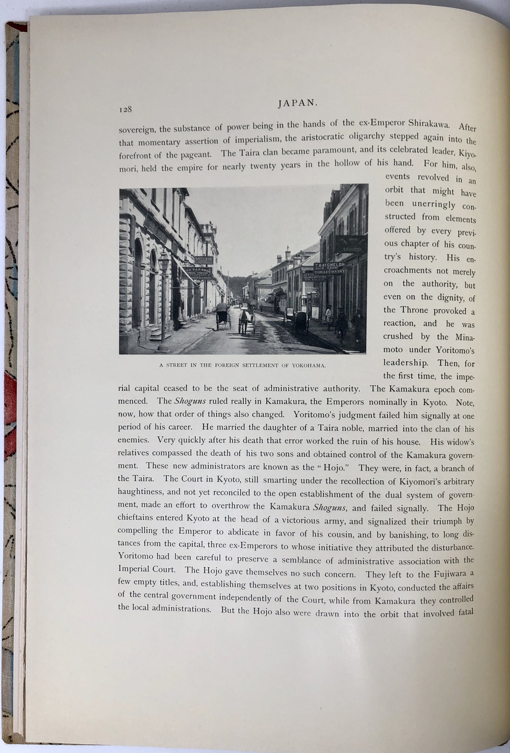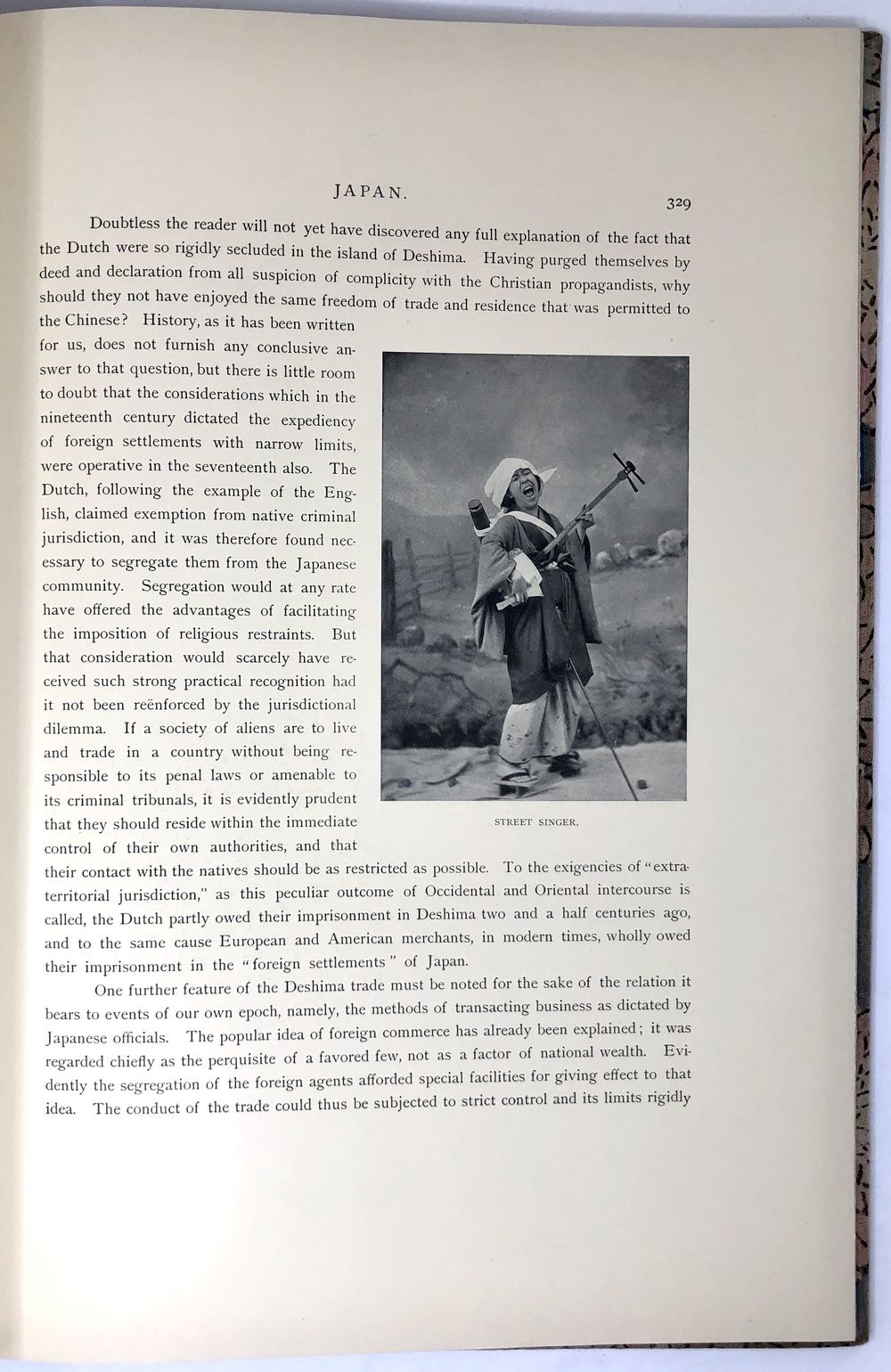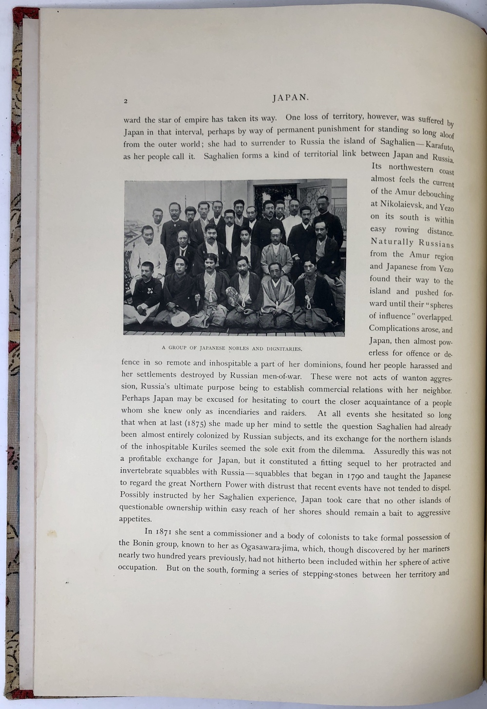 本書は、幕末に来日してから多方面に渡って活躍したイギリス人ブリンクリー(Francis Brinkley, 1841 - 1912)が編集したもので、日本の歴史、文化、現状などを紹介するテキストに加えて、30枚の大判手彩色写真、200枚近くの文中白黒写真、10枚の花々の口絵写真を収録しています。全10巻にわたって文字と視覚情報の双方で日本を紹介する内容で、来日以降一貫して親日的立場にあったことで知られるブリンクリーが精力を込めて日本の魅力を日本国外に発信しようとする強い意志が感じられる書物です。収録されている写真は明治初期を代表する写真家である日下部金兵衛の作品と考えられるものが大半を占めており、彼の作品の特徴で高い評価を受けていた、極めて質の高い彩色が施された写真は、当時の情景が眼前に浮かぶような魅力を備えています。各巻の口絵として収録されている様々な花の彩色写真は、おなじく当時を代表する写真家である小川一真の作品で、美術的な完成度の高い写真作品で著名であった小川の力量が存分に発揮された写真が本書を彩っています。また、本書は、長辺が40センチ近くにもなる極めて大型の書籍ですが、全10巻それぞれに全く異なる意匠の美しい布装丁が施されており、しかも和綴本の手法を用いて綴じるという大変に凝った造本がなされていて、工芸書物としても極めて高い完成度を有しています。本書は、「江戸版(Edo edition)」とされた限定1000部発行のうちの420番にあたるものですが、驚くべきことに、ブリンクリーは20前後ものの意匠の異なる限定版を出版しています。