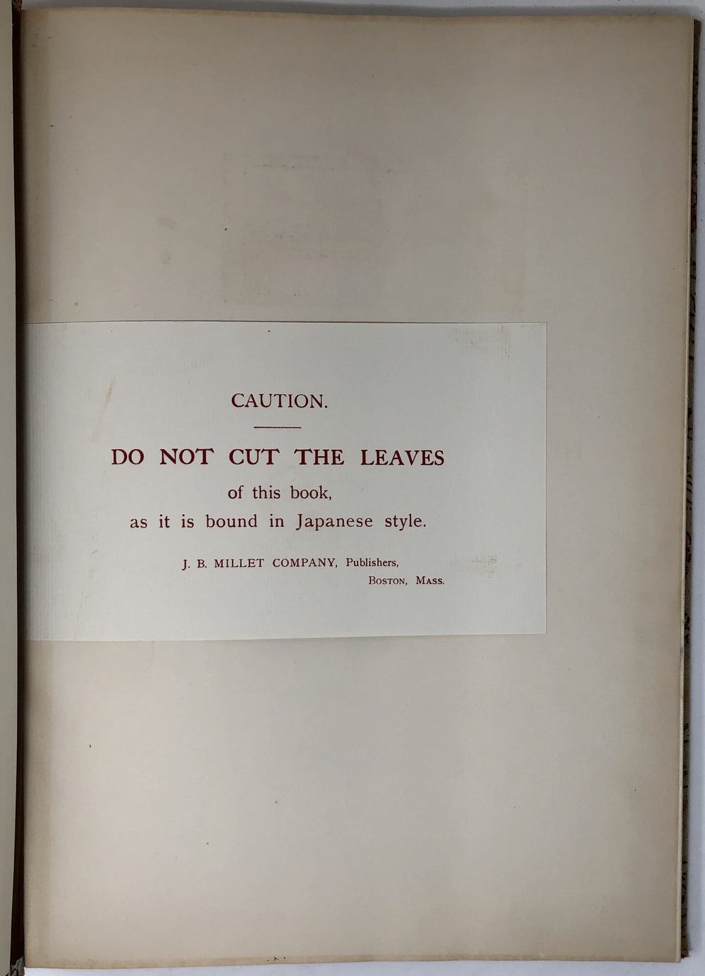 また、本書は造本においても大変凝った意匠が施されており、全10巻全てに異なる布張り装丁を施されているだけでなく、和綴本を模した製本がなされています。テキスト本紙も和本を模して、全て袋綴じの用紙が用いられており、購入者が誤ってそれを断ち切ってしまわないように注意する紙片が挟み込まれています。こうした造本における細部にわたる丁寧な仕上げは、ブリンクリーその人の美意識を忠実に反映しているものと思われます。