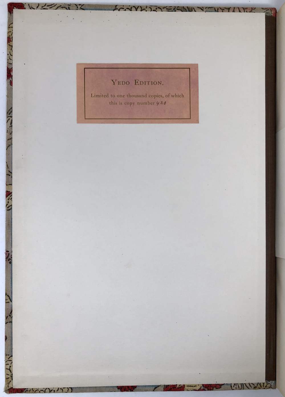 本書は、冒頭で触れたように、「江戸版」とされた限定1000部で発行されたバージョンのうち、420番にあたるもので、そのむねが第1巻に記載されています。驚くべきことブリンクリーは20前後(正確な数は不明)の異なる限定版を出版しており、その全てが異なる意匠となっているだけでなく、収録している写真にも相違があることが確認されています。本書に収録されている写真は、テキスト内容と対応するものではなく、全く任意に配置されているという不思議な構成を撮っていますが、それはこうしたさまざまなバリエーションに対応するためだったのではないかと思われます。本書について詳しく調べたアメリカの古書店人、George Baxley氏によると、少なくとも下記の限定版の存在が確認されているそうです。