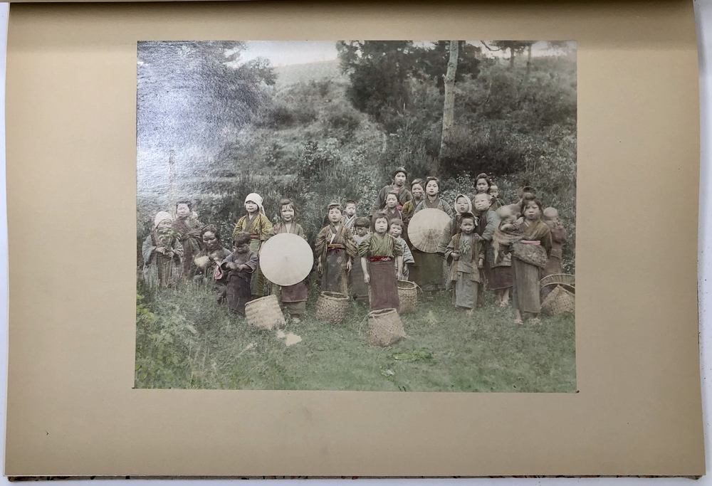 こうしたテキストを彩るのが、先に述べたような、30枚の大判手彩色写真と195枚の白黒写真、10枚の口絵彩色写真で、これらの写真が本書の魅力を大いに高めています。写真の構図や被写体から見て、30枚の大判手彩色写真と195枚の白黒写真を作成したのは、日下部金兵衛であると思われ、明治初期の日本人写真家として極めて高い評価を受けている彼の美しい写真がテキストに散りばめられています。日下部金兵衛は、幕末に来日した外国人写真家の代表的存在であるベアト(Felice Beato, 1832 - 1909)のもとで写真技術を習得し、1880年前後に独立して自身の写真館を横浜で開業しました。「KIMBEI」の名を冠した写真作品は特に外国人の間で非常に好評を博し、個別の写真販売だけでなく、横浜や、神戸、風俗といったように地域やテーマに応じた写真集を蒔絵仕立てのアルバムとしても販売しています。日下部金兵衛の作品は、すぐれた撮影技術に裏打ちされていること加えて、当時の写真の出来栄え、魅力を大きく左右する手彩色の水準が、非常に秀でていたことが知られています。