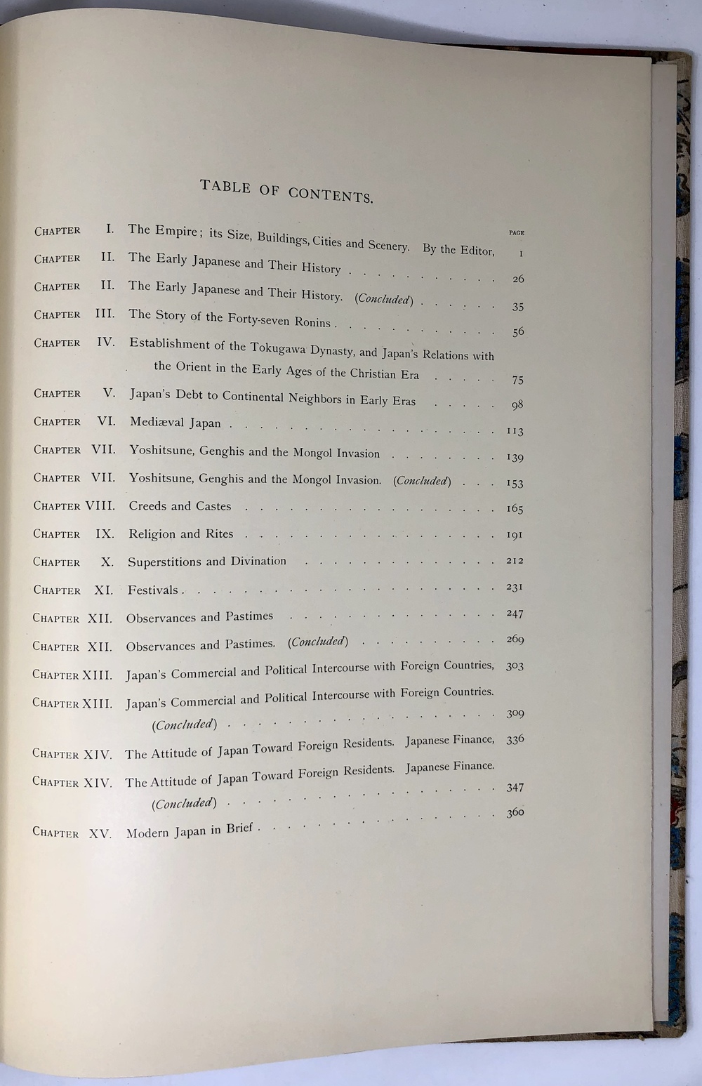 本書は、こうした長期間にわたる濃密な滞日経験と、そこで培われた日本文化と歴史への深い見識を備えていたブリンクリーが、自身の持てる全てを注ぎ込んで刊行した渾身の「日本論」と言えるものです。全15章からなるテキストを全10巻に収める構成で、各章は次のようになっています。