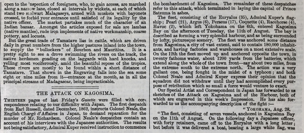 本書では、生麦事件にたいする幕府の賠償金支払いや、1863年の長州藩によるアメリカ・フランス・オランダ船に対する砲撃(いわゆる攘夷戦)、薩英戦争に関する日本関係記事が多く見られます。攘夷戦や薩英戦争関係記事では、長州から砲撃を受けるオランダ船(メデューサ号)を描いた図や、薩英戦争に望むイギリス艦隊を描いた図、戦闘の推移を示した鹿児島湾地図など、これらの事件を理解する上で大きく役立つ視覚資料も数多く収録されています。また、こうした時事問題に関する記事だけでなく、ソンダース(Willam Sauders, ? - 1893)が撮影した横浜のパノラマ写真をもとにして描かれた、見開き大の大きな横浜市街図や、出島図とともに掲載された出島についての論考記事、ワーグマンによる横浜を中心とした居留地民の日常の出来事などといった幕末の日本に関する多方面にわたる記事も収録されています。