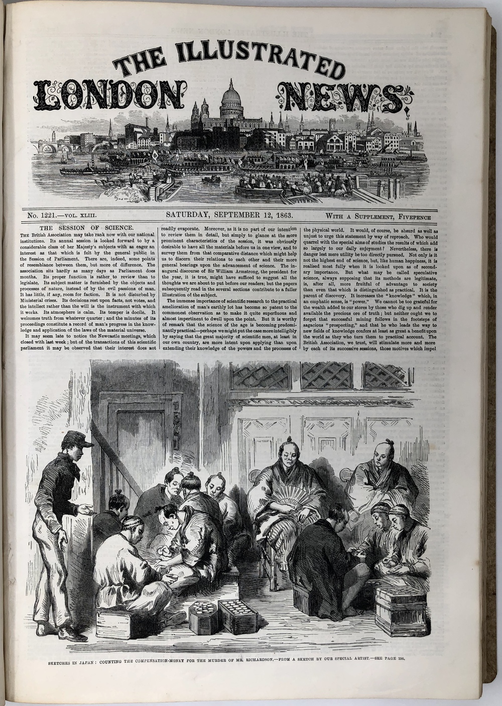 11. No.1221: Saturday, September 12, 1863. (pp.253-276)*賠償金検算の様子を描いた図を含むワーグマンによる日本特集通信記事(6月28日付)見開き大横浜市街図ほか日本関係記事を多数収録