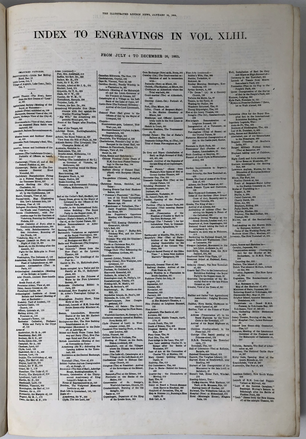『イラストレイティッド・ロンドン・ニュース』は、1842年にロンドンで創刊された週刊誌で、その名の通り、イラストをふんだんに盛り込んだ独自の編集方針によって大成功を収め、視覚情報を重視したメディアの先駆けとなりました。同誌は世界中に特配員を派遣したほか、各国政府、公使館、領事館筋の情報をいち早く入手することで、世界各地の最新情報を読者に提供したことでも知られており、自宅にいながらにして最新の世界情勢を精細な図版とともに得ることができる画期的なメディアとして、当時のヨーロッパにおける情報流通の様相を大きく変容させたと言われています。