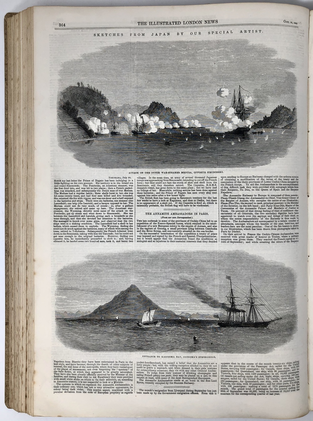 本書は、絵入り週刊誌の先駆けとして名高い『イラストレイテッド・ロンドン・ニュース』のうち、1863年6月から12月にかけて刊行された27号分を1冊にまとめて合冊したものです。1863年の下関攘夷戦や、薩英戦争に関する速報をはじめとして、特派員ワーグマン(Charles Wirgman, 1832 – 1891)による日本関係記事が豊富に収録されており、同時代のイギリスで発行された最大手週刊誌における日本情報の伝播状況を理解する上で欠かせない文献資料です。