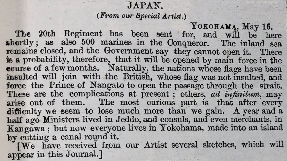 また、同誌は、ワーグマンを特派員として採用していたことから、彼の特派員通信にもとづいた最新の日本情報と、さまざまな挿絵が多くの号に掲載されていることで、同時代の欧文日本研究資料としても高く評価されています。画家でもあったワーグマンは、友人の写真家でもあったベアト(Felice Beato, 1832 - 1909)の写真をもとにして描いた数多くの挿絵を記事ととも同誌に提供しており、そのおかげで、同誌に掲載される日本関係記事の多くは、優れたイラストとともに掲載されています。